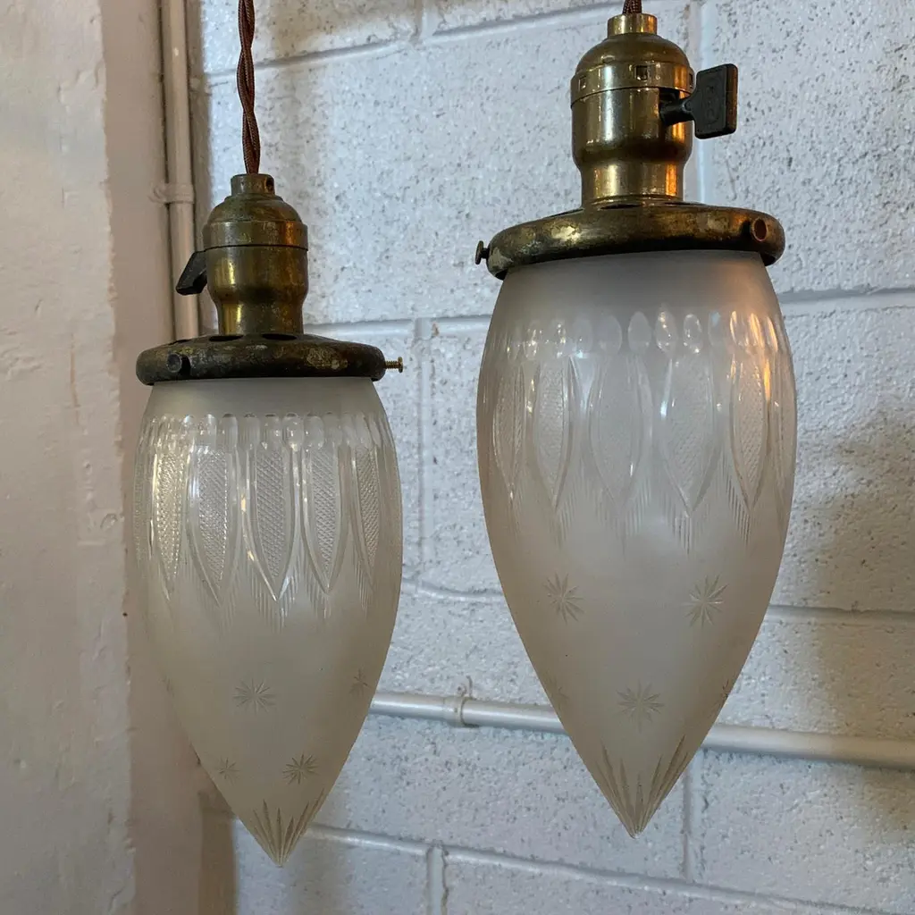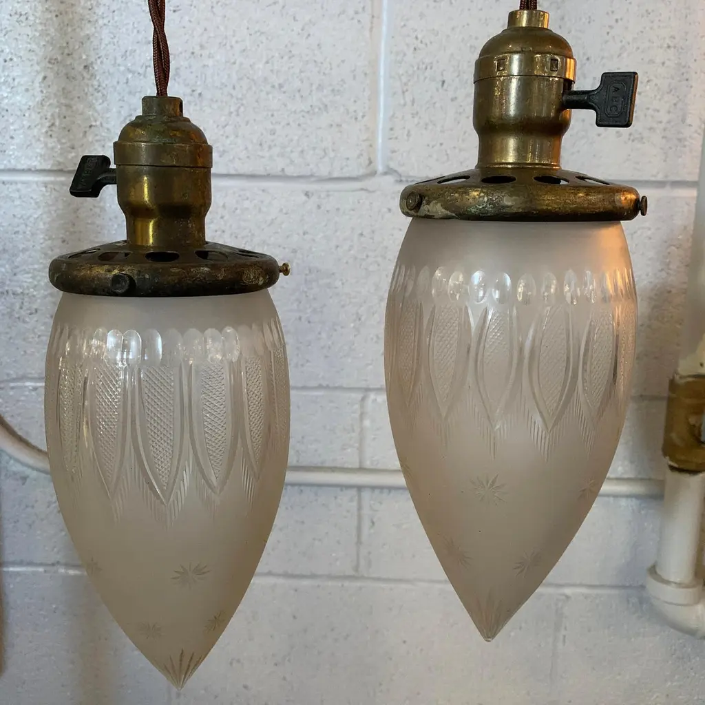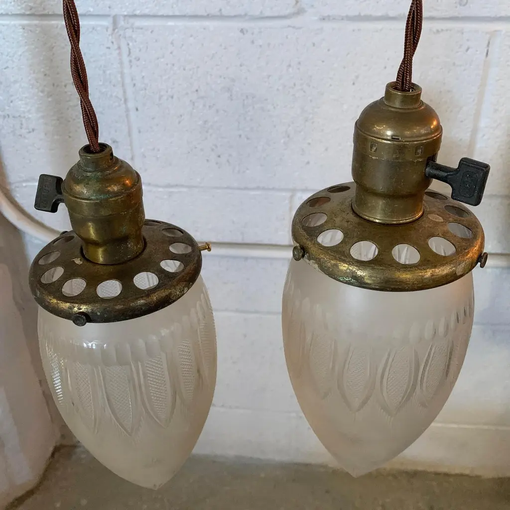 Antique, industrial pendant light features a late 19th century, etched glass, teardrop-shaped shade with brass switch fitter. The pendant is newly wired with 40 inches of braided cloth cord to accept up to a 75 watt bulb. Sold individually, 5 available.