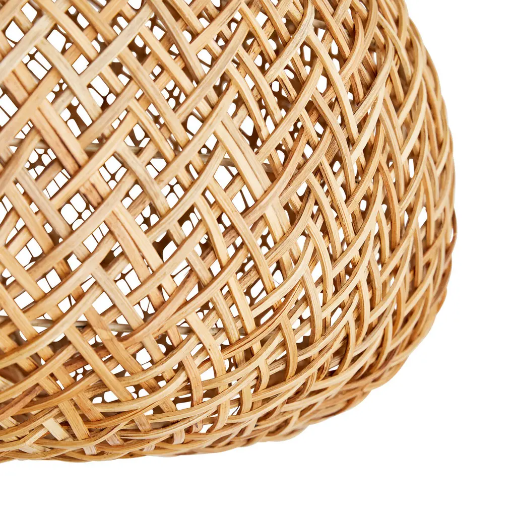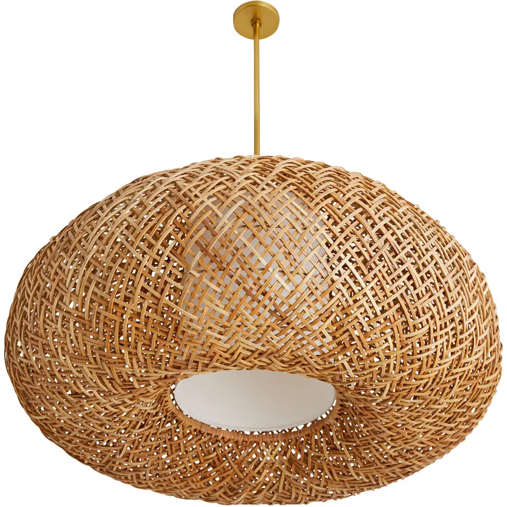 Relish in the craftsmanship of rattan with this wildly organic pendant. Thick strips of natural rattan are woven in a manner that the bottom rounds inward, creating a visual that the outer shade is being lifted into itself. An inner white linen shade rests inside, helping to diffuse the light and offer a soft glow to its surroundings. Though large in scale, this piece showcases a low profile which makes it an ideal statement piece for smaller spaces. Finish will vary. Additional pipe available (PIPE-101).