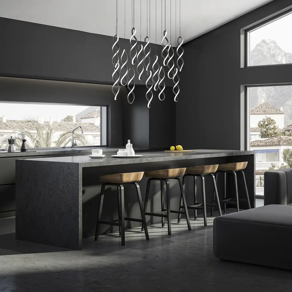 Showers of light. Delicate bands of soft LED illumination weave playfully in a downward flowing motion from its geometric canopy above.