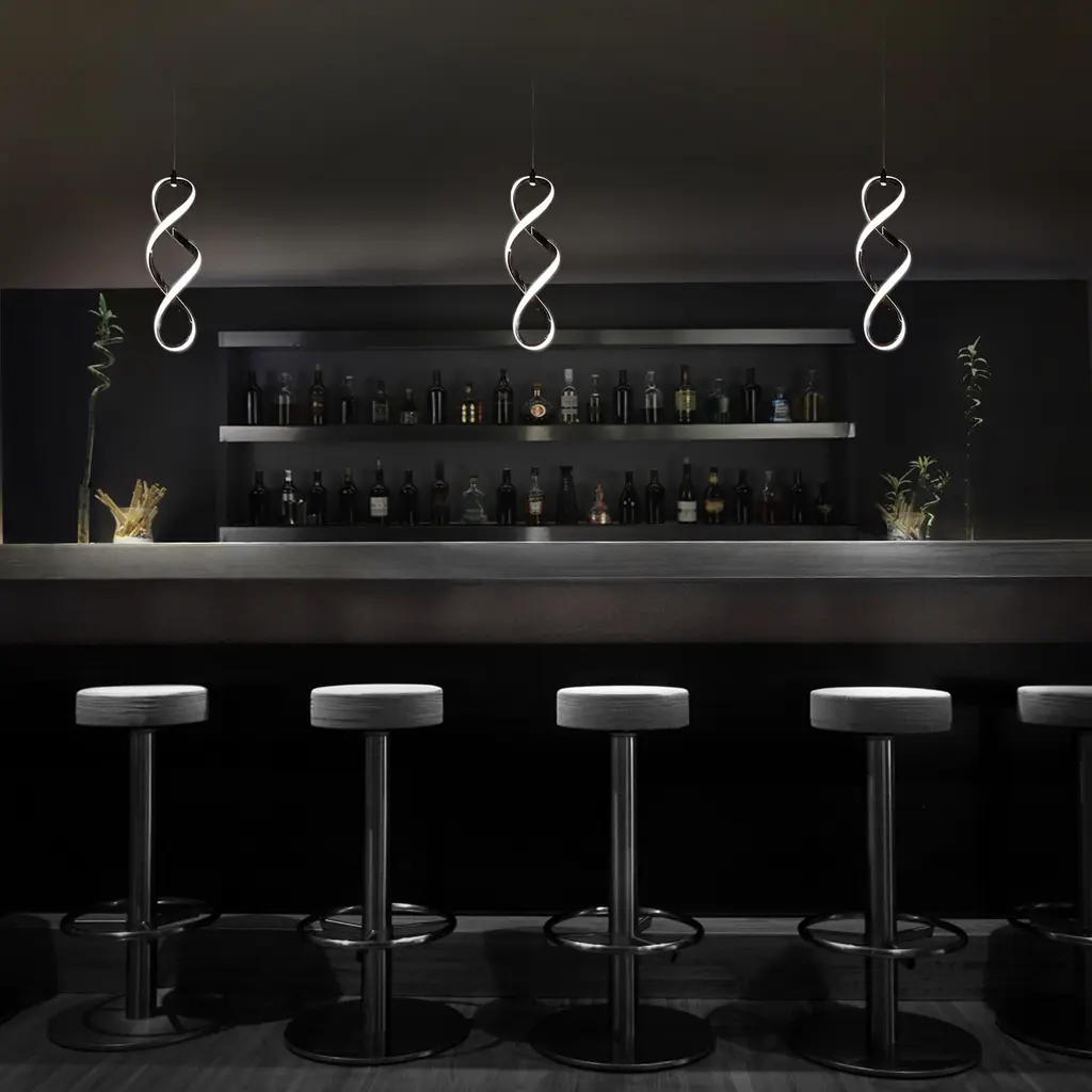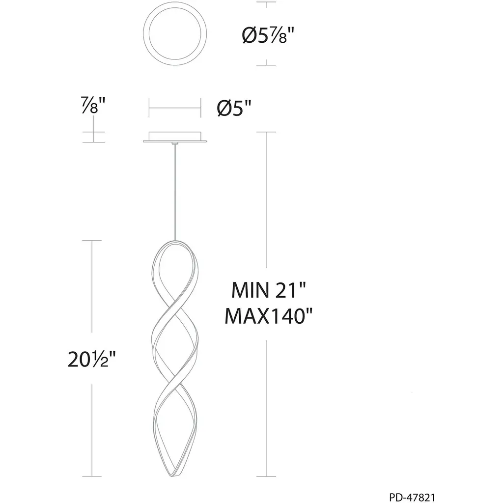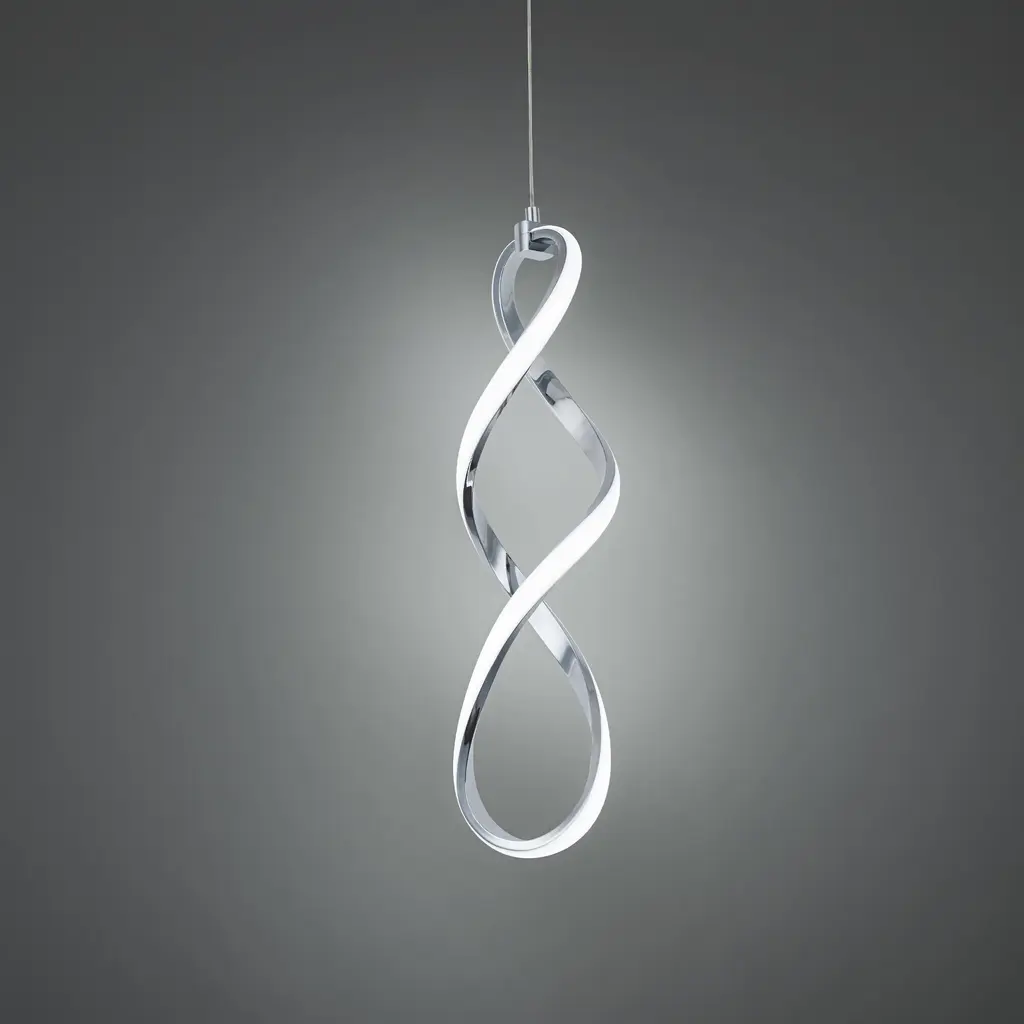 A fascinating lighting design creating an awe-inspiring, complex structure of light. Interlace has a unique, helical shape at 21 inches in length, allowing for omni directional illumination, softened by a silicone diffuser. Adjust the height freely using the adjustable, powered aircraft cables attached to a quick spin canopy in a chrome finish for a clean modern look. Delightful swirls and curves interplay radiantly. Interlace is a stunning free form sculpture of light. Energy efficient integrated LED's provide a long-lasting maintenance-free bright and even illumination.