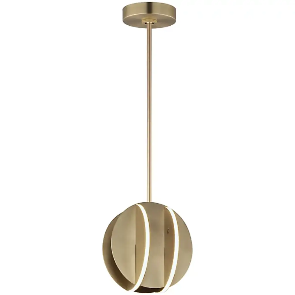 Descending gracefully from a circular canopy along a central stem, the Interval LED Mini Sphere Pendant by ET2 Lighting presents intersecting stainless steel panels forming spherical shapes, radiantly illuminated by double raceways of dedicated LED light strips. A supplementary LED light source beams light downwards, enhancing its illumination. Accentuated by a brushed metal finish, these sculptural lighting fixtures seamlessly blend into architectural settings, offering aesthetic charm and practical illumination. Crafted from aluminum with acrylic shade material, they epitomize contemporary style, making them ideal additions to modern interiors seeking sophistication and functionality.