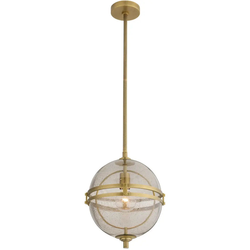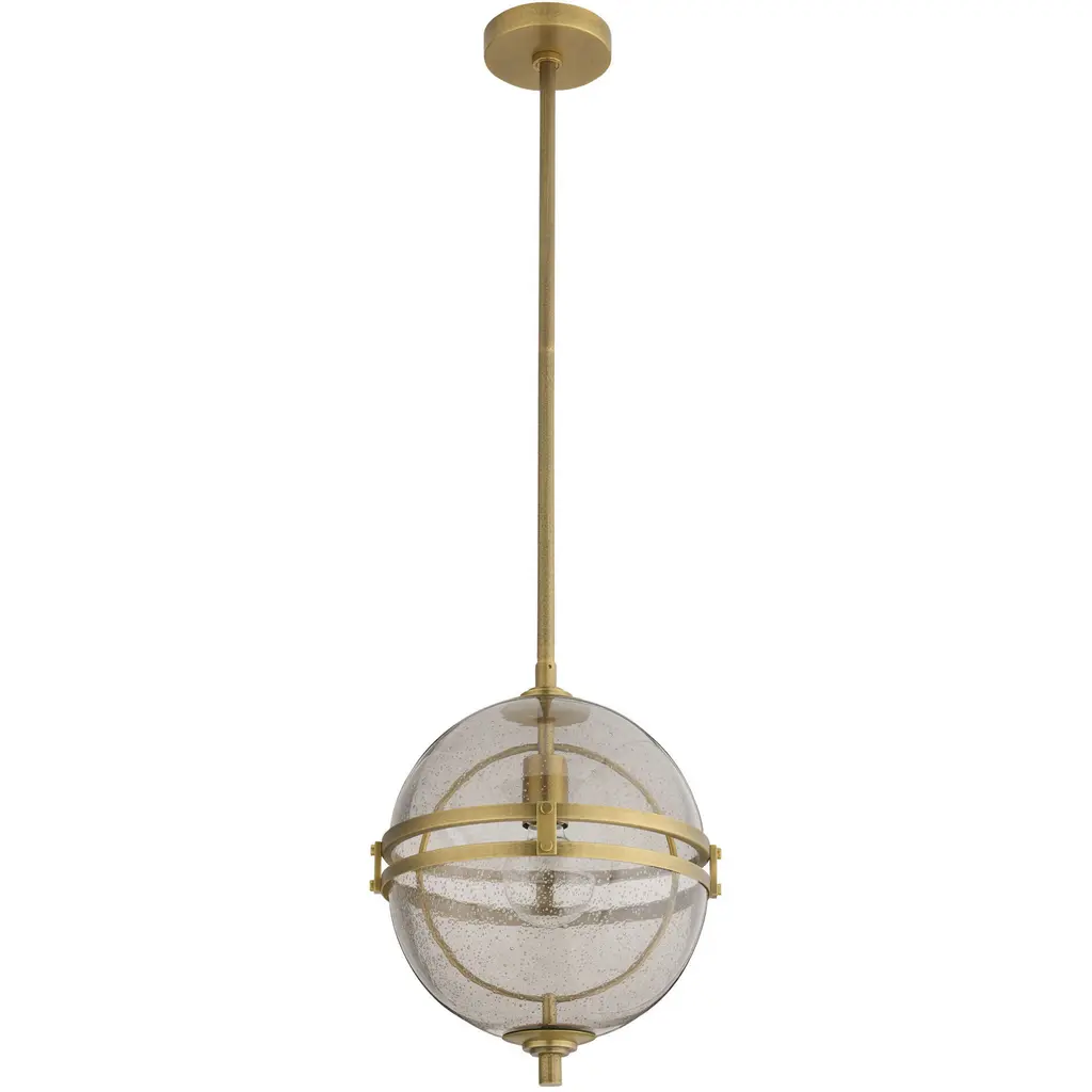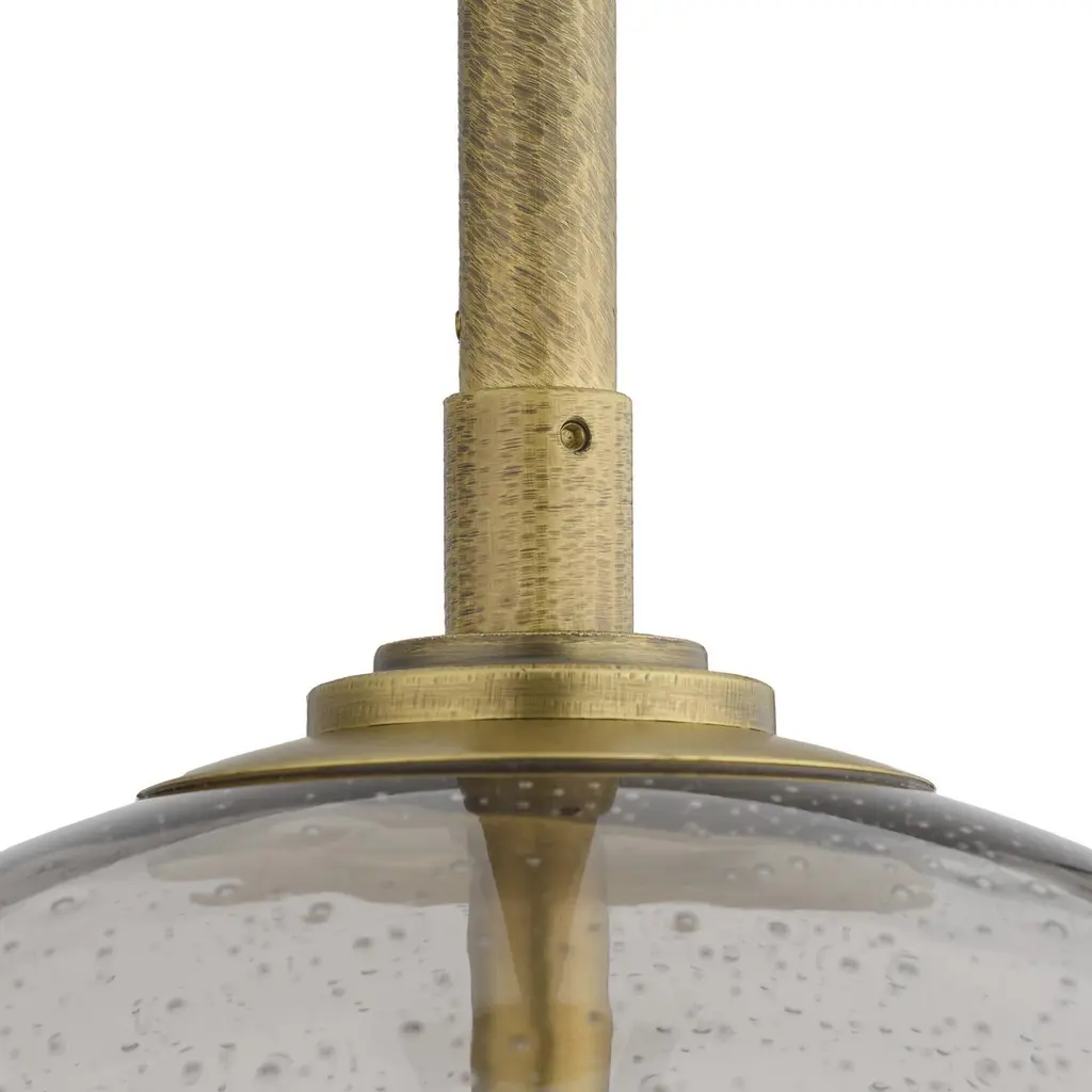 A globe of smoke seedy glass is an updated twist on neo-classical design. Clasped in a framework of antique brass-plated steel, the globe surrounds a floating circle of chattered antique brass that seemingly floats within its waterline design. Subtle bubbles add texture to the finish, and a tiered brass accent adorns the center. Finish will vary. Damp-rated, although limited covered outdoor conditions may affect finish.