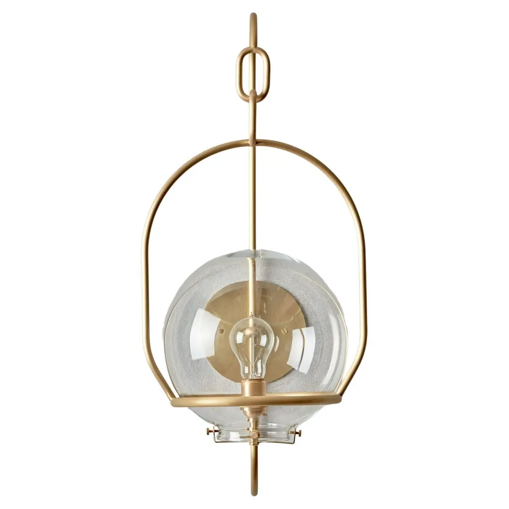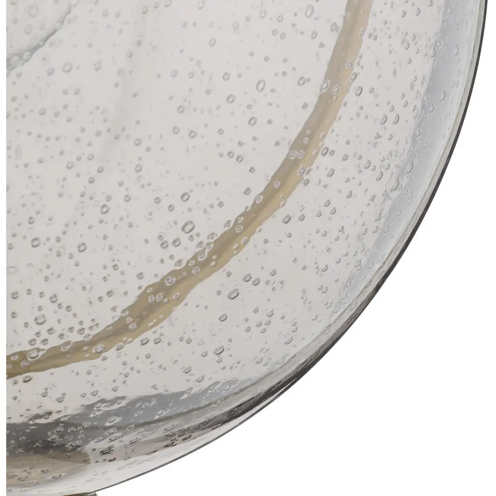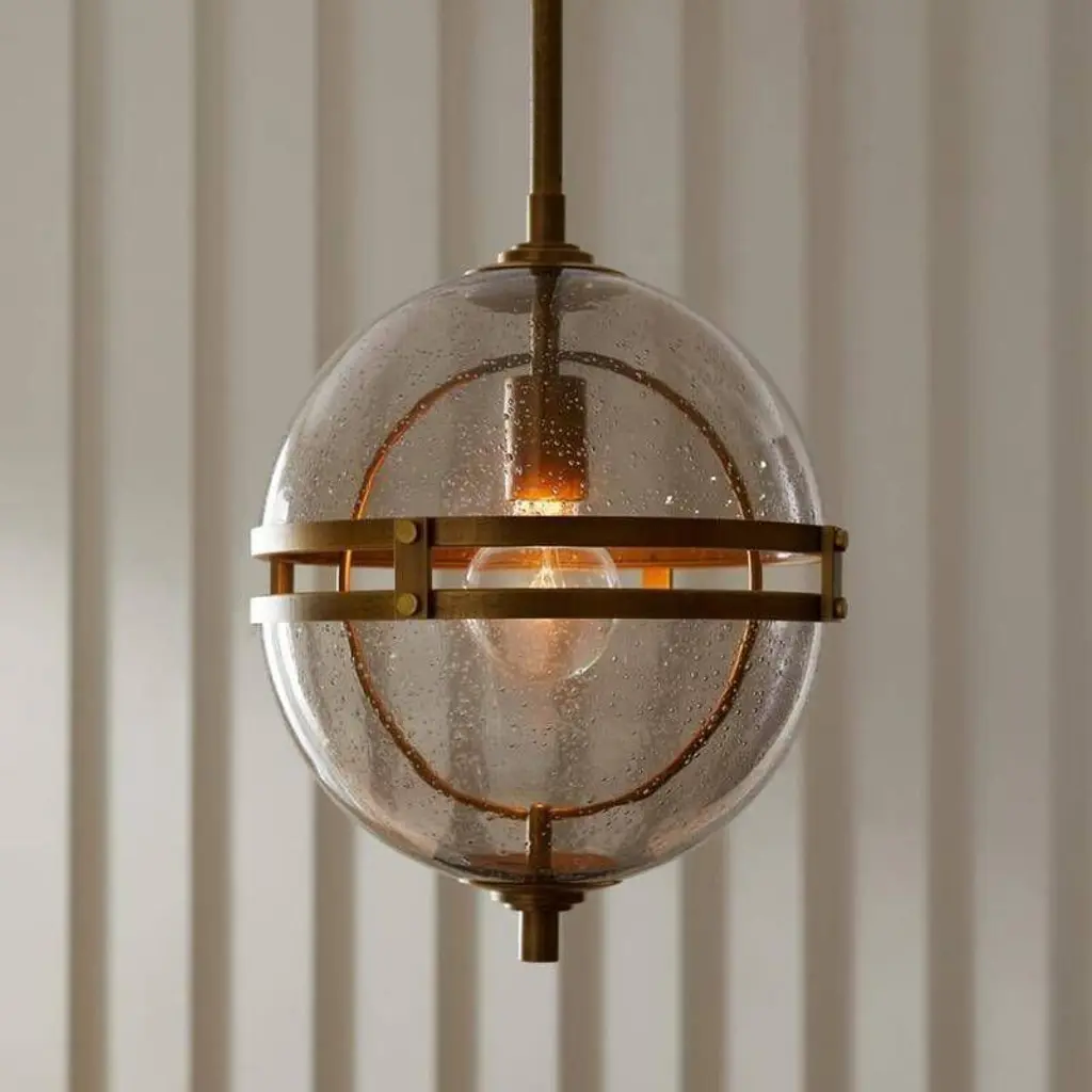 A globe of smoke seedy glass is an updated twist on neo-classical design. Clasped in a framework of antique brass-plated steel, the globe surrounds a floating circle of chattered antique brass that seemingly floats within its waterline design. Subtle bubbles add texture to the finish, and a tiered brass accent adorns the center. Finish will vary. Damp-rated, although limited covered outdoor conditions may affect finish.