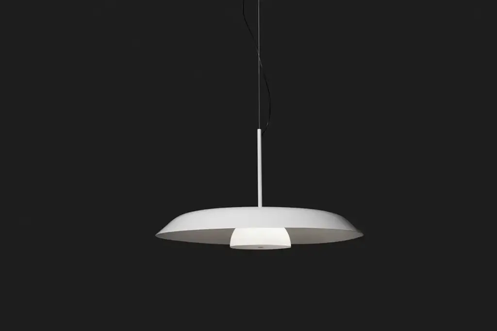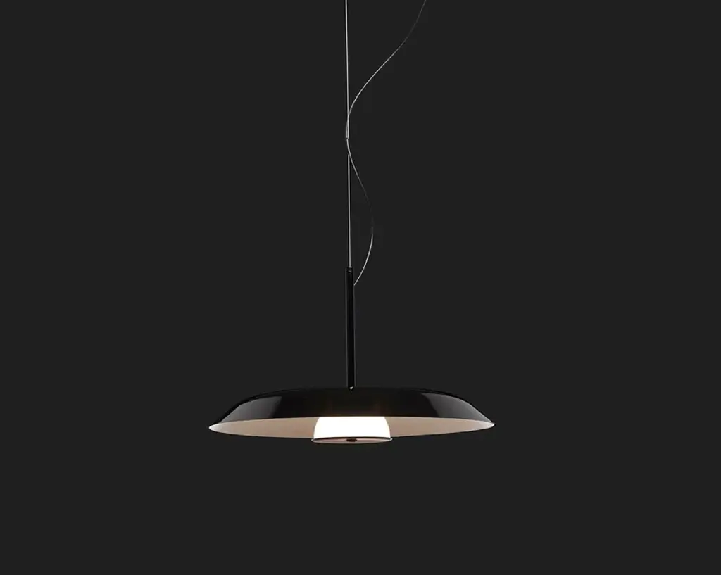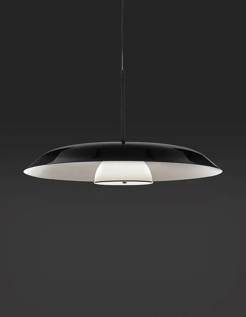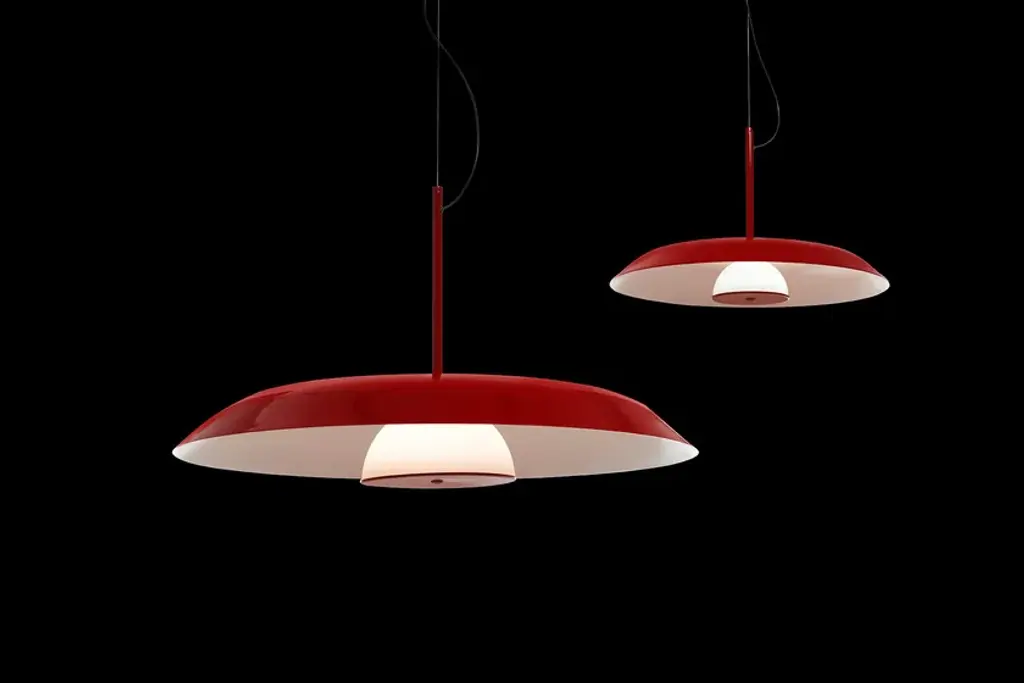 A partnership was established with Bellucci Mazzoni Progetti, two Sienese designers focused on interior and product design, who have designed a collection of suspended lamps for Oluce which have essential lines and are made entirely of metal. With its soft light and low-profile silhouette, Iride is a lamp that renews the archetypal form of dome lighting using a contemporary language. Two suspended lamps with different sizes for a chosen and sought-after lighting effect that gives the lamp harmony, ensuring uniform diffusion and visual comfort within rooms. The central opaline glass diffuser becomes an element with personality, drawing the stylised shape of a drop in the centre of the minimalist dome on which it rests. The light diffuses due to the lampshade reflection and comes out softened. An interior lamp designed for homes, Iride is available in a total white version or in two colours: reflective white inside, black or glossy red outside.Iris 8781 x max 11W (LED)2700°K 1600 lm CRI>85Materials: Metal / GlassFinishes: Glossy White - Glossy Black - Scarlet RedIris 8791 x max 21W (LED)2700°K 3000 lm CRI>85Materials: Metal / GlassFinishes: Glossy White - Glossy Black - Scarlet Red
