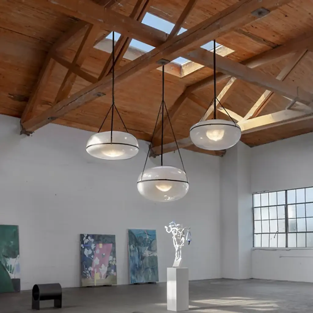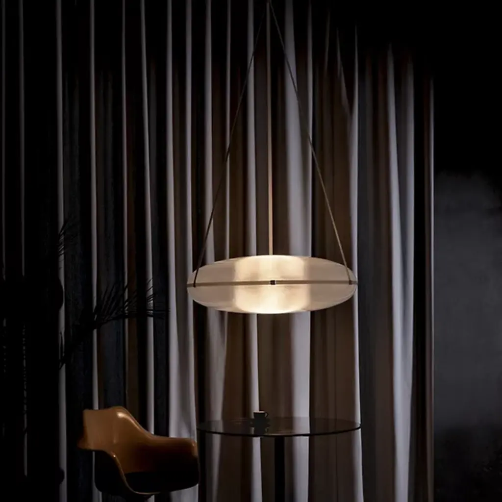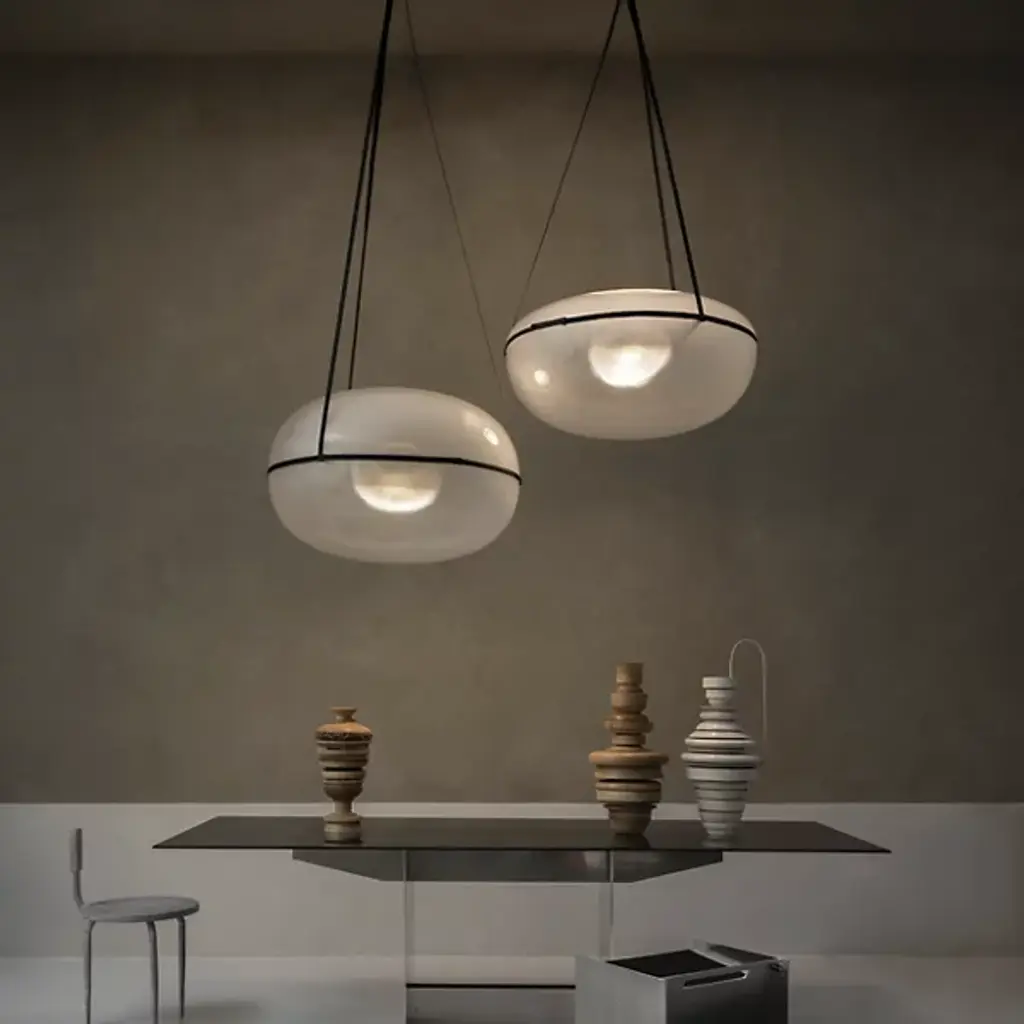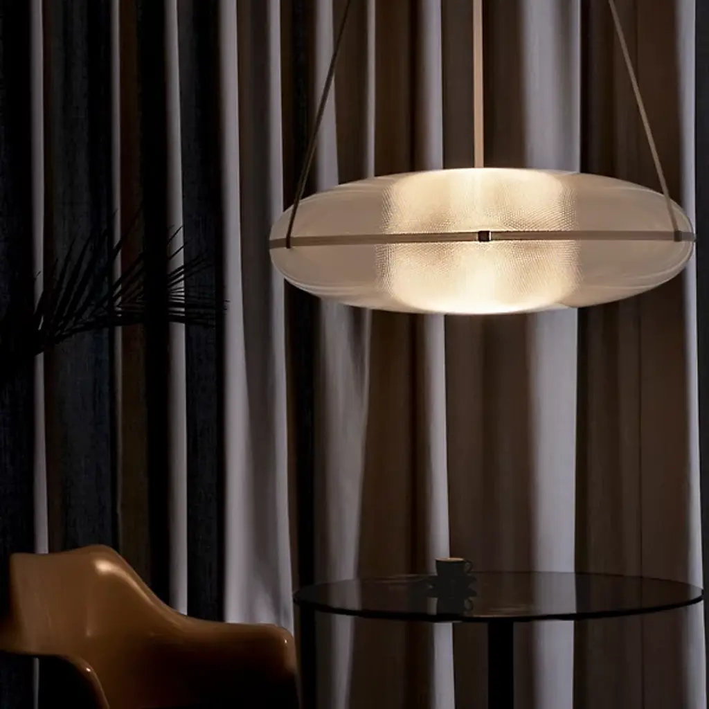 Transform your interiors with the ephemeral and elegant lines of the Iris LED Pendant from A-N-D. An enigmatic design from the mind of Caine Heintzman, it descends from a circular canopy via a slim, strong aluminum stem and curving bracing, supporting bright and energy-friendly lamping inside a voluminous acrylic shade, the captivating elliptical shape transmitting a hazy, opulent warmth to all sides, transforming its surroundings with an elegant, expressive visual lightness matched with a vibrant character.