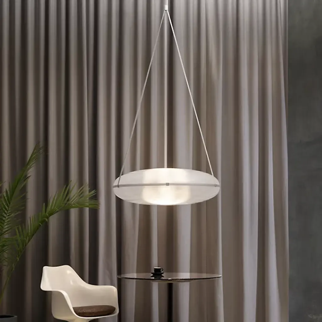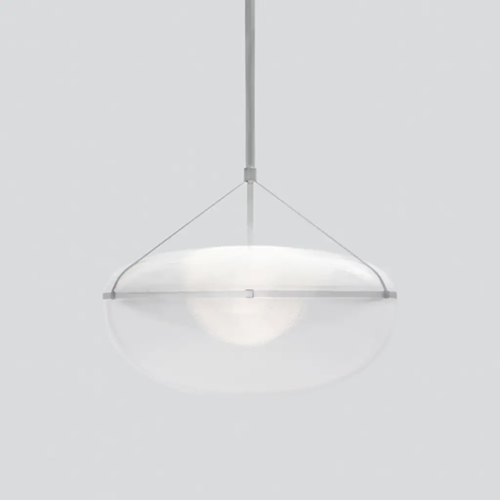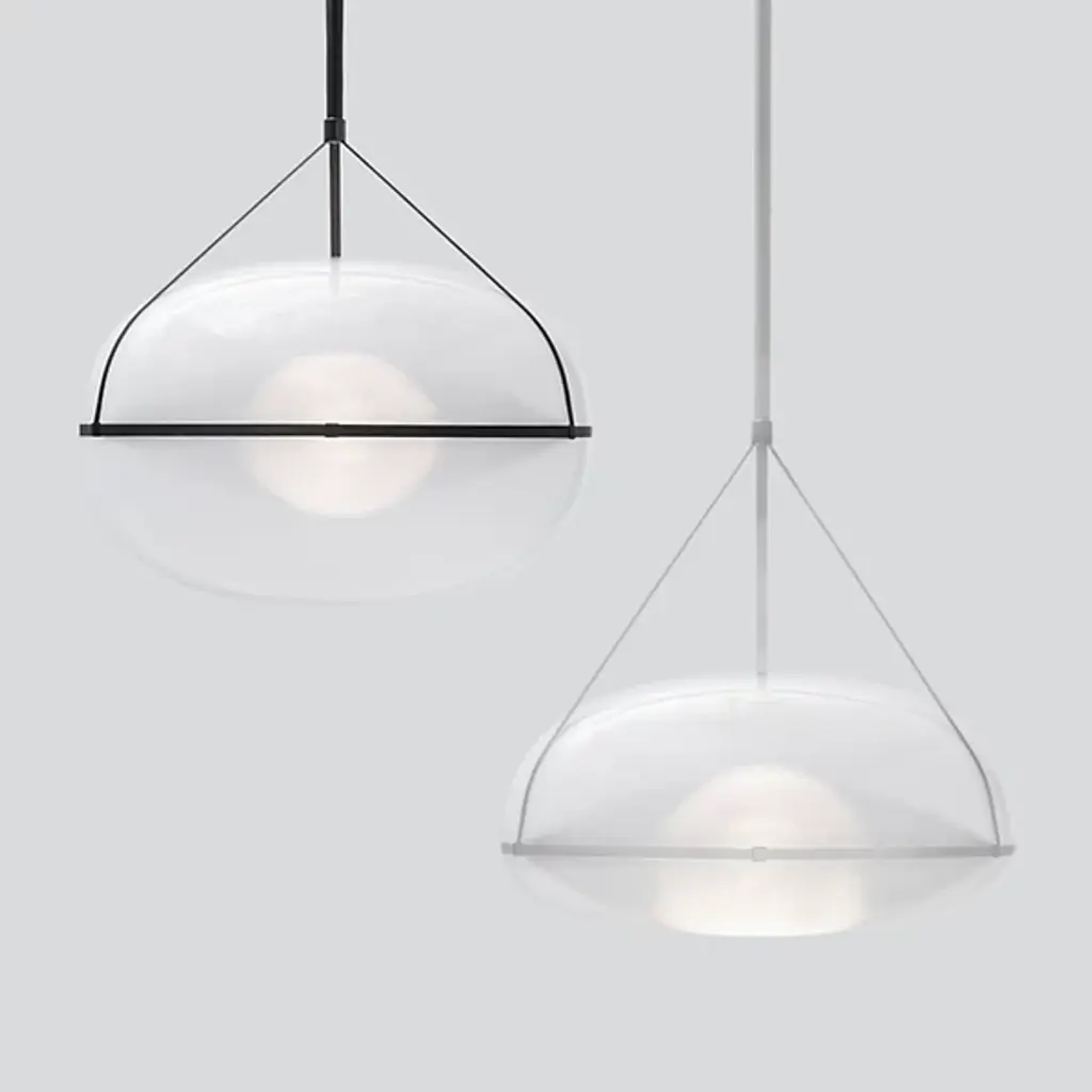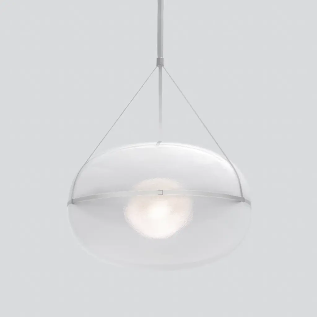 Transform your interiors with the ephemeral and elegant lines of the Iris LED Pendant from A-N-D. An enigmatic design from the mind of Caine Heintzman, it descends from a circular canopy via a slim, strong aluminum stem and curving bracing, supporting bright and energy-friendly lamping inside a voluminous acrylic shade, the captivating elliptical shape transmitting a hazy, opulent warmth to all sides, transforming its surroundings with an elegant, expressive visual lightness matched with a vibrant character.