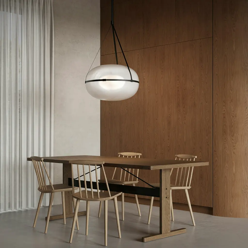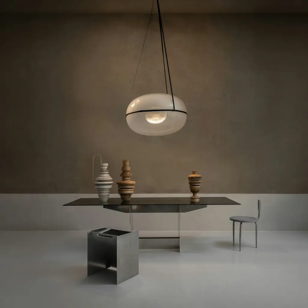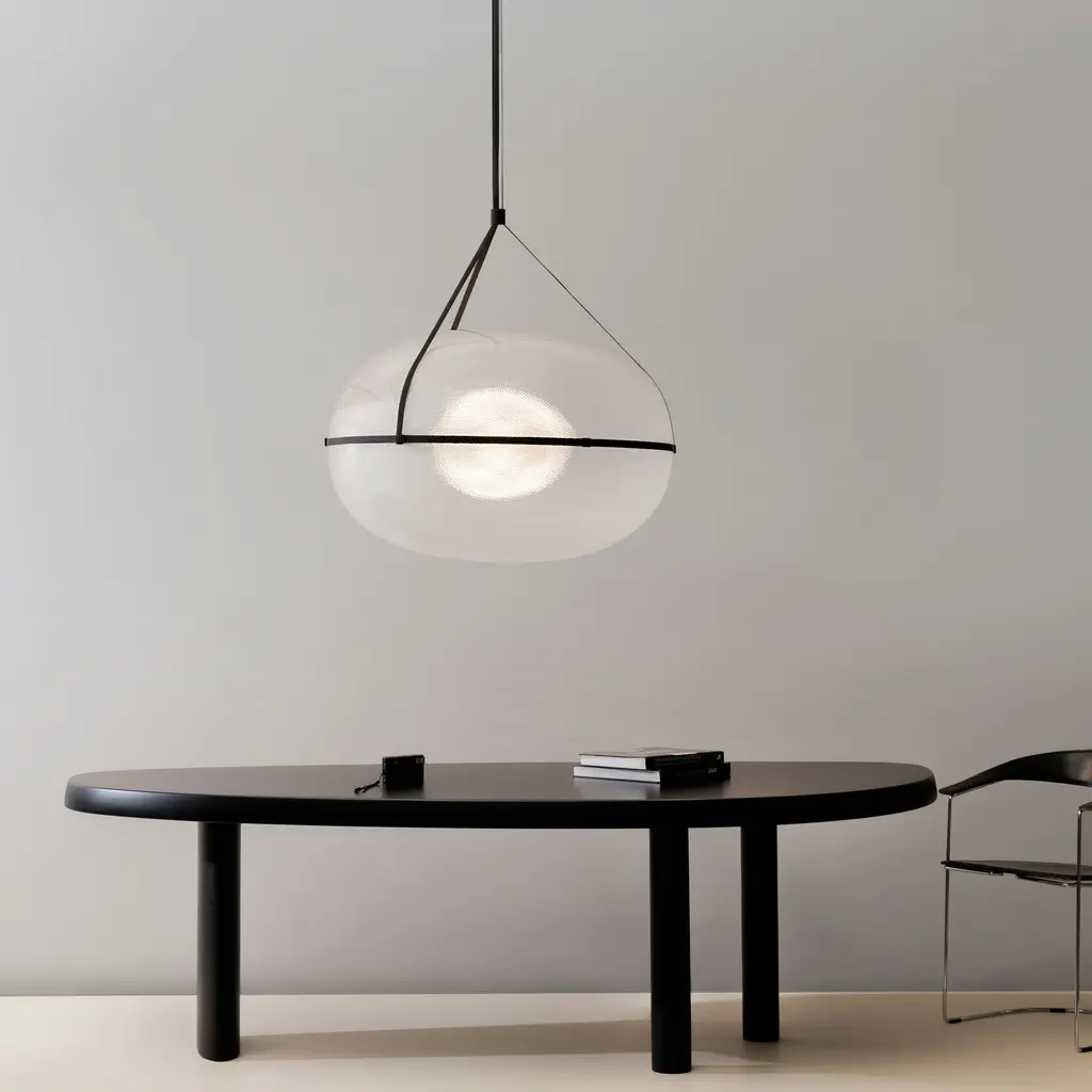 Bold yet ethereal, A-N-D's Iris Pendant (2022) is a floating beauty of kaleidoscopic light. A prismatic orb radiates from within an elliptical shell, suspended by precision webbing that intersects at a machined aluminum slider - allowing you to customize the pendant's silhouette with subtle adjustments of its triangulated lines. Iris also features dim-to-warm technology that shifts seamlessly from bright white to a candlelight-like glow, offering precise control throughout the day. Designed by Caine Heintzman, Iris perfectly embodies technical innovation and timeless design. Bulb: Integral 35V DC LED (included). Made in Canada.