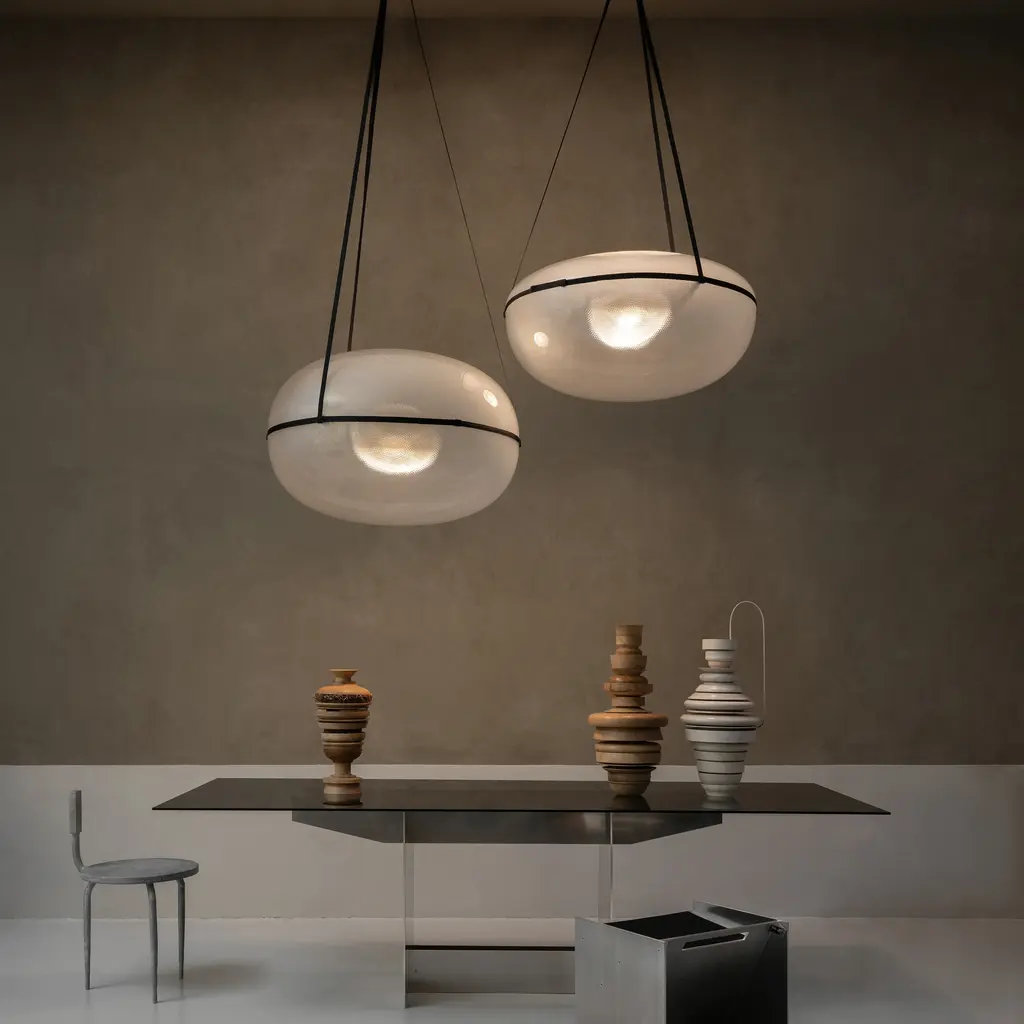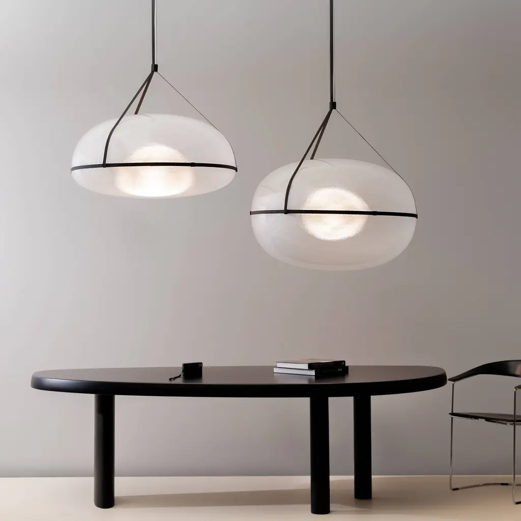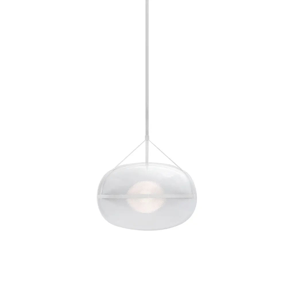 With top and bottom crystalline shades both in the larger A profile, this version of Iris, like its sister pendants, dramatically encases the orb-like light source. The lamp’s voluminous contours float effortlessly in midair with its elliptical acrylic shell held in a triangulating metal suspension that is available in either a black or silver finish. Beautifully diffusing ambient LED illumination, Iris exhibits an air of weightlessness that lends it a magical aerial quality.