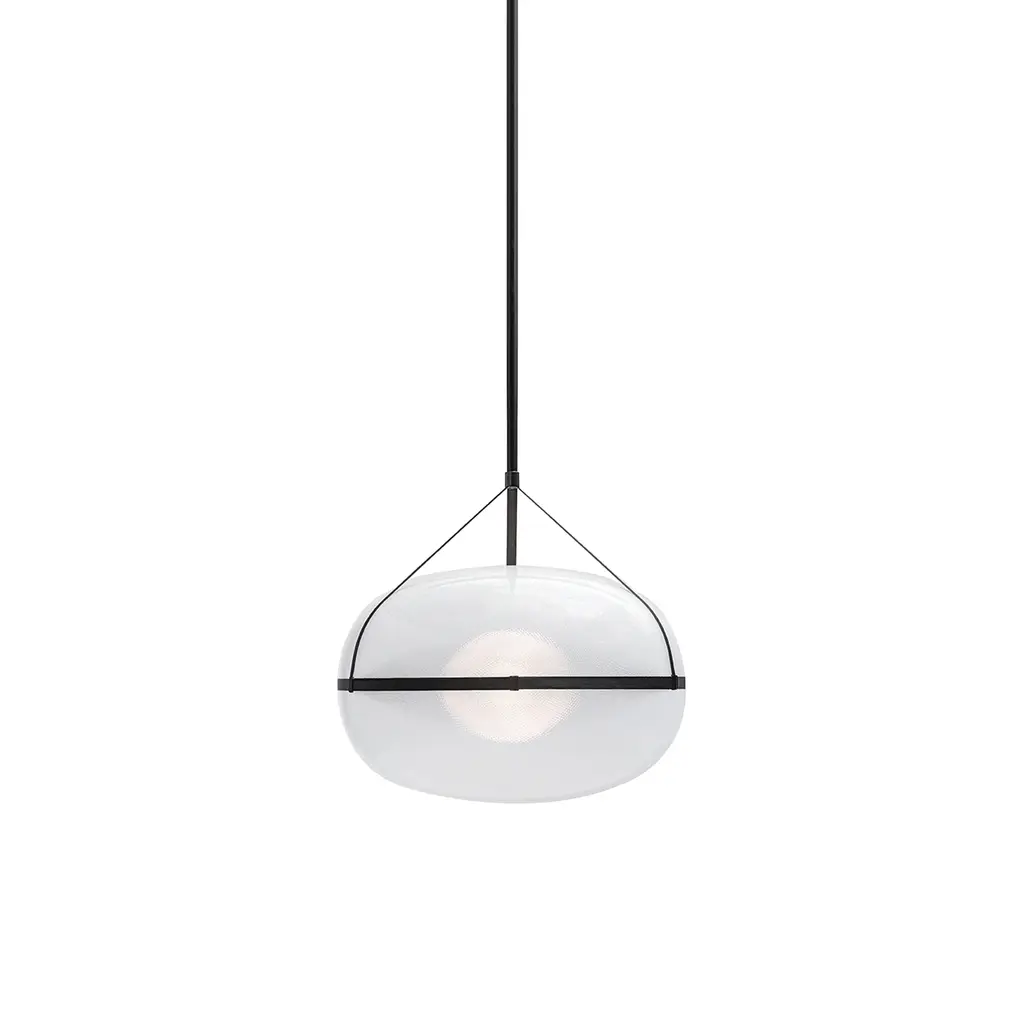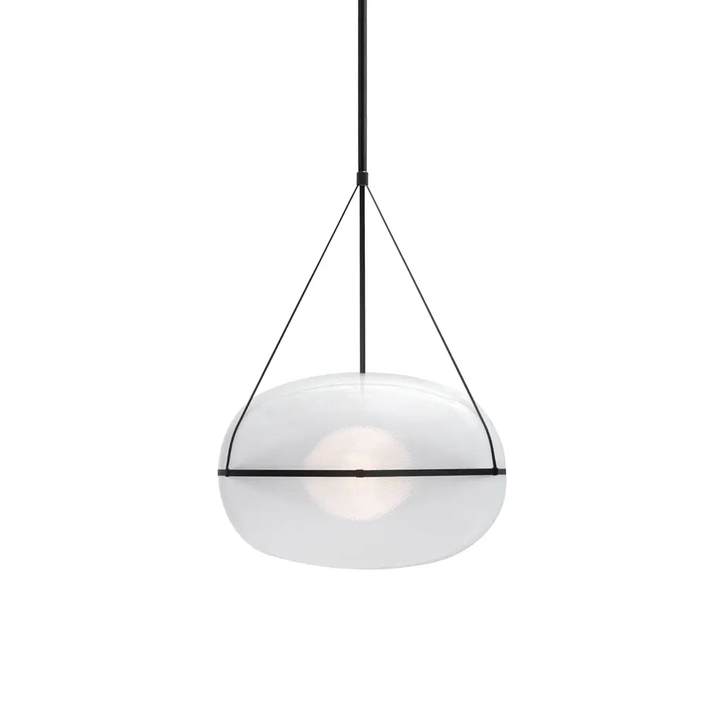 With top and bottom crystalline shades both in the larger A profile, this version of Iris, like its sister pendants, dramatically encases the orb-like light source. The lamp’s voluminous contours float effortlessly in midair with its elliptical acrylic shell held in a triangulating metal suspension that is available in either a black or silver finish. Beautifully diffusing ambient LED illumination, Iris exhibits an air of weightlessness that lends it a magical aerial quality.