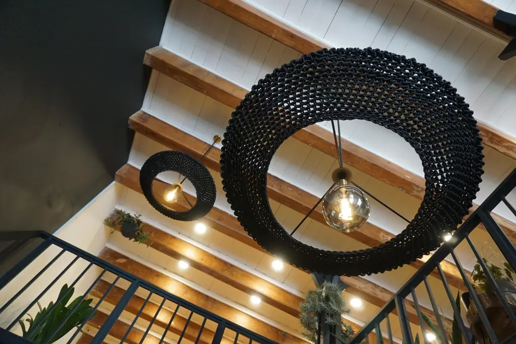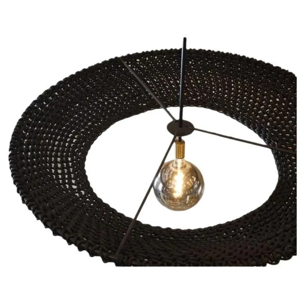 The Iris Pendants. They can be ordered individually or in clusters of different sizes. All Iris pendants are made out of a round steel frame, the Studio Lloyd signature multifilament rope, handcrafted crochet body & LED bulbs. The electrical components, detailing, and strut length can be custom designed specific to our client’s needs. The pendants are made of a Multifilament Polypropylene Rope commonly seen in the yachting industries. The rope is made of a blend of polypropylene and nylon, it is soft to the touch and flexible, floats in water and is resistant to rot, mildew, and UV light. It is extremely all-weather durable and due to the UV light protection does not fade in colour. Various finishes and bulb options available.