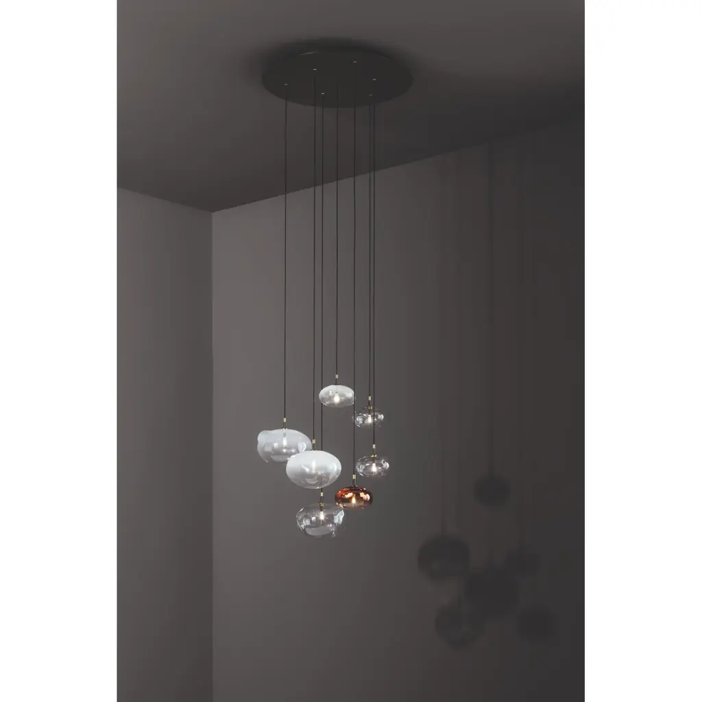 Pepita is a collection of lamps characterized by a wide variety of finishes, sizes and combinations and inspired by the shape of gold nuggets. As its name suggests, Pepita calls to mind a multifaceted piece of precious metal, which changes and transforms depending on the perspective. In the same way, it is capable of transforming the space thanks to its shape which is deliberately irregular, and thanks to the finishes of the glass lampshade which characterize the personality of the lamp, thereby creating different lighting atmospheres depending on the compositions. Pepita is ethereal in the transparent version, while it conveys a sense of elegance of times past in the silk version or gives a touch of color and warmth in the copper version. Pepita is available as a suspension lamp (single glass and in three compositions: three glass, five glass and seven glass), as a floor lamp and as a table lamp. The glass lampshade is available in three different sizes.
