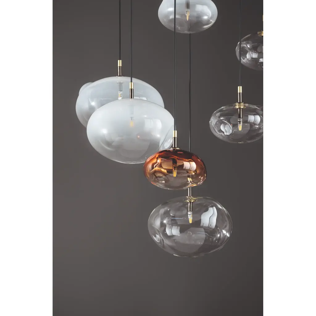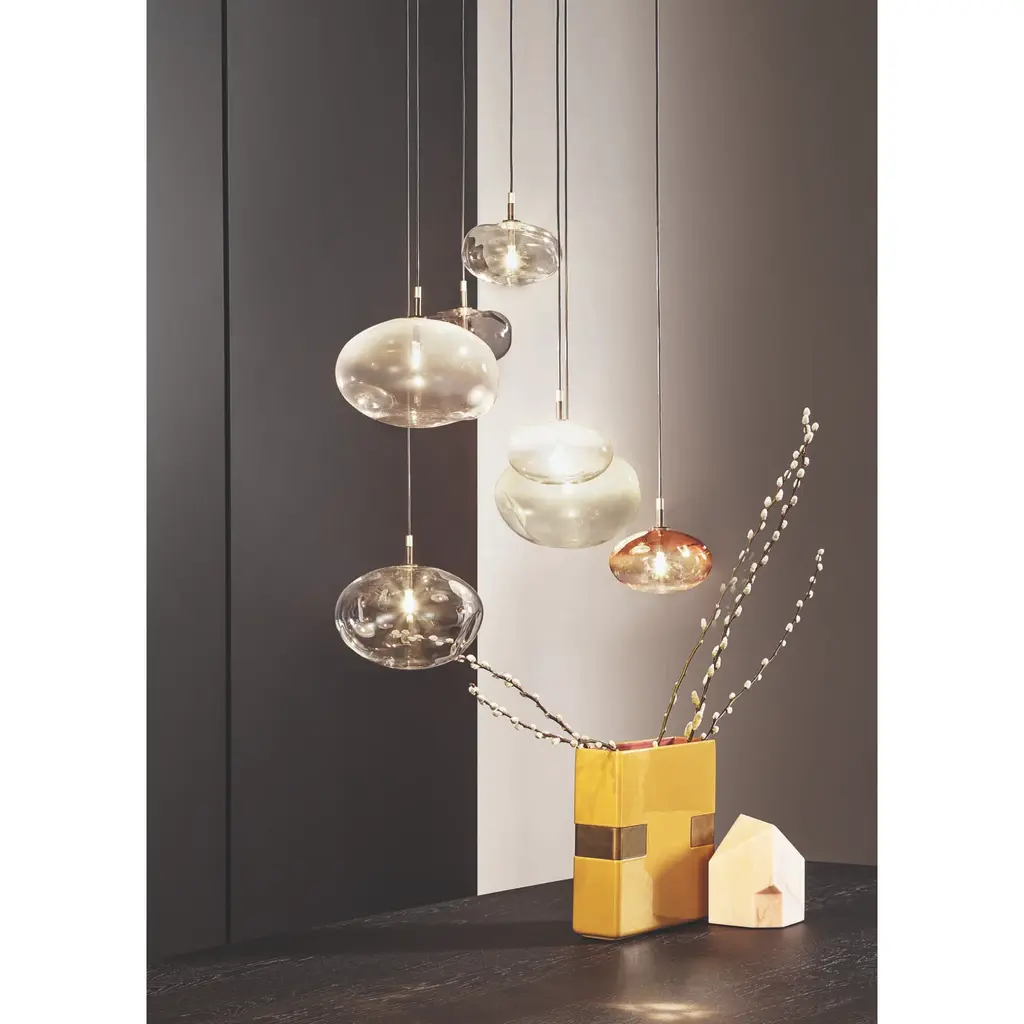 Pepita is a collection of lamps characterized by a wide variety of finishes, sizes and combinations and inspired by the shape of gold nuggets. As its name suggests, Pepita calls to mind a multifaceted piece of precious metal, which changes and transforms depending on the perspective. In the same way, it is capable of transforming the space thanks to its shape which is deliberately irregular, and thanks to the finishes of the glass lampshade which characterize the personality of the lamp, thereby creating different lighting atmospheres depending on the compositions. Pepita is ethereal in the transparent version, while it conveys a sense of elegance of times past in the silk version or gives a touch of color and warmth in the copper version. Pepita is available as a suspension lamp (single glass and in three compositions: three glass, five glass and seven glass), as a floor lamp and as a table lamp. The glass lampshade is available in three different sizes.