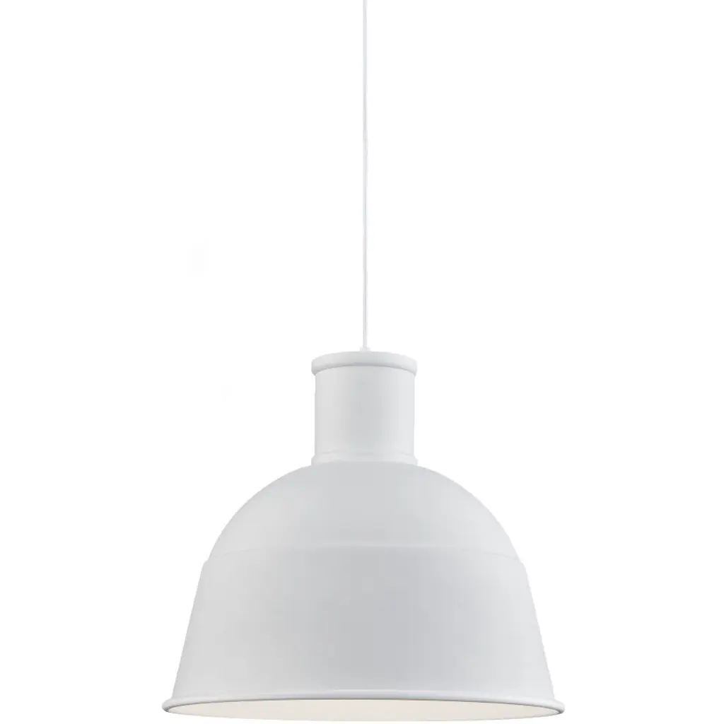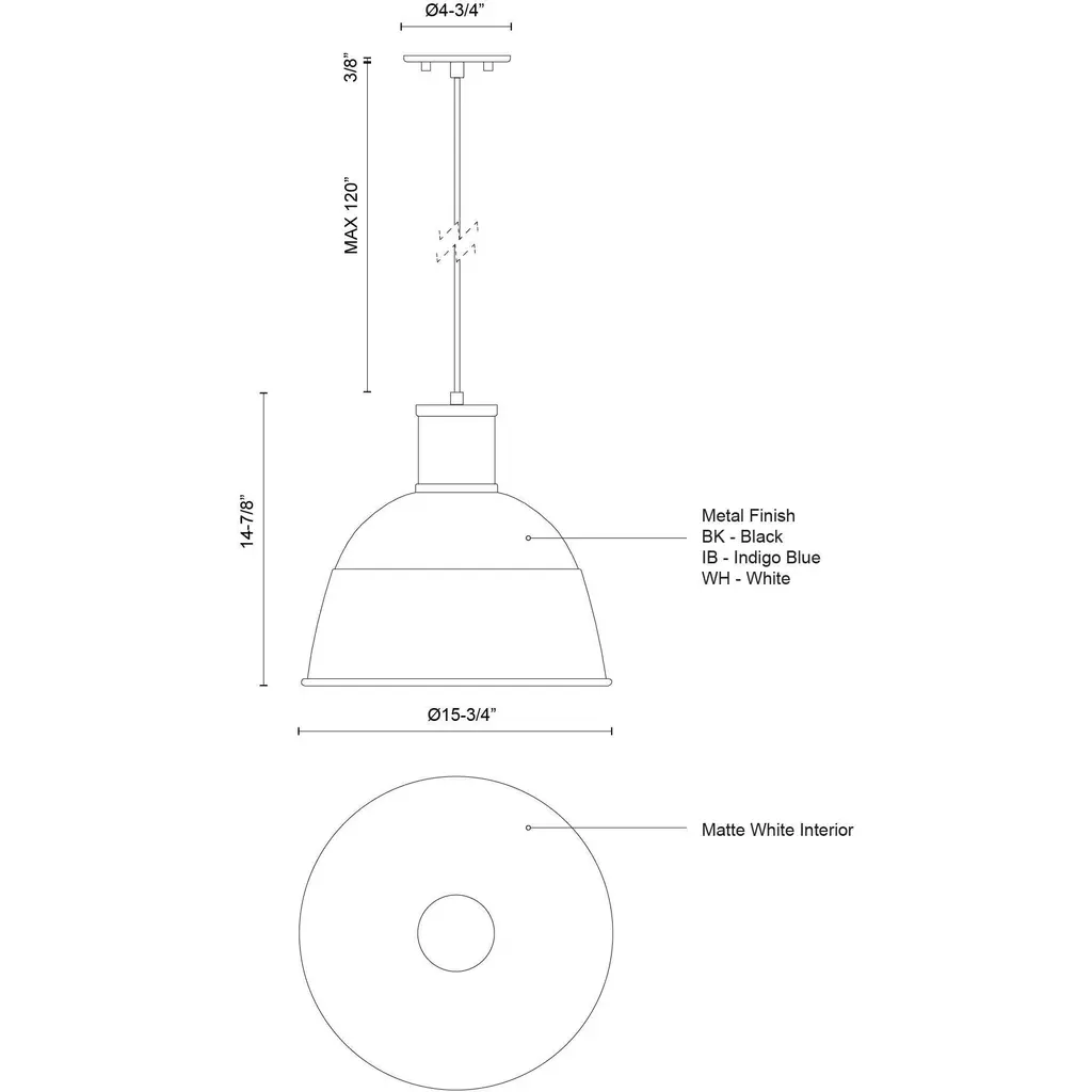 Single-lamp pendant with aluminum dome shade showcasing powder-coated finishes. Exterior shade colors are black, white or blue, with matte white interior. Suspended by cloth cable to a maximum 120" length. Available in three sizes.