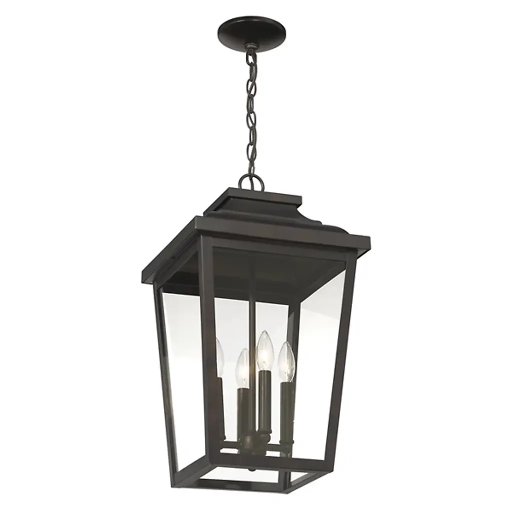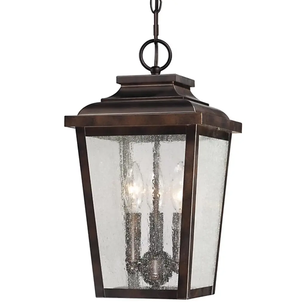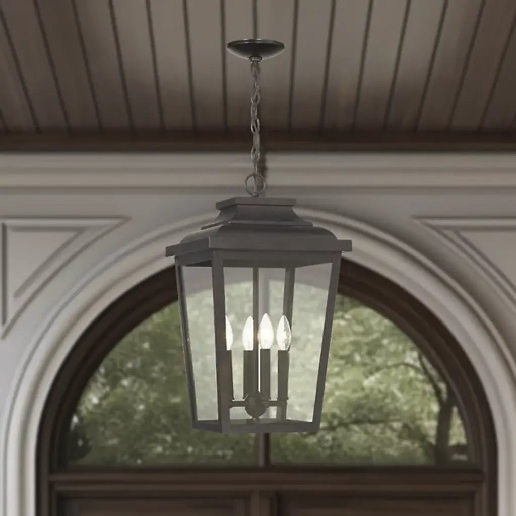 The Irvington Manor Outdoor Pendant by The Great Outdoors is a handsome, durable addition to spaces. Simply suspended by a linked chain and a decorative loop, the classic lantern-style build of this pendant features a bold finish, seeded glass panels, and a tapered silhouette. Evenly diffusing a layer of illumination through the softly textured glass panes, this outdoor fixture brings a welcoming blend of form and function to its environment.