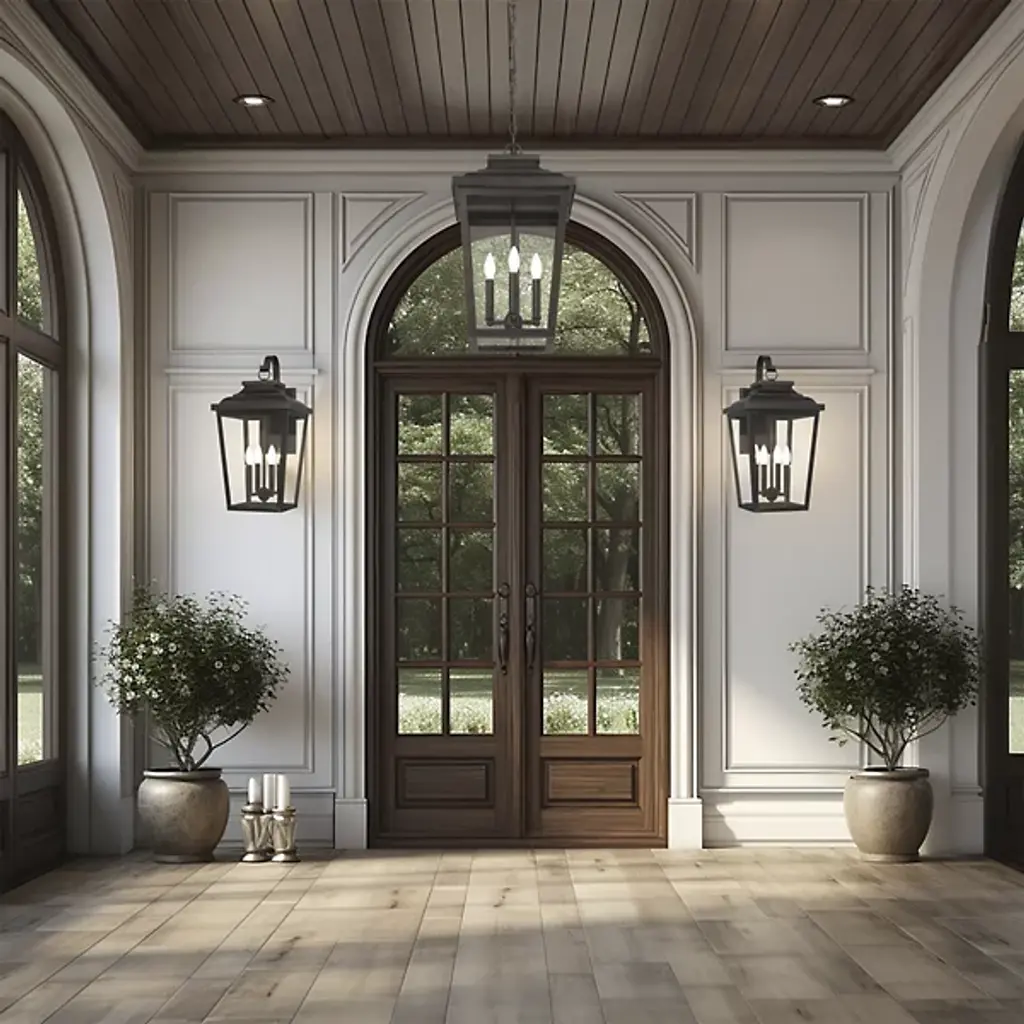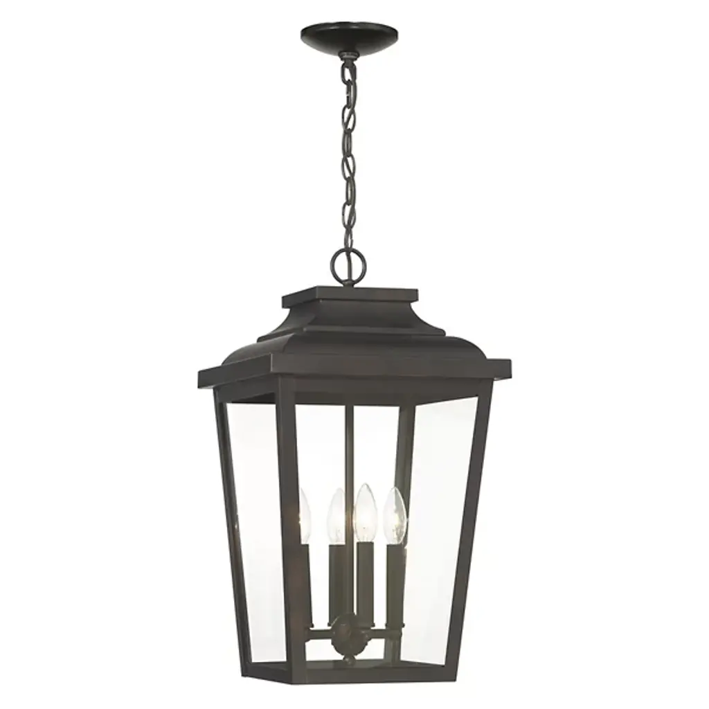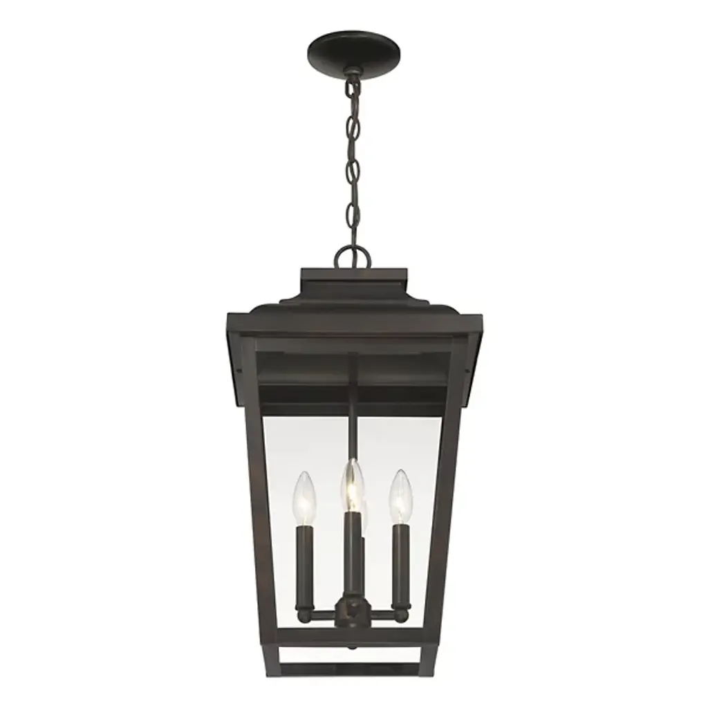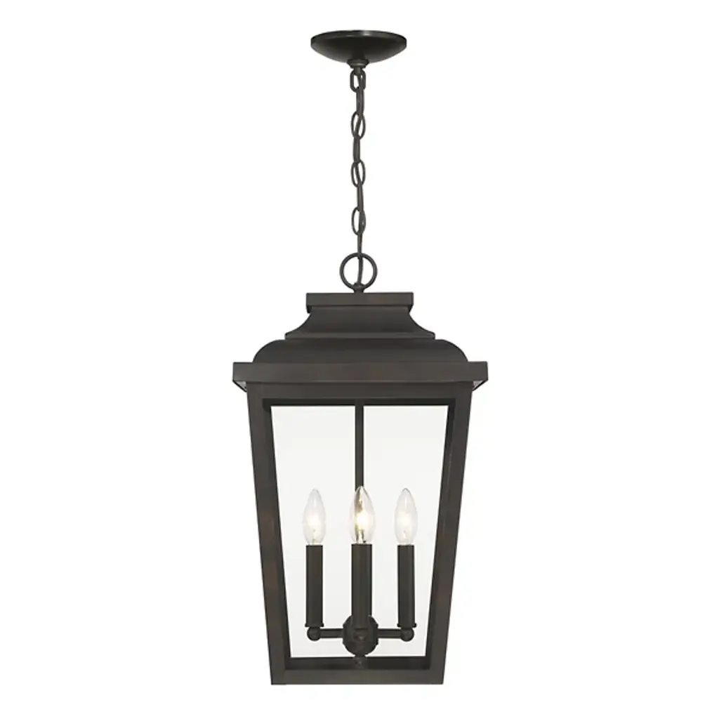 The Irvington Manor Outdoor Pendant by The Great Outdoors is a handsome, durable addition to spaces. Simply suspended by a linked chain and a decorative loop, the classic lantern-style build of this pendant features a bold finish, seeded glass panels, and a tapered silhouette. Evenly diffusing a layer of illumination through the softly textured glass panes, this outdoor fixture brings a welcoming blend of form and function to its environment.
