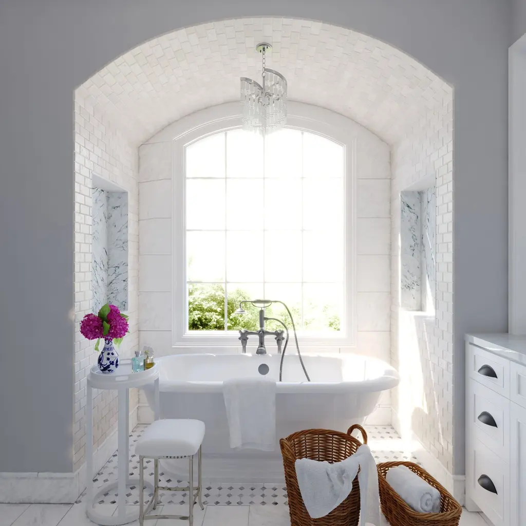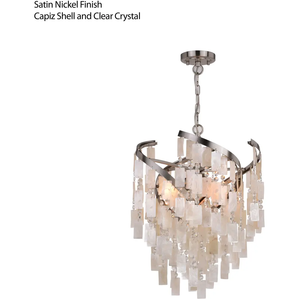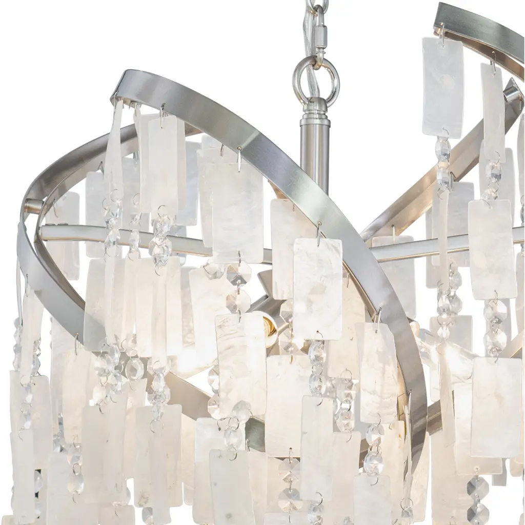 Like a gentle waterfall, the Isabel beautifully engages the viewer with its soft sweeping satin nickel lines. Suspended trails of crystal beads together with delicate panes of genuine capiz shells blend a pop of glam with the raw nature of the coast. The clean bright shimmer and shine of this collection is an ideal way to draw focus to the tub in your bath, or add unique styling to your dining, bedroom, or living space.