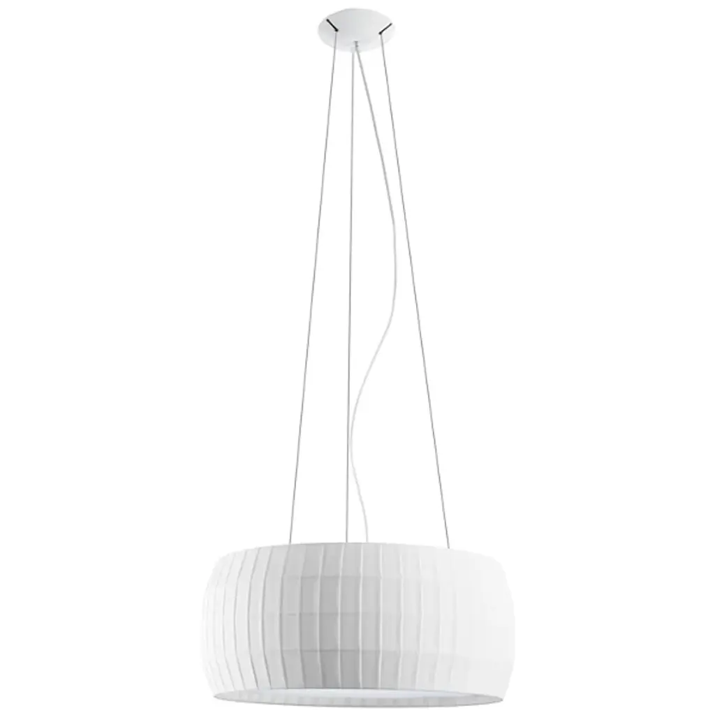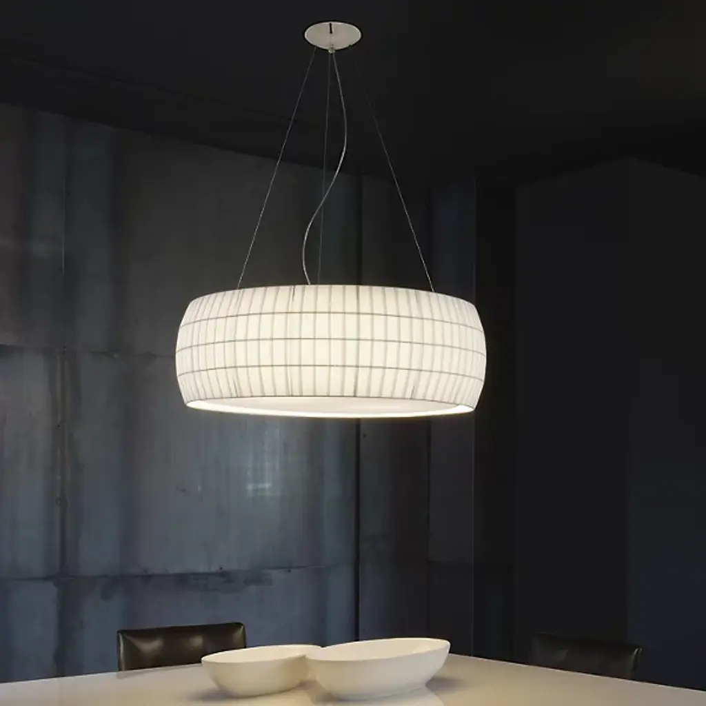 As beautiful as classically written literature. The creatives at Spanish studio Nahtran Disseny have given new life to the soft and durable bookbinding tape in their intricately wrapped Isamu Pendant from Carpyen. The piece hangs poetically in the air with near disappearing ultra-slim wires. Marvelous in its pattern, a grid frame develops the drum form and the gentle curves of the piece. Bookbinding tape is elegantly wrapped over the sophisticated frame like a stylish pleated fabric. Turn it on and watch as the awe-inspiring glow filters through the shade and diffuser, leaving behind a crisp grid silhouette.