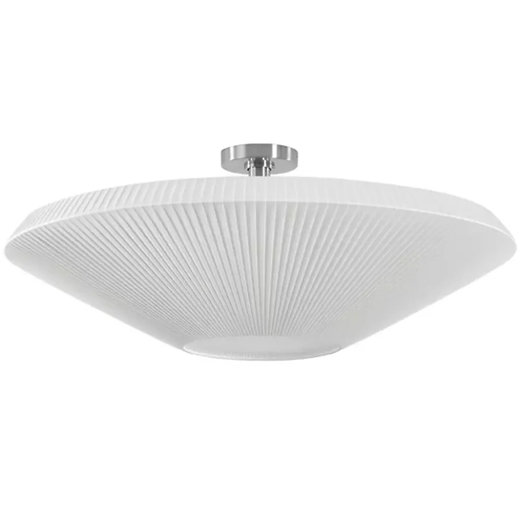 Unmatched in its attention to detail. Spanish studio Nahtran Disseny makes magic happen by draping their graphically perfect framework with a meticulously crafted bookbinding tape shade in the Isamu Semi-Flushmount from Carpyen. Craftsmen painstakingly cut and hand-arrange strips of softly textured bookbinding tape like a beautiful pleated skirt, resulting in a stylish shade. Its metal grid frame leaves subtle indentations of line on the shade that come across in a captivating silhouette when you turn on the lights. A flip of the switch creates a halo of warm light over your ceiling while a spacious glow filters out the tape strips and a glare-reducing diffuser plate at the base.