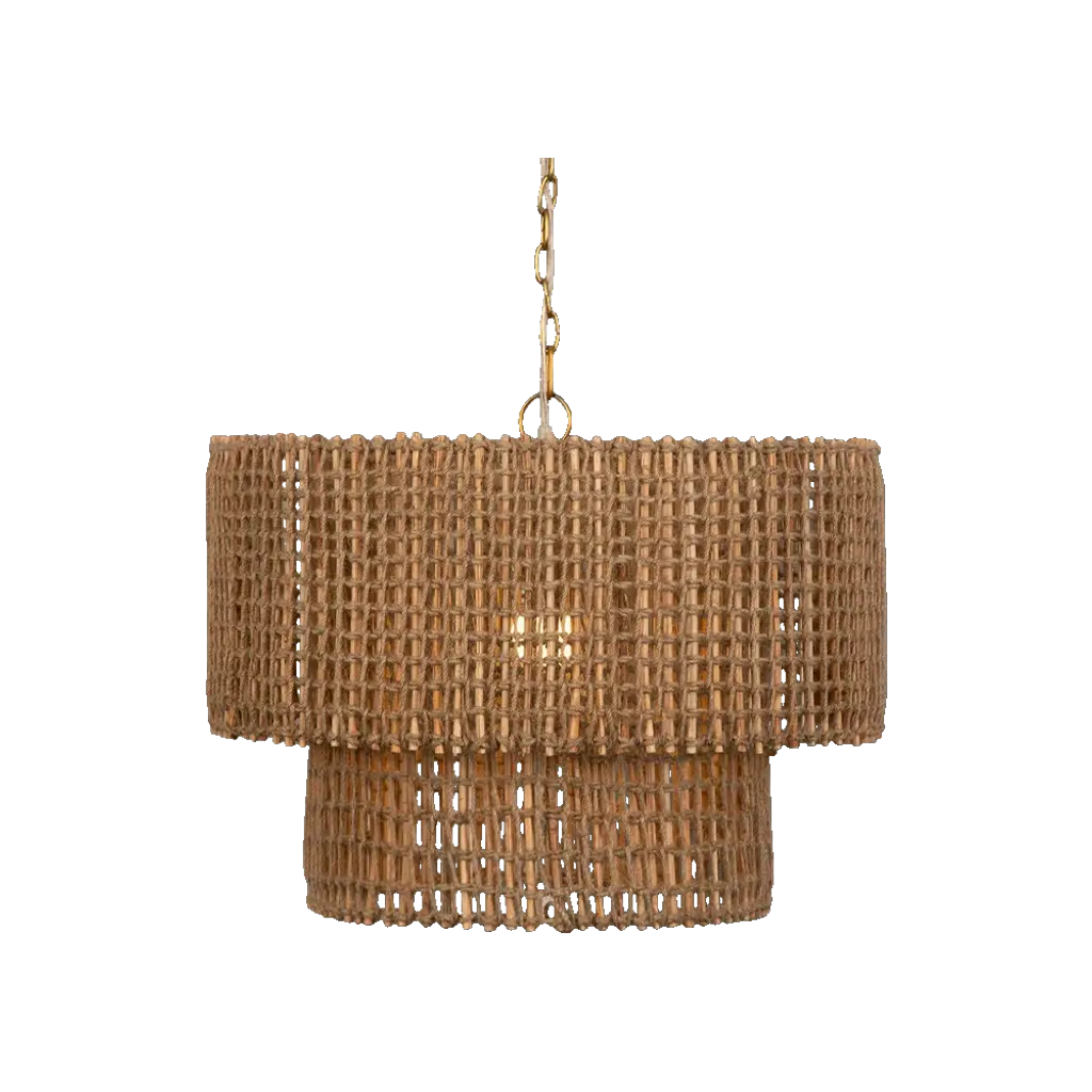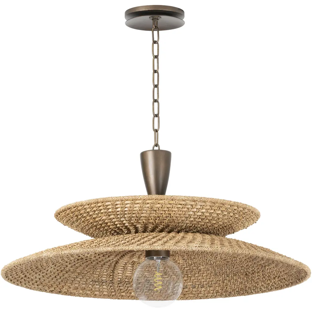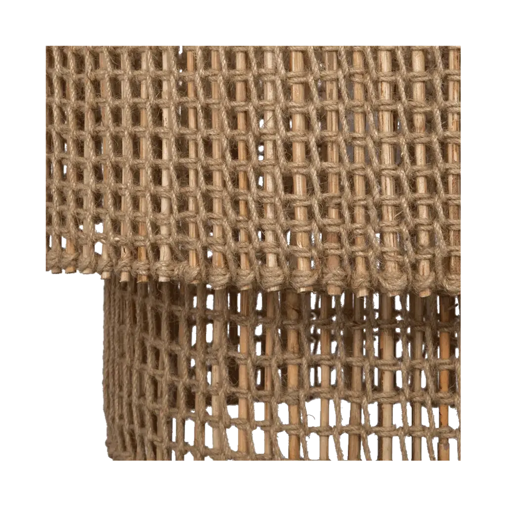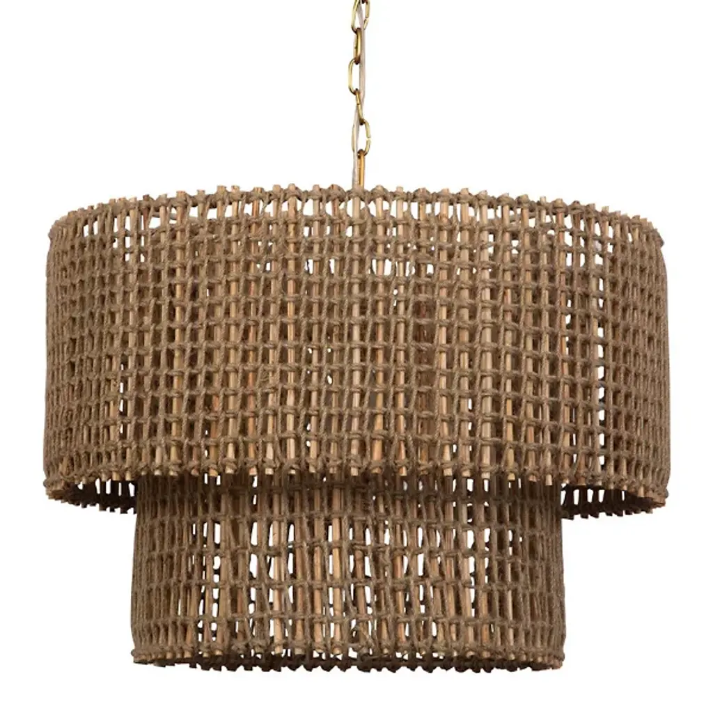 The Isandro Pendant Ceiling Lamp is a stunning embodiment of rustic and modern design, crafted to illuminate and enhance any living space with its unique charm. This pendant features a double-tiered shade constructed from an intricately woven rattan, finished in a warm, natural golden-brown hue that exudes an organic, earthly appeal. The layered design creates a bold yet harmonious silhouette that diffuses light softly, casting a cozy, ambient glow throughout the room.