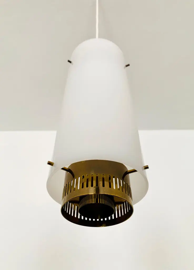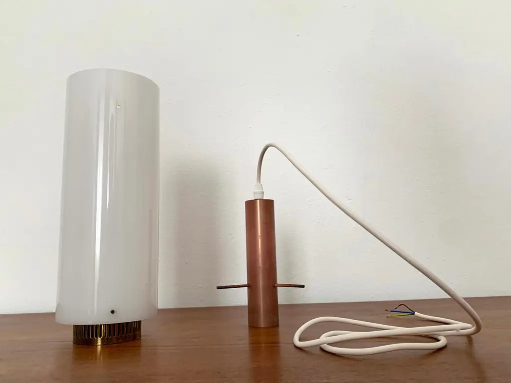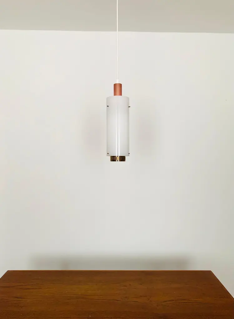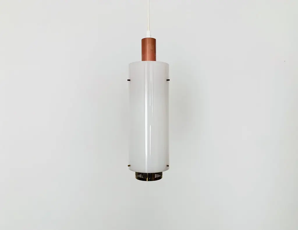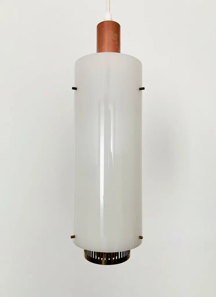 Very pretty and rare pendant lamp from the 1950s.The lampshade made of acrylic glass spreads a pleasant lighting atmosphere.Wonderful design and very high quality workmanship.Condition:Very good vintage condition with slight signs of wear consistent with age.The copper parts are beautifully patinated.The acrylic glass lampshade has slight signs of wear.The pictures are part of the description.I am happy to help with any questions.Dimensions:Diameter: 12cm/ 4.72in.Lamp height: 40 cm/ 15.75 in.Acrylic glass height: 30 cm/ 11.81 in.Cord Length: approx. 120 cm/ 47.24 in.1x E27/ E26 socket.Shipping without bulbs and canopy.Works from 110V to 230V in all countries.