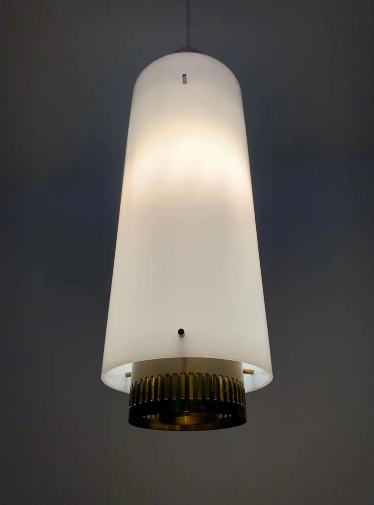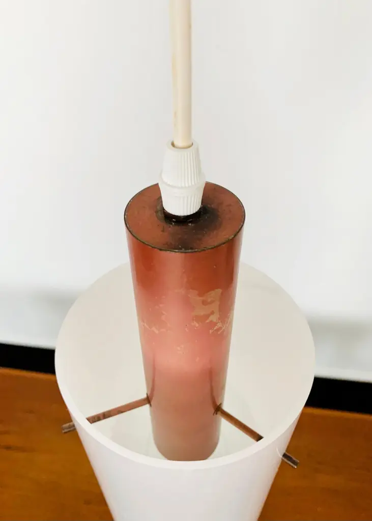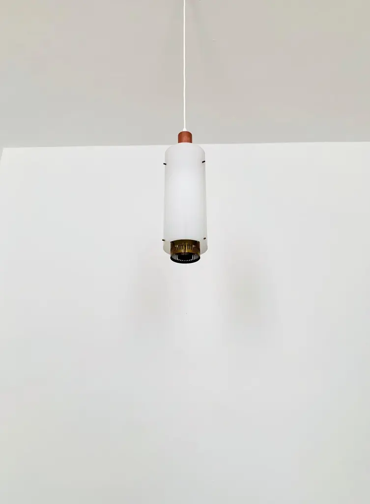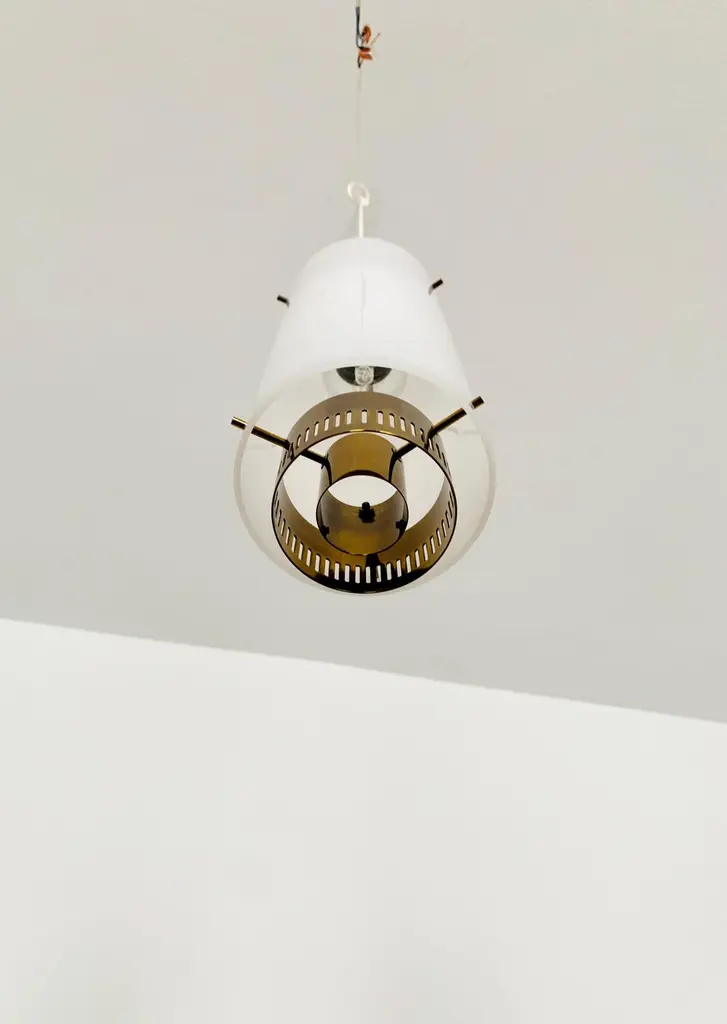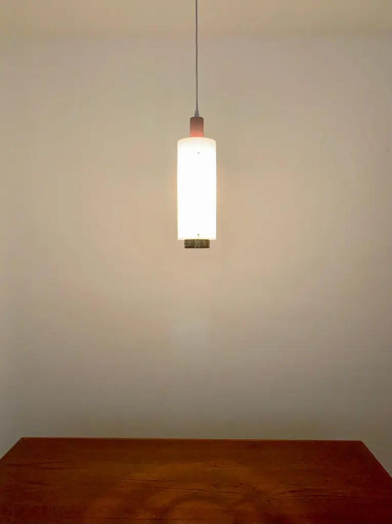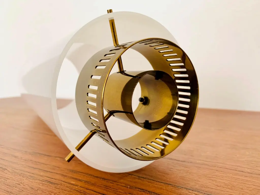 Very pretty and rare pendant lamp from the 1950s.The lampshade made of acrylic glass spreads a pleasant lighting atmosphere.Wonderful design and very high quality workmanship.Condition:Very good vintage condition with slight signs of wear consistent with age.The copper parts are beautifully patinated.The acrylic glass lampshade has slight signs of wear.The pictures are part of the description.I am happy to help with any questions.Dimensions:Diameter: 12cm/ 4.72in.Lamp height: 40 cm/ 15.75 in.Acrylic glass height: 30 cm/ 11.81 in.Cord Length: approx. 120 cm/ 47.24 in.1x E27/ E26 socket.Shipping without bulbs and canopy.Works from 110V to 230V in all countries.