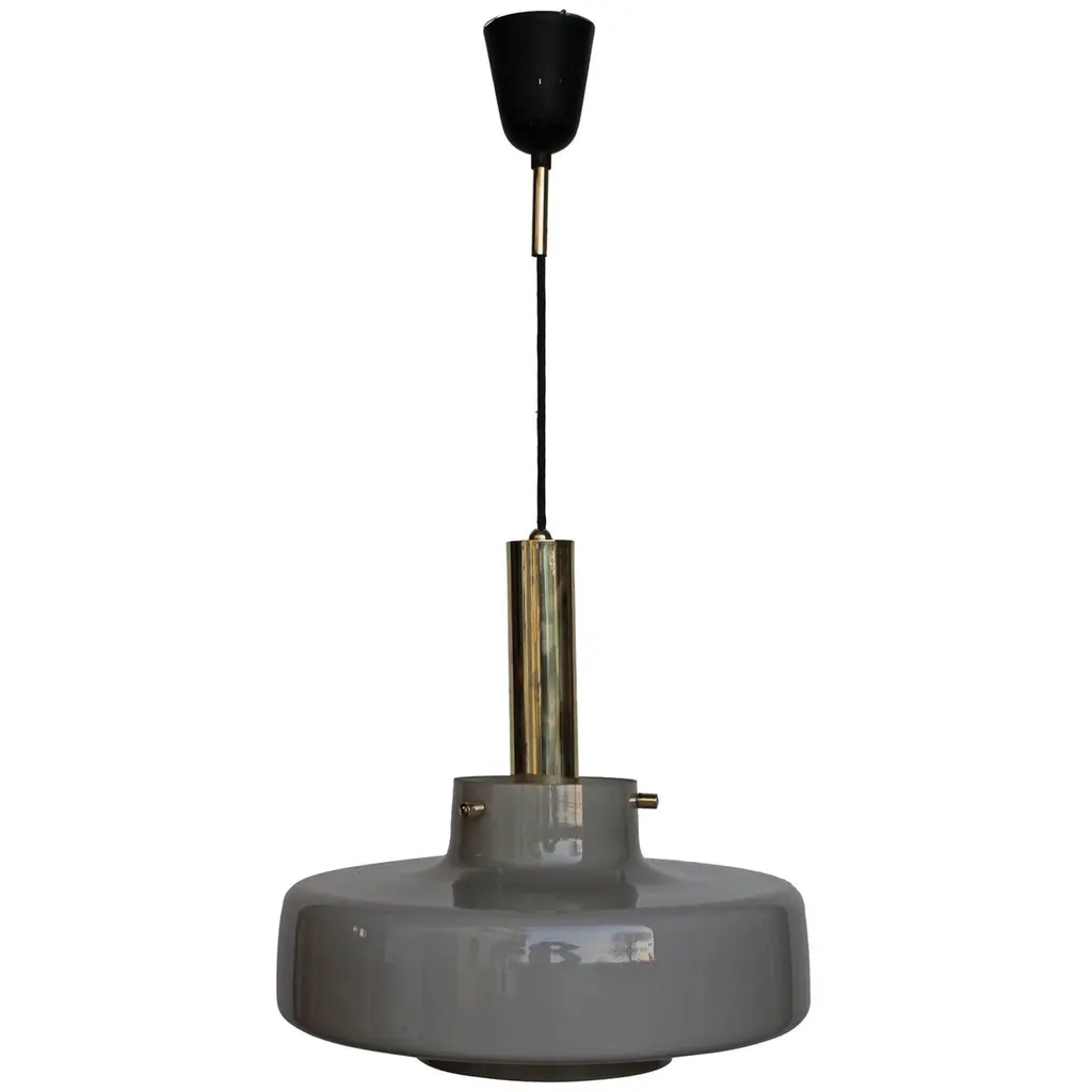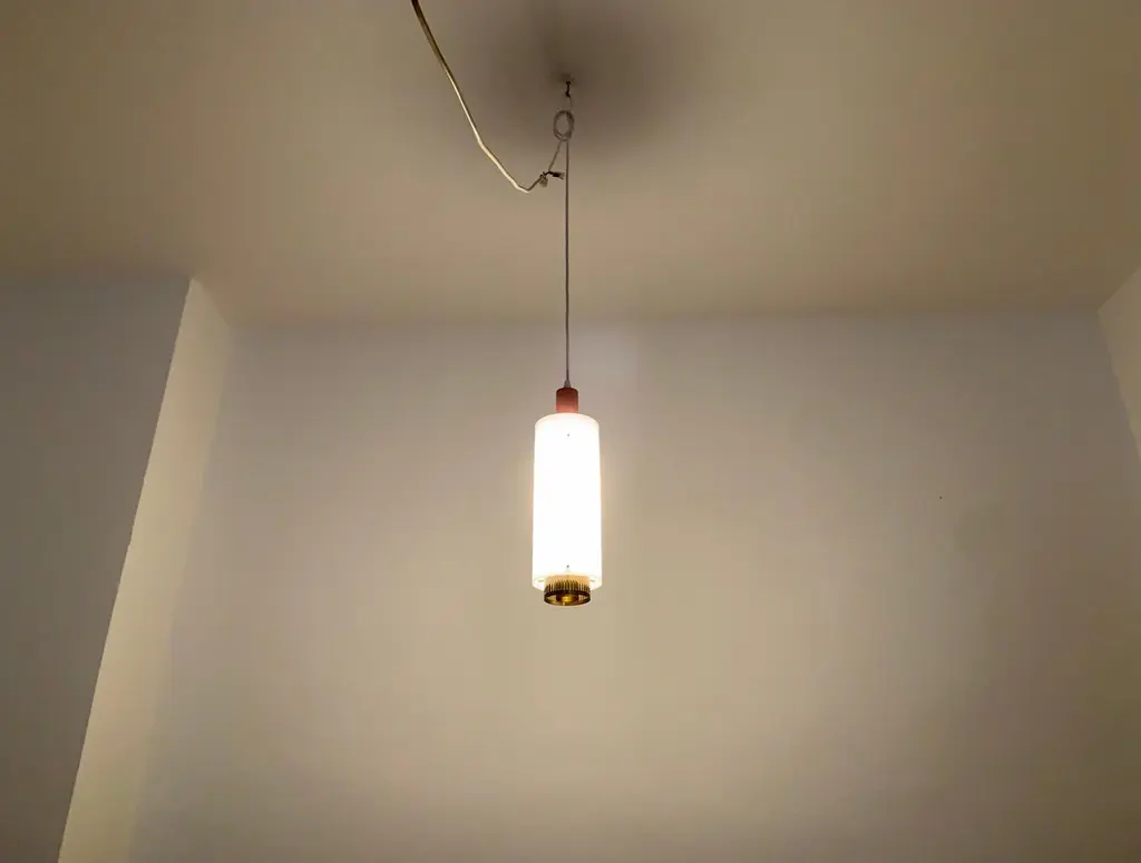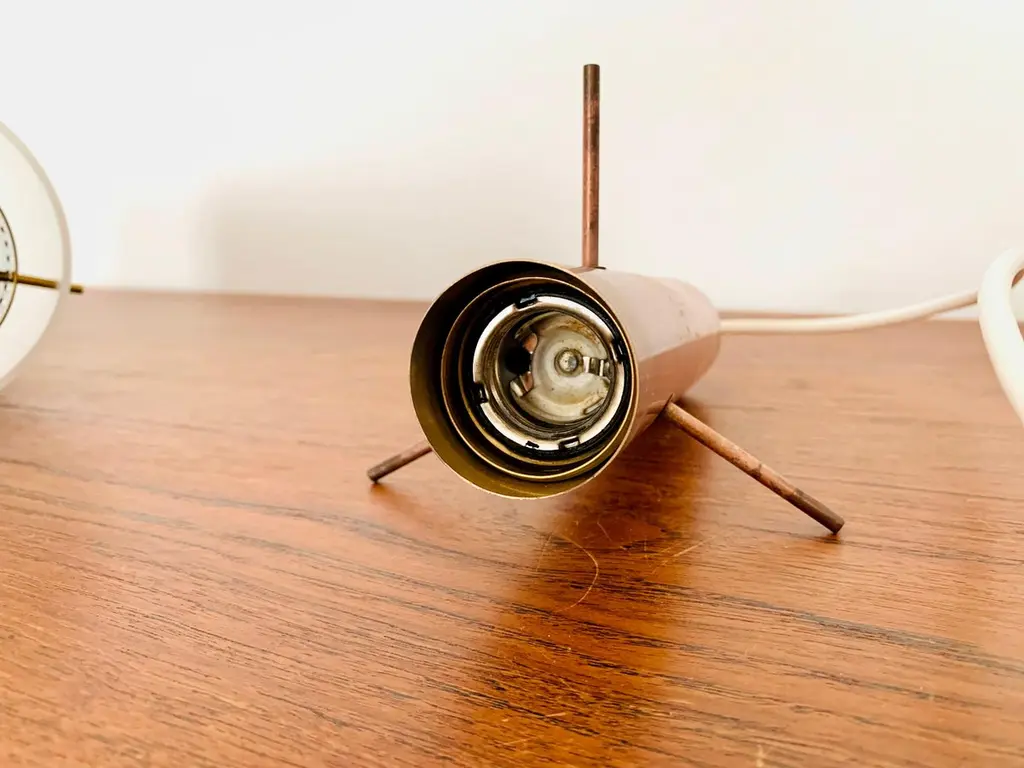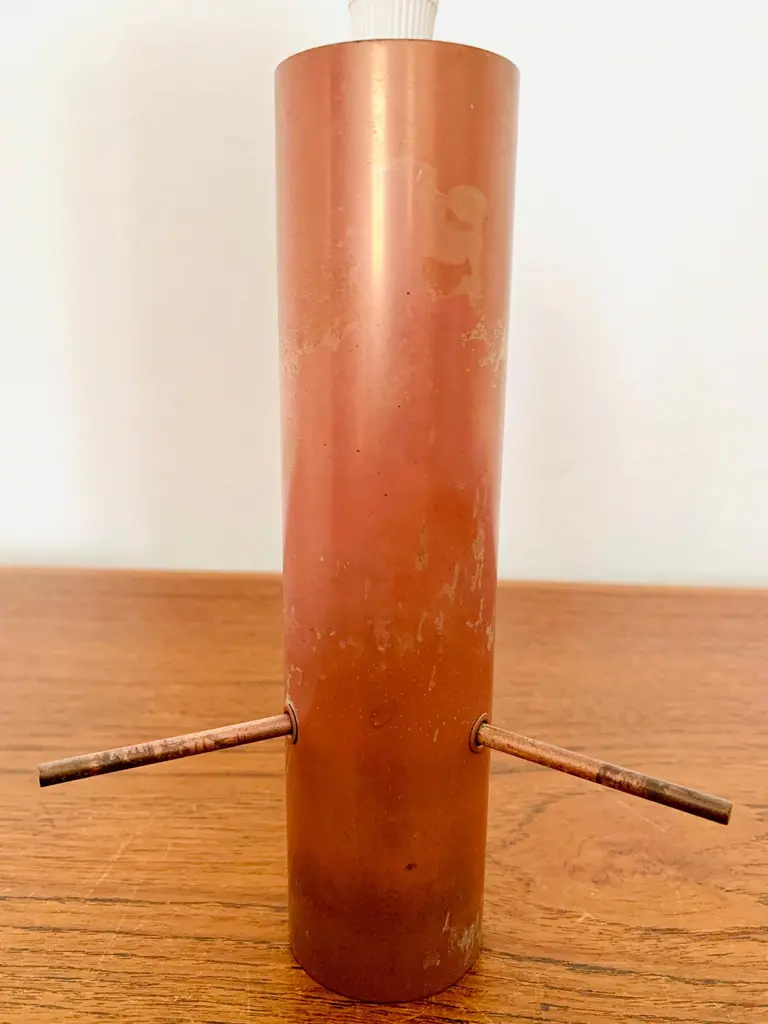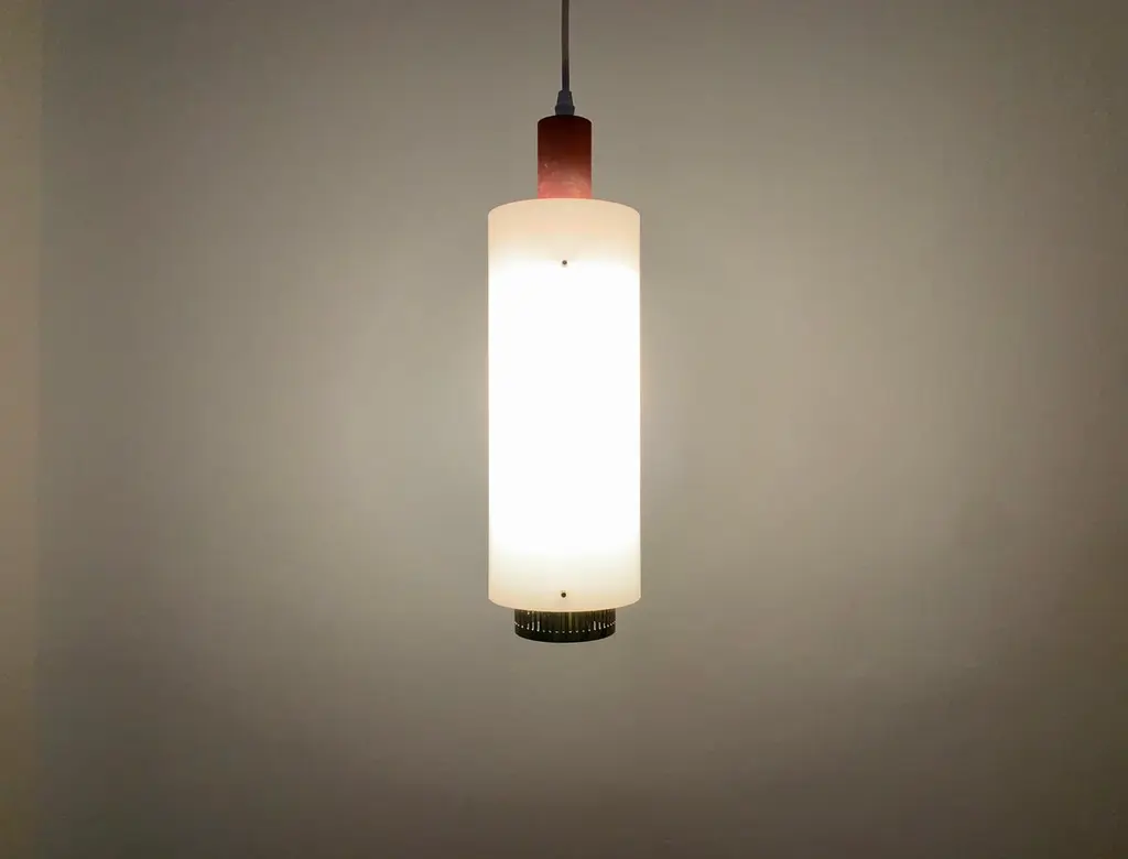 Very pretty and rare pendant lamp from the 1950s.The lampshade made of acrylic glass spreads a pleasant lighting atmosphere.Wonderful design and very high quality workmanship.Condition:Very good vintage condition with slight signs of wear consistent with age.The copper parts are beautifully patinated.The acrylic glass lampshade has slight signs of wear.The pictures are part of the description.I am happy to help with any questions.Dimensions:Diameter: 12cm/ 4.72in.Lamp height: 40 cm/ 15.75 in.Acrylic glass height: 30 cm/ 11.81 in.Cord Length: approx. 120 cm/ 47.24 in.1x E27/ E26 socket.Shipping without bulbs and canopy.Works from 110V to 230V in all countries.