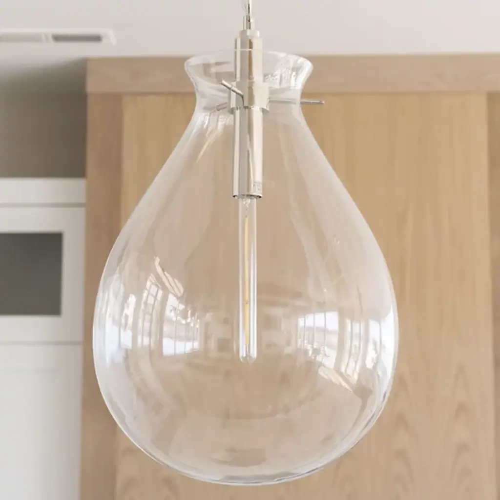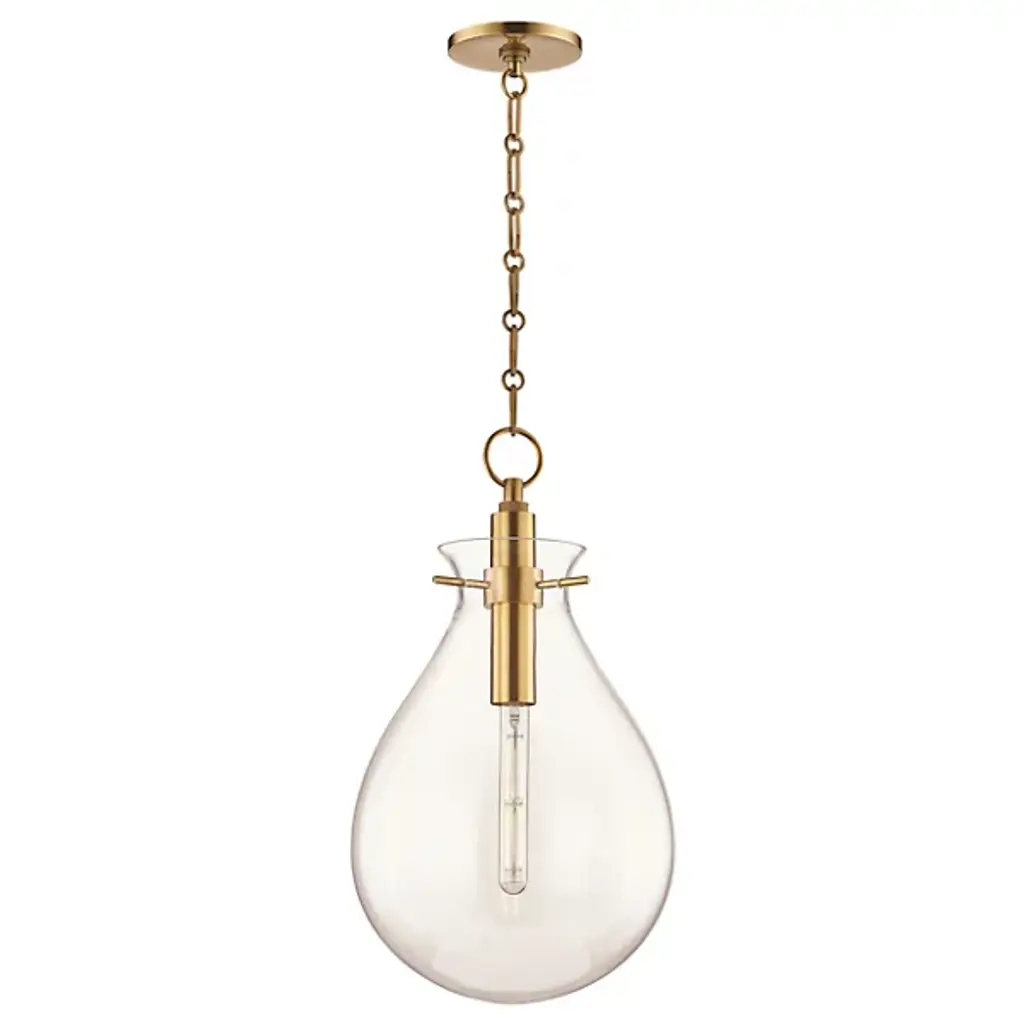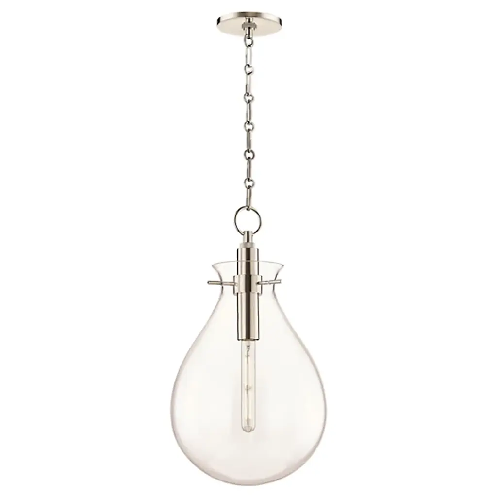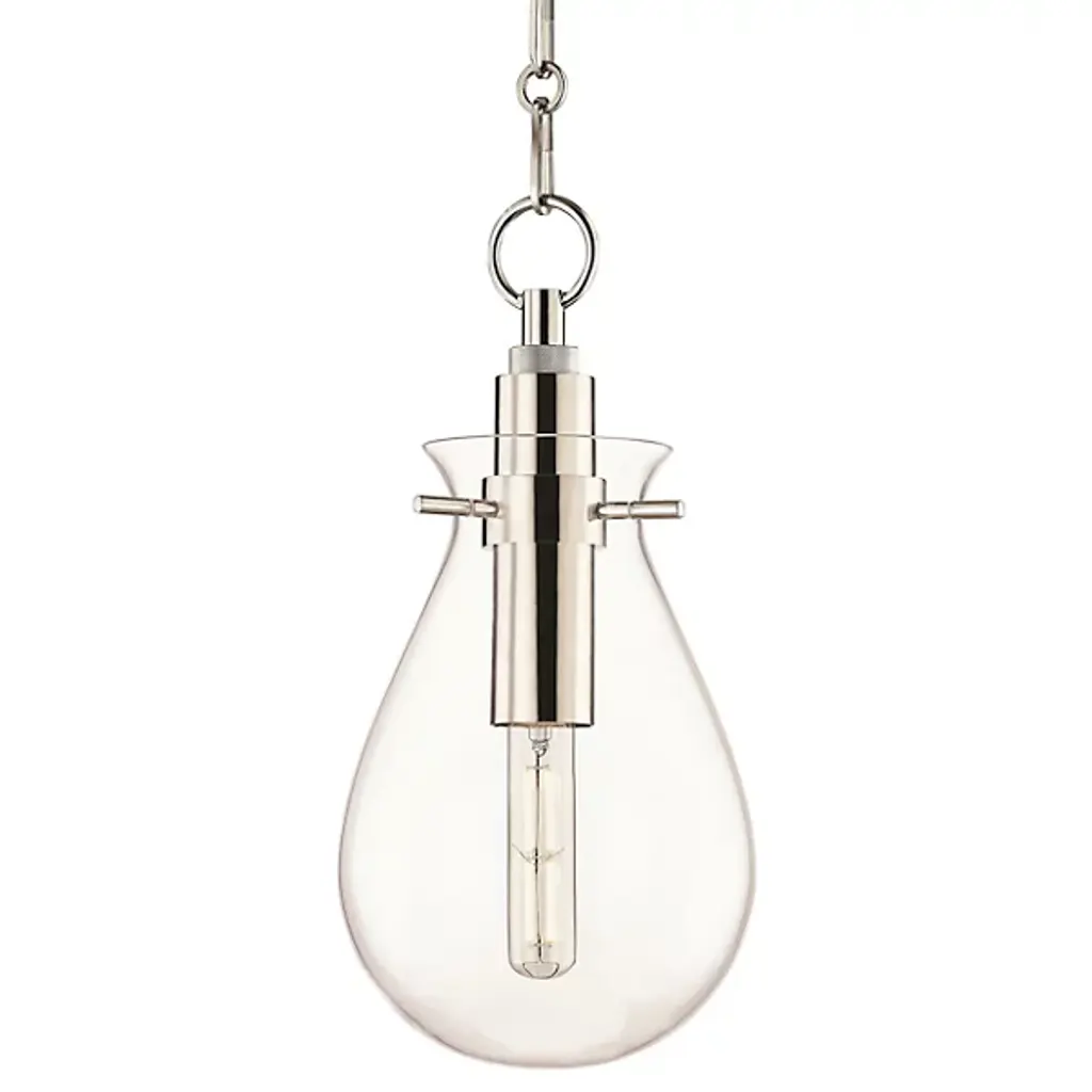 Elegant simplicity with universal appeal. Designed by Becki Owens for Hudson Valley Lighting, the Ivy LED Pendant Light shines in a kitchen, dining room or hallway. Packed with distinctive details, the design showcases an oval and circle Metal chain that draws the eyes down to a prominent ring holder. Knurled fittings lend a coastal industrial flavor to the sleek Metal cylinder socket. Suspended from the fixture, a Glass shade with a Grecian urn-like silhouette creates an eye-pleasing outline to the exposed LED tube bulb. Equivalent to a 40 Watt incandescent light, the replaceable LED bulb provides clear, glare-free illumination above an island in a farmhouse modern kitchen or over a dining table in your breezy coastal inspired dining room.
