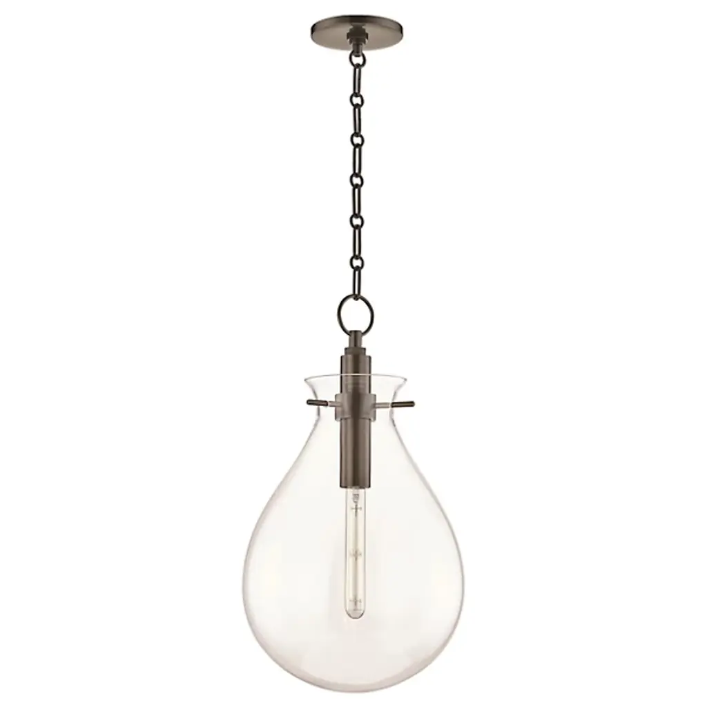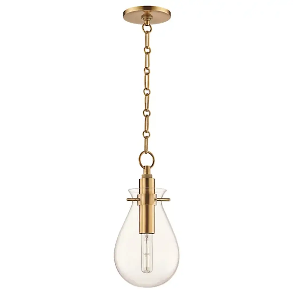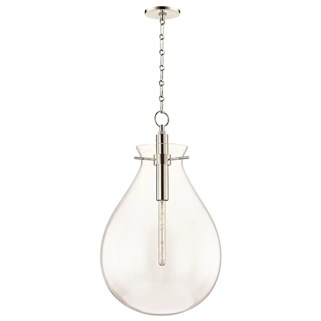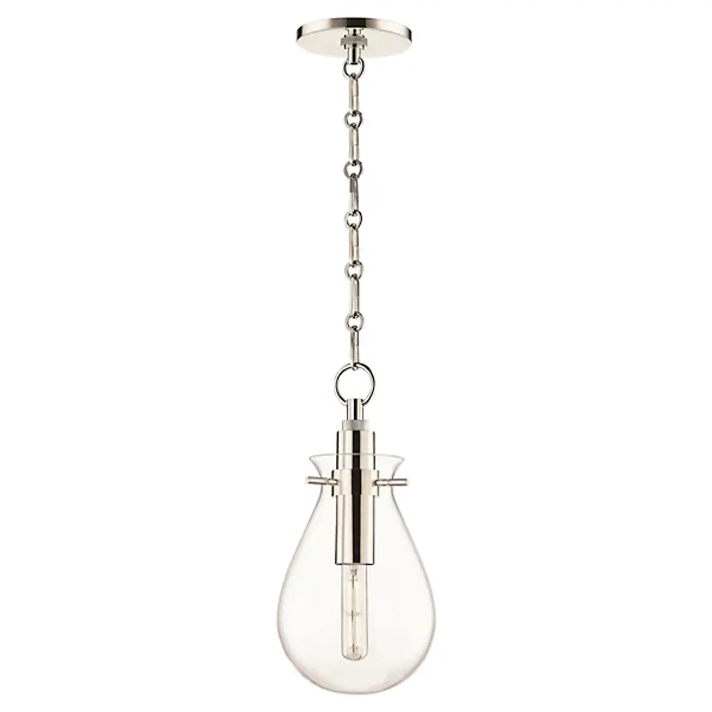 Elegant simplicity with universal appeal. Designed by Becki Owens for Hudson Valley Lighting, the Ivy LED Pendant Light shines in a kitchen, dining room or hallway. Packed with distinctive details, the design showcases an oval and circle Metal chain that draws the eyes down to a prominent ring holder. Knurled fittings lend a coastal industrial flavor to the sleek Metal cylinder socket. Suspended from the fixture, a Glass shade with a Grecian urn-like silhouette creates an eye-pleasing outline to the exposed LED tube bulb. Equivalent to a 40 Watt incandescent light, the replaceable LED bulb provides clear, glare-free illumination above an island in a farmhouse modern kitchen or over a dining table in your breezy coastal inspired dining room.