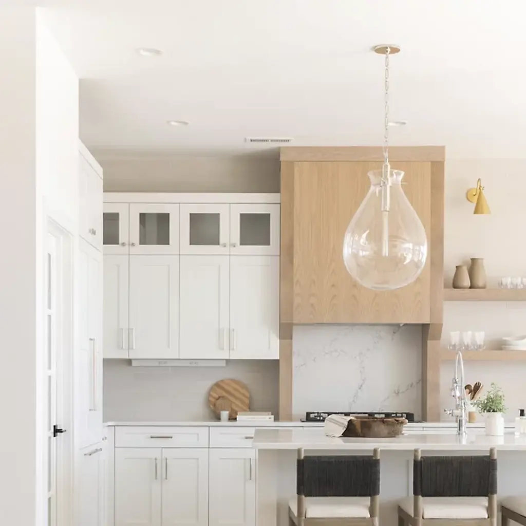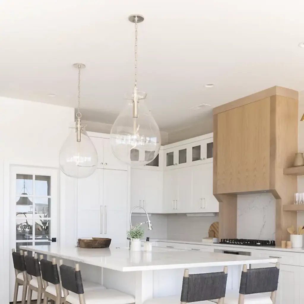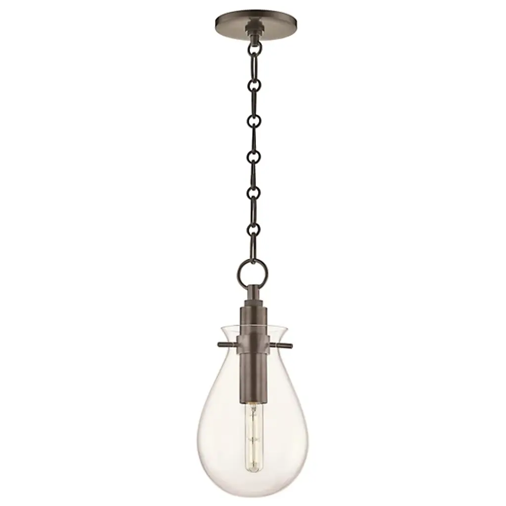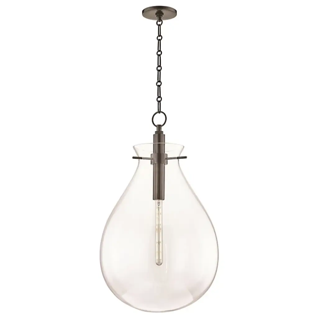 Elegant simplicity with universal appeal. Designed by Becki Owens for Hudson Valley Lighting, the Ivy LED Pendant Light shines in a kitchen, dining room or hallway. Packed with distinctive details, the design showcases an oval and circle Metal chain that draws the eyes down to a prominent ring holder. Knurled fittings lend a coastal industrial flavor to the sleek Metal cylinder socket. Suspended from the fixture, a Glass shade with a Grecian urn-like silhouette creates an eye-pleasing outline to the exposed LED tube bulb. Equivalent to a 40 Watt incandescent light, the replaceable LED bulb provides clear, glare-free illumination above an island in a farmhouse modern kitchen or over a dining table in your breezy coastal inspired dining room.