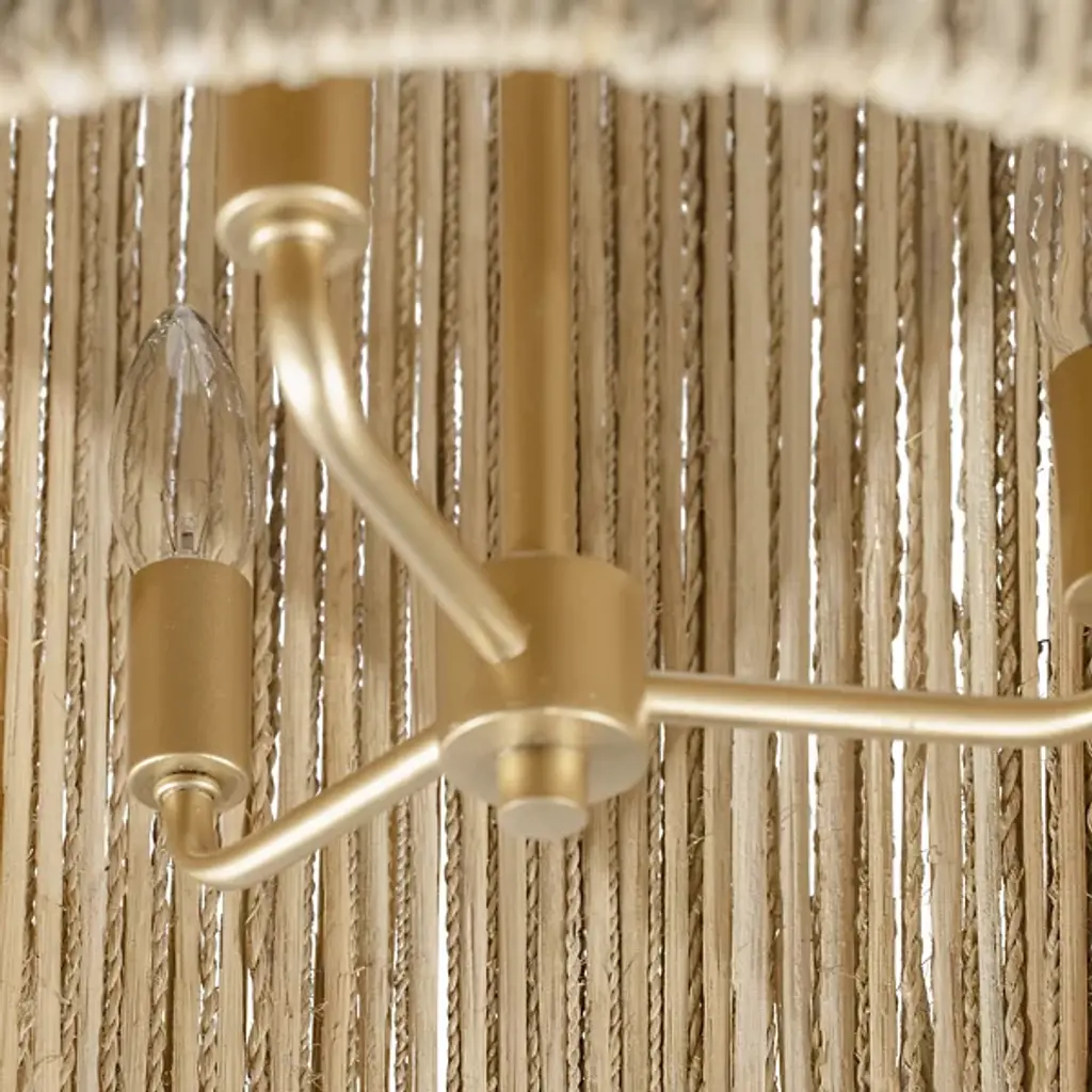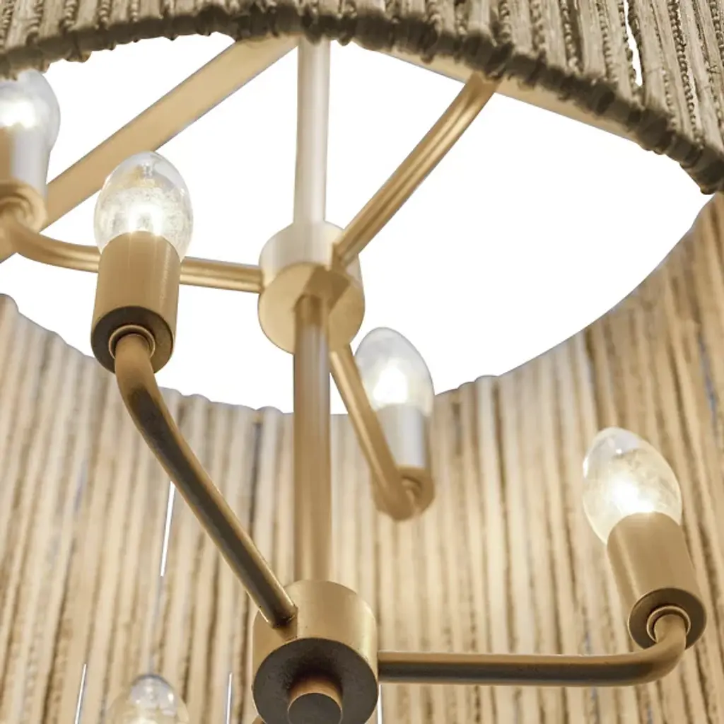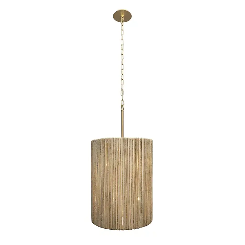 The Jacob's Ladder Pendant from Varaluz is designed by Ron Henderson. This pendant exudes luxury with its intricately textured design, creating a stunning focal point that seamlessly blends transitional elegance with timeless allure. Crafted from recycled steel, the framework showcases a harmonious combination of natural rattan and abaca rope, adding a touch of organic sophistication. Light up your space with the warm and inviting glow of candelabra base LEDs. This pendant is CSA-certified.