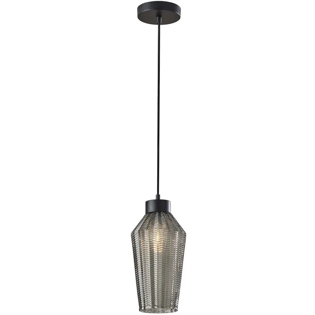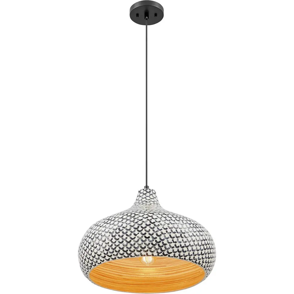 The Savoy House Jade 1-light pendant lets you illuminate your home with natural beauty. Its gourd-shaped shade is crafted from spun bamboo and is adorned with an intricate black fish scale pattern on a white background, creating energetic intrigue. Whether used solo or in groupings, Jade is sure to stand in the spotlight It is 13" in height and 18" in width. Uses one standard size bulb of up to 60 watts. Bulb not included. This fixture is supplied with 120" of hanging cord.