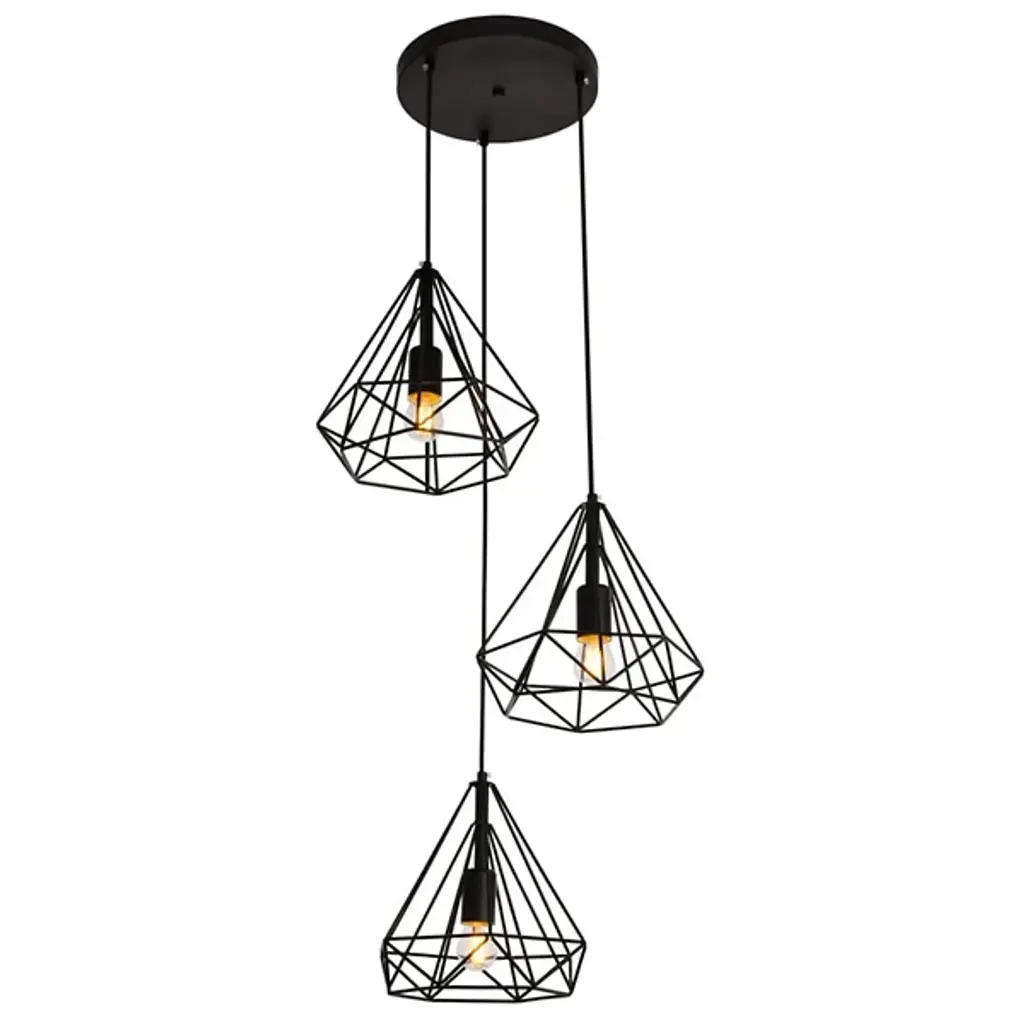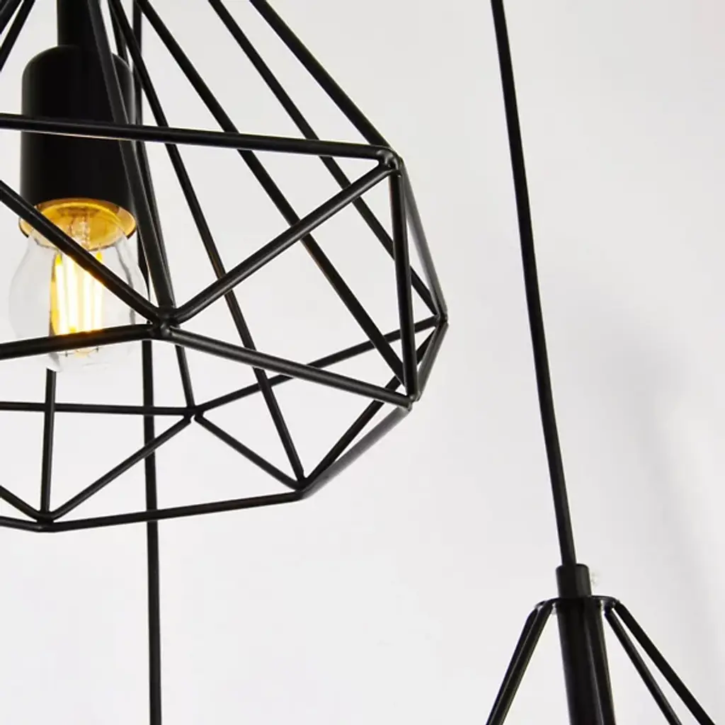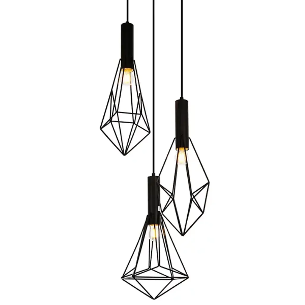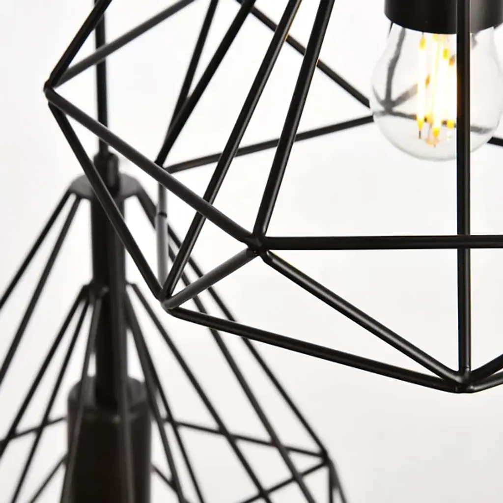 The Jago Multi Light Pendant from Elegant Lighting is a geometric centerpiece suspended in mid-air. This trio of diamond-shaped cages dangles from slender cords. Each enclosure, crafted from iron and aluminum, houses a single bulb that glows like a captured star. Whether clustered tightly for intimate spaces or spread out for grand entrances, the open framework of this pendant allows light to escape in all directions.