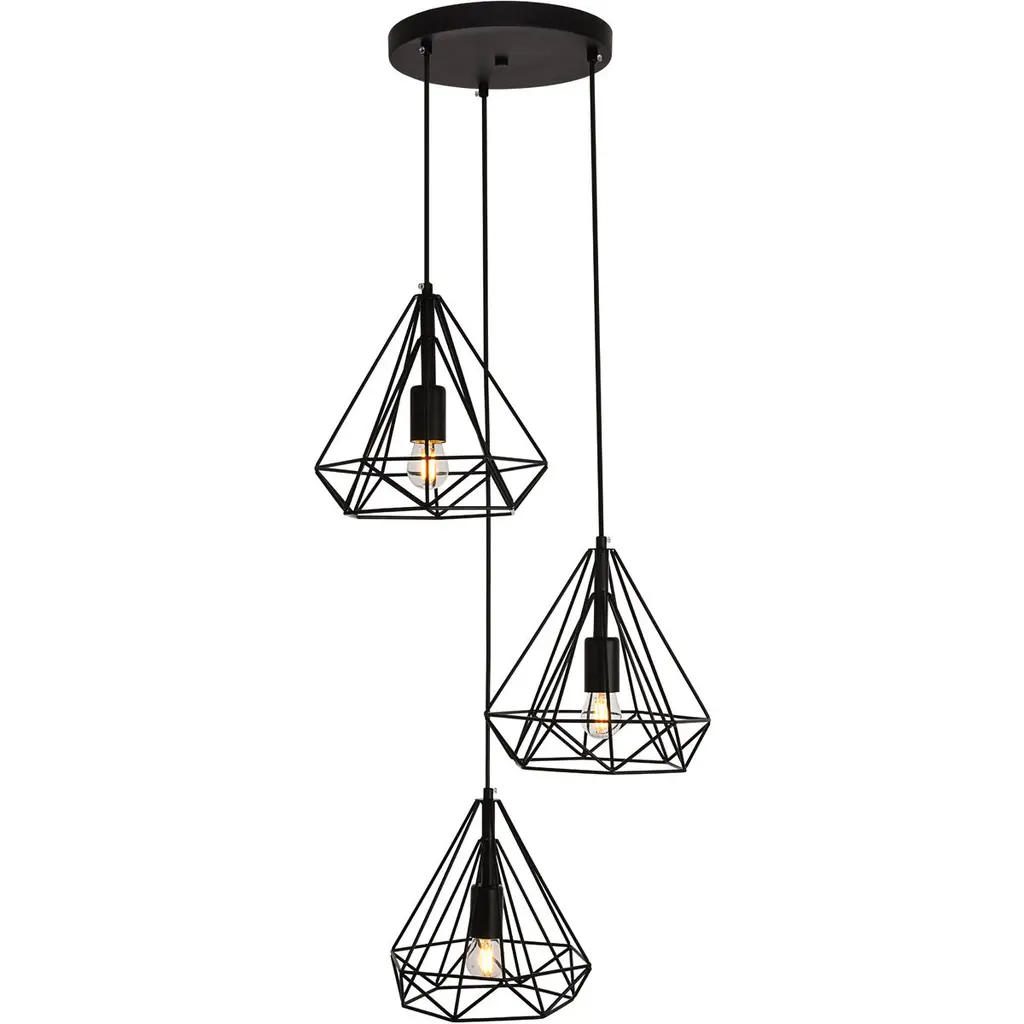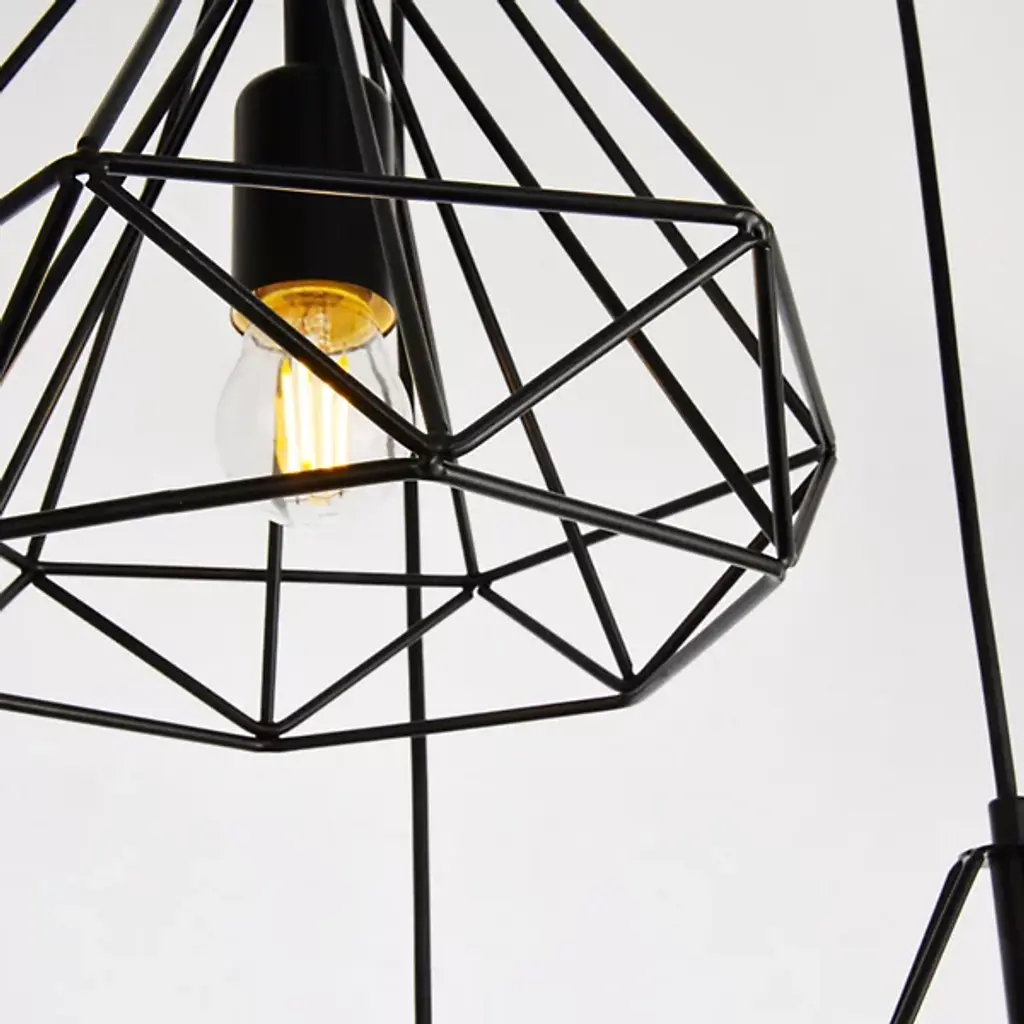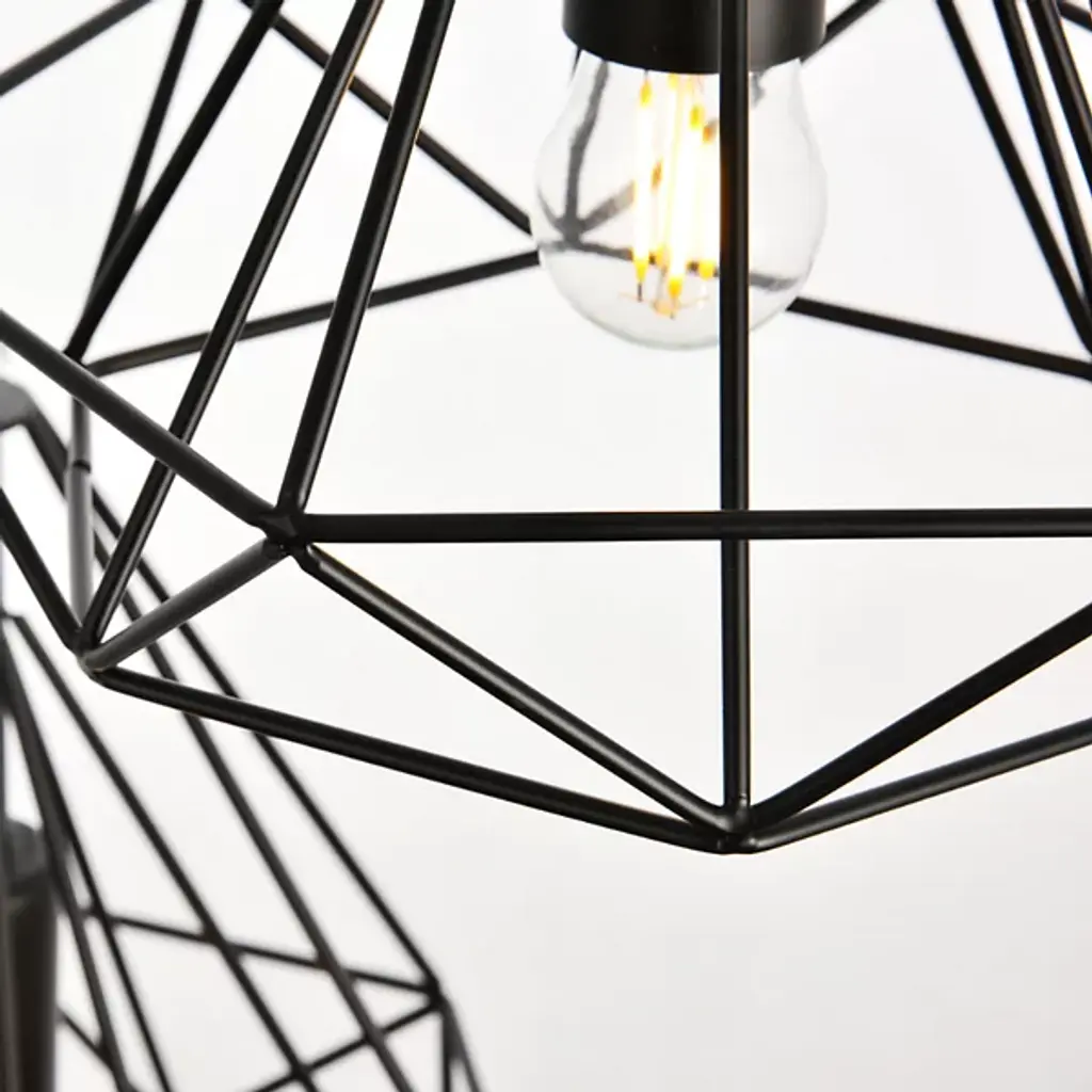 Behold the Jamis LDPD2091 Multi-Light Pendant from Huxe, a captivating fusion of sublime symmetry and contemporary elegance. This pendant, perfectly aligned with current trends, introduces a refreshing ambiance to any space, be it a bedroom, living room, kitchen, or studio. Crafted meticulously from iron and aluminum, it features slender rods that intricately form complex, faceted gem-shaped shades in a strong black finish. Suspended gracefully by slim cords and a circular canopy, this pendant emanates an industrial vibe with a minimalist allure. Enhanced by exposed lamping at the heart of each open frame, it exudes vintage charm, culminating in a truly remarkable aesthetic.