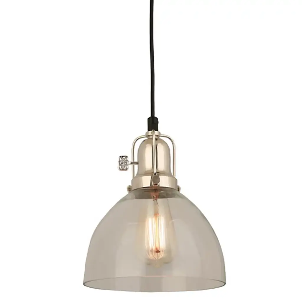 The Jasper Mini Pendant by Hi-Lite is a sleek, industrial-style design with a beautifully finished metal top and a smooth, dome-shaped glass shade. Suspended by a single cord, the graceful shape of the shade in this design looks lovely while still allowing the visible bulb within to shine freely, offering plenty of illumination to surroundings. The metal cap features some structural and hardware detailing that lends a thoughtful touch to the overall look of this handsome piece.