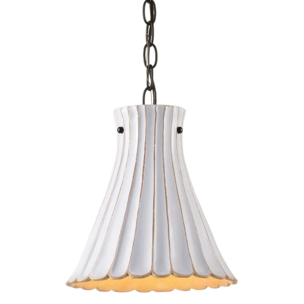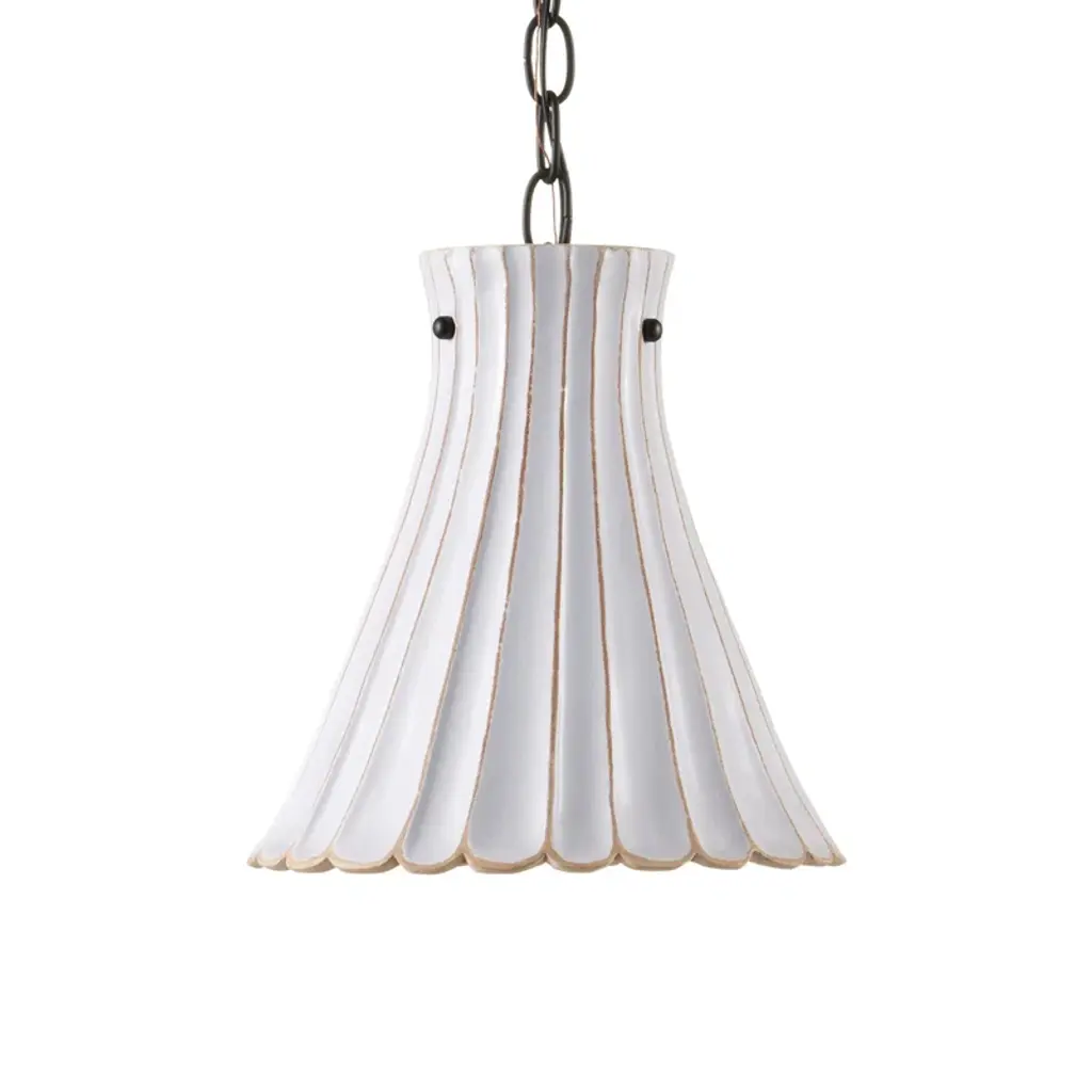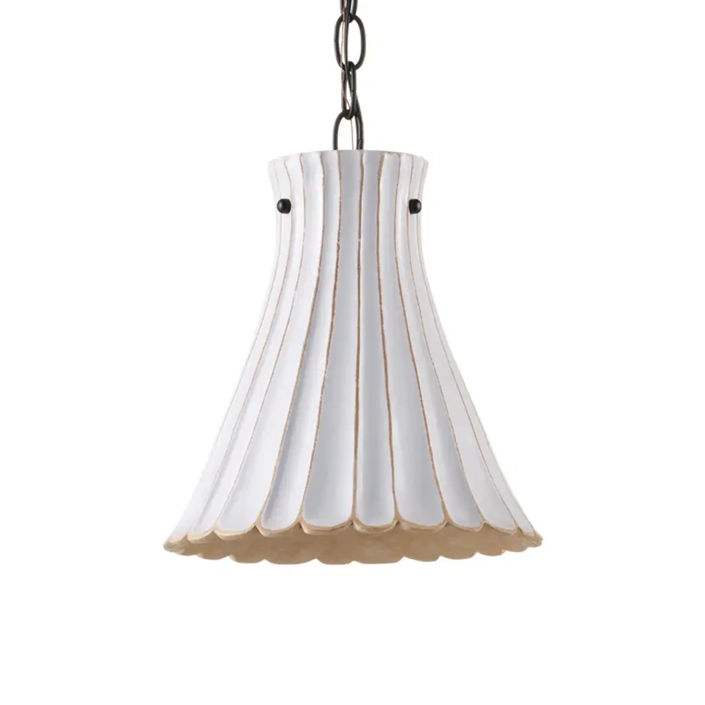 The Jazz pendant has a fluted silhouette that culminates at the bottom in scallops for a retro vibe. A snowy white crackle finish covers the hand-thrown terracotta shade to give the white pendant a simple modern look. This is one of our fixtures that is perfect for clustering or hanging in rows.