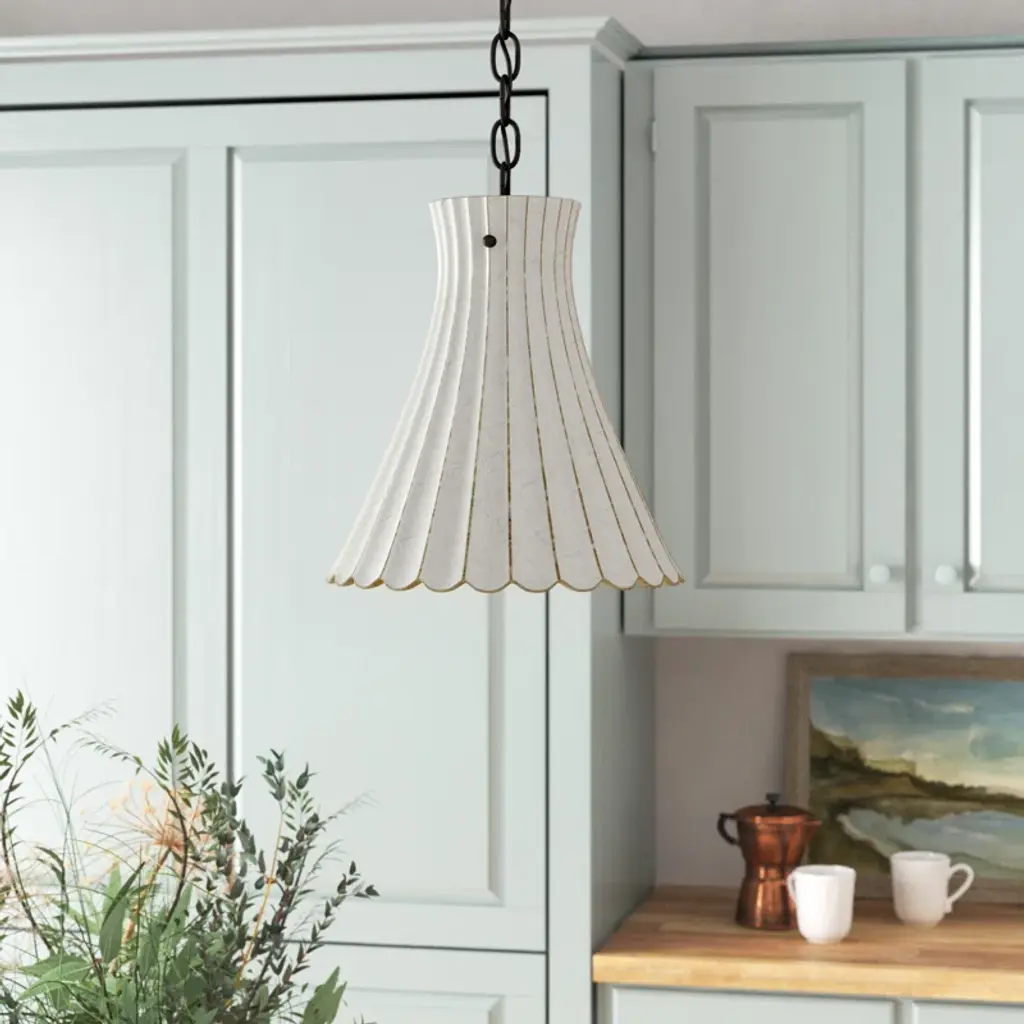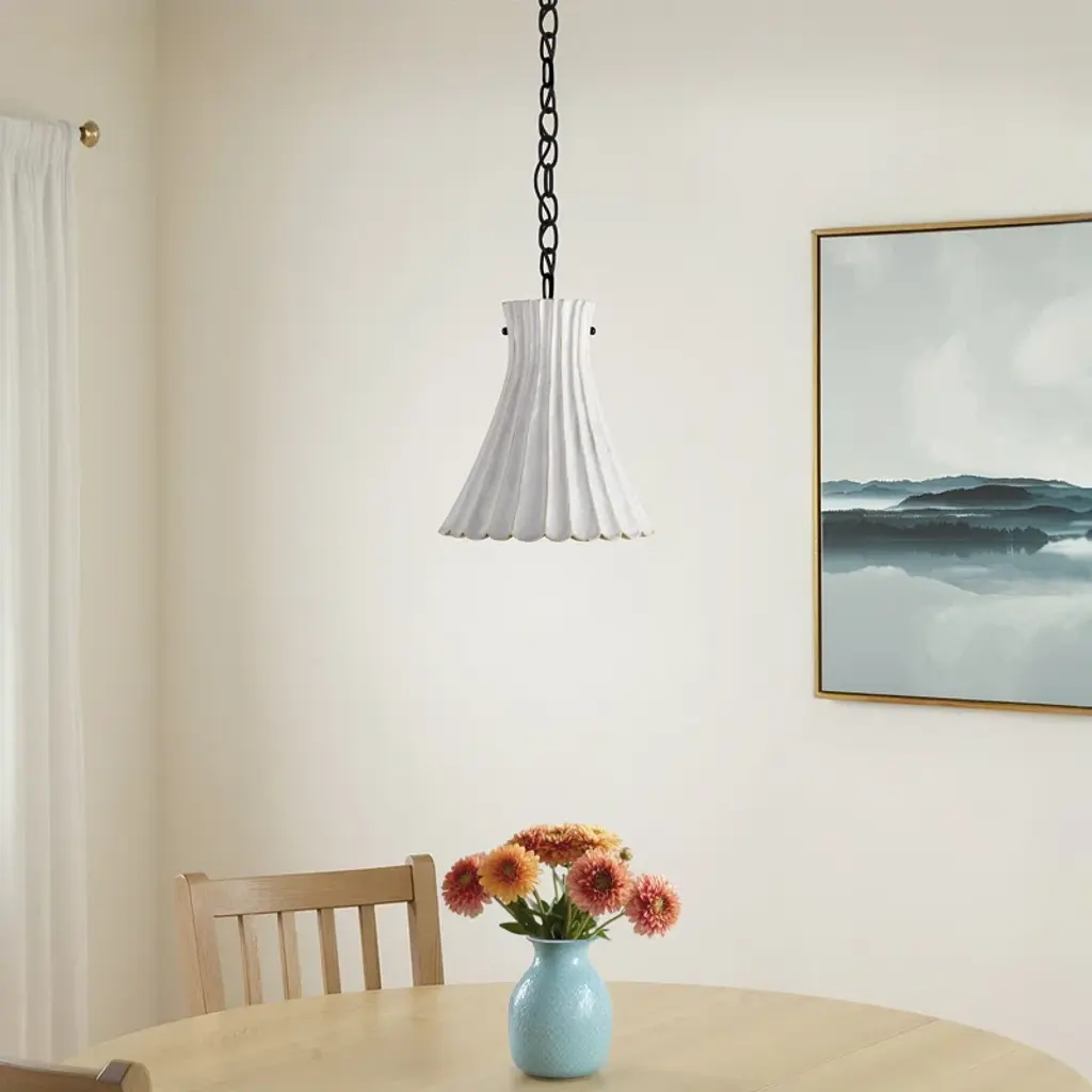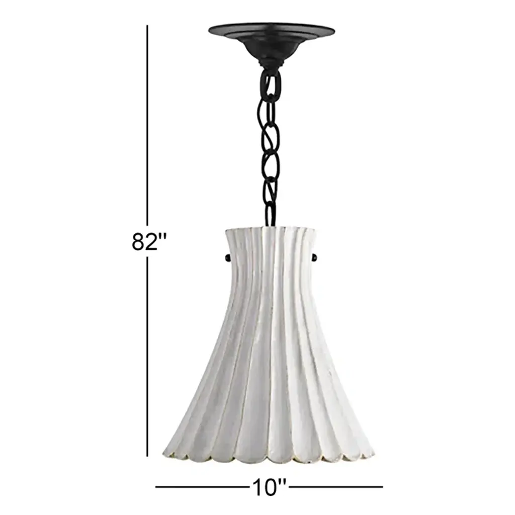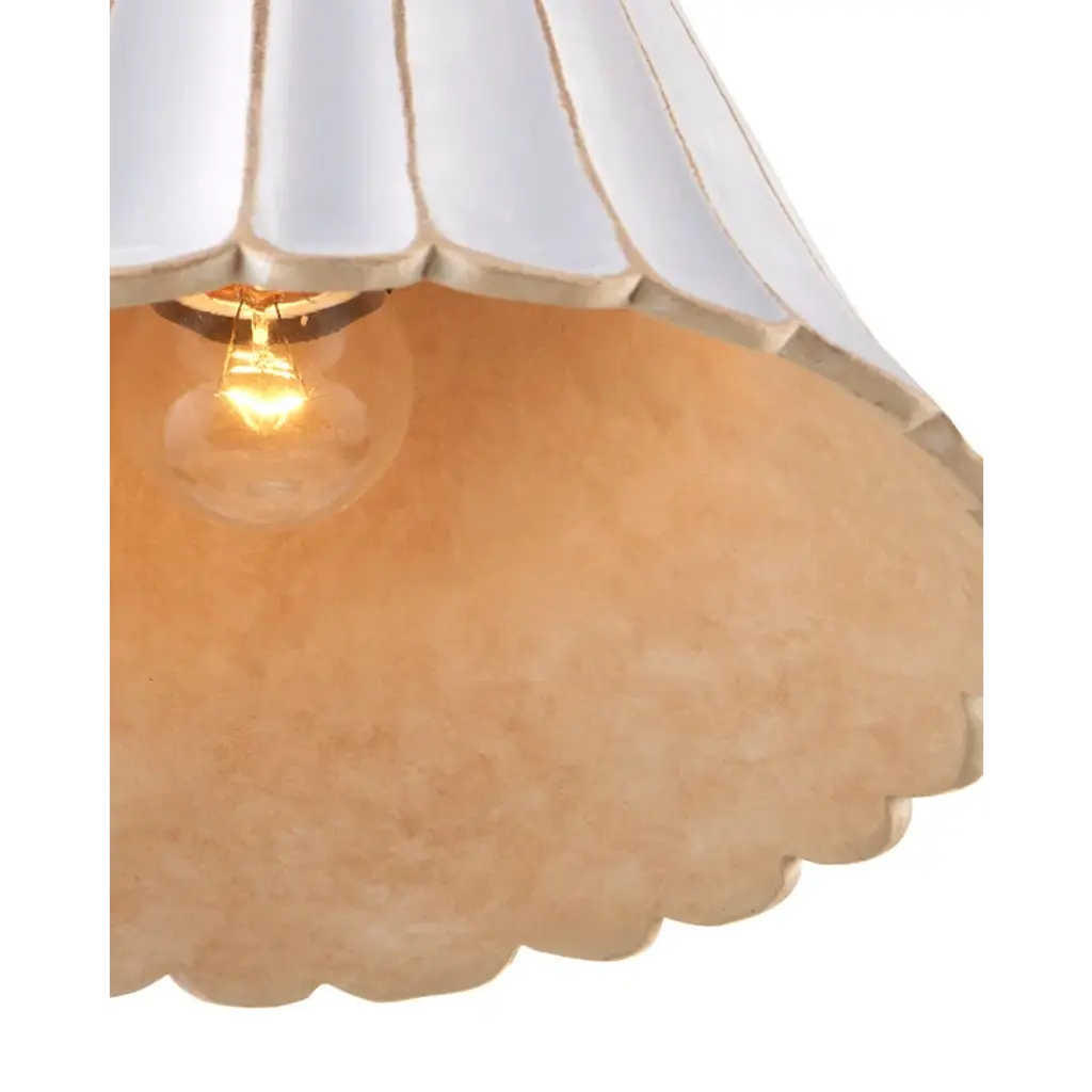The Jazz pendant has a fluted silhouette that culminates at the bottom in scallops for a retro vibe. A snowy white crackle finish covers the hand-thrown terracotta shade to give the white pendant a simple modern look. This is one of our fixtures that is perfect for clustering or hanging in rows.