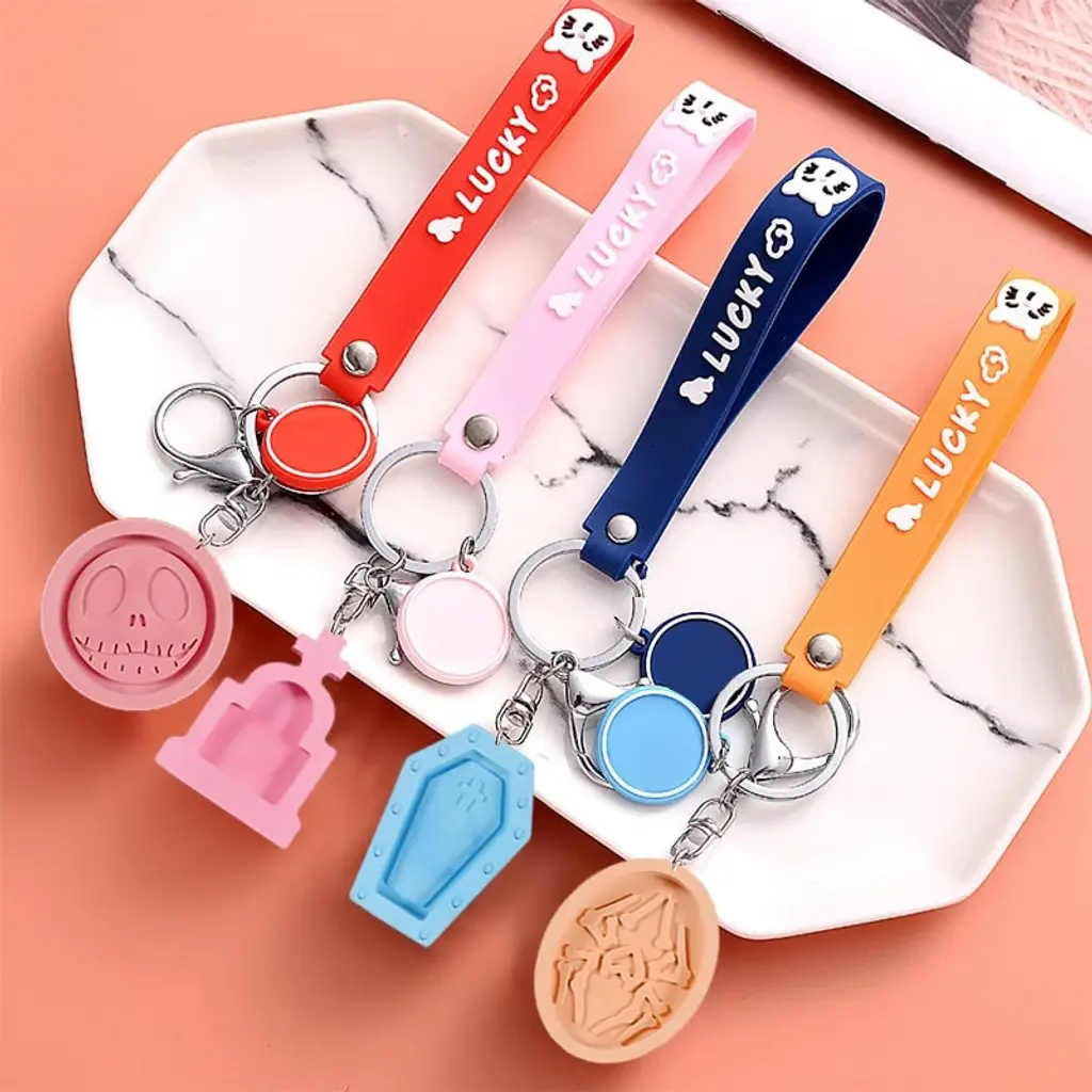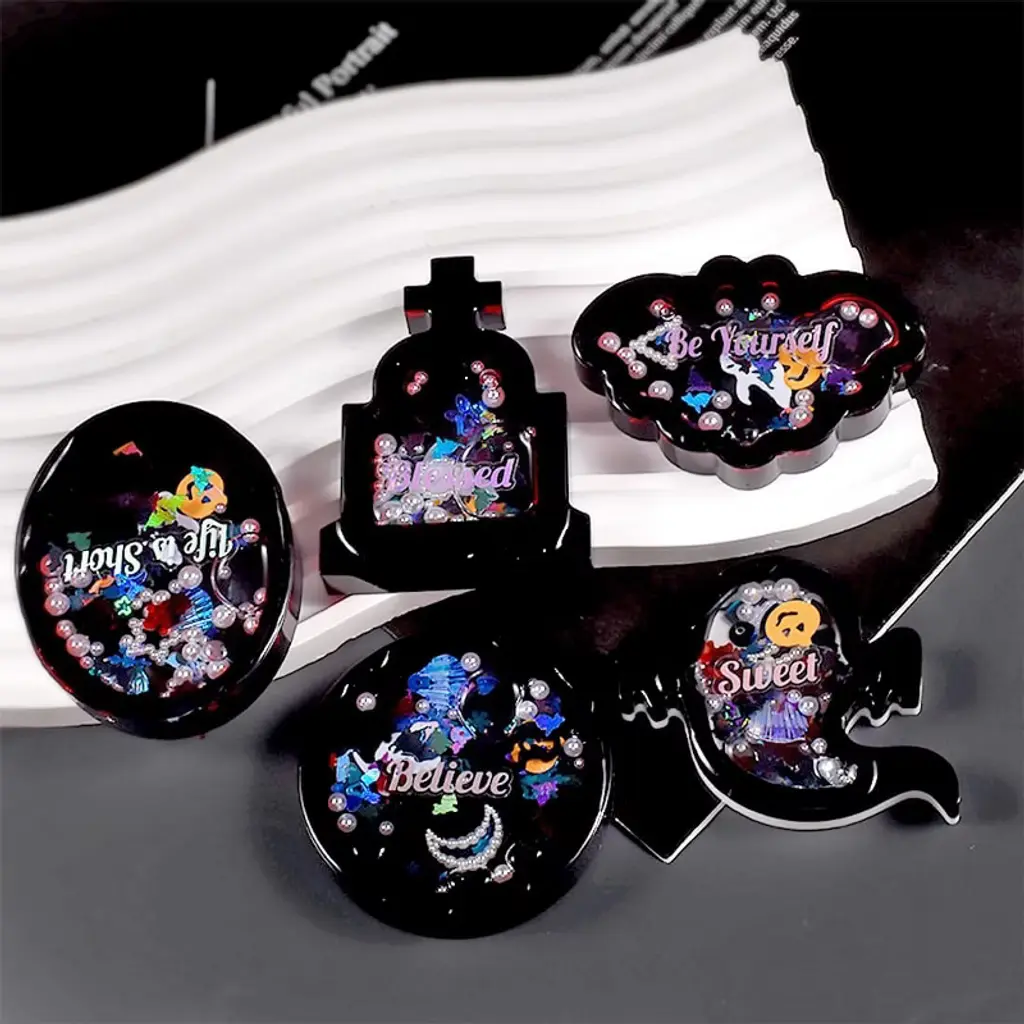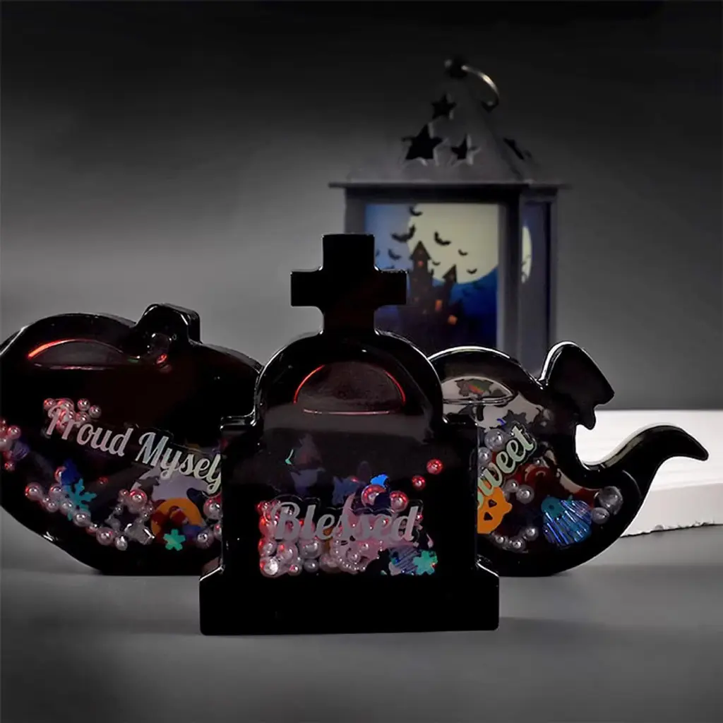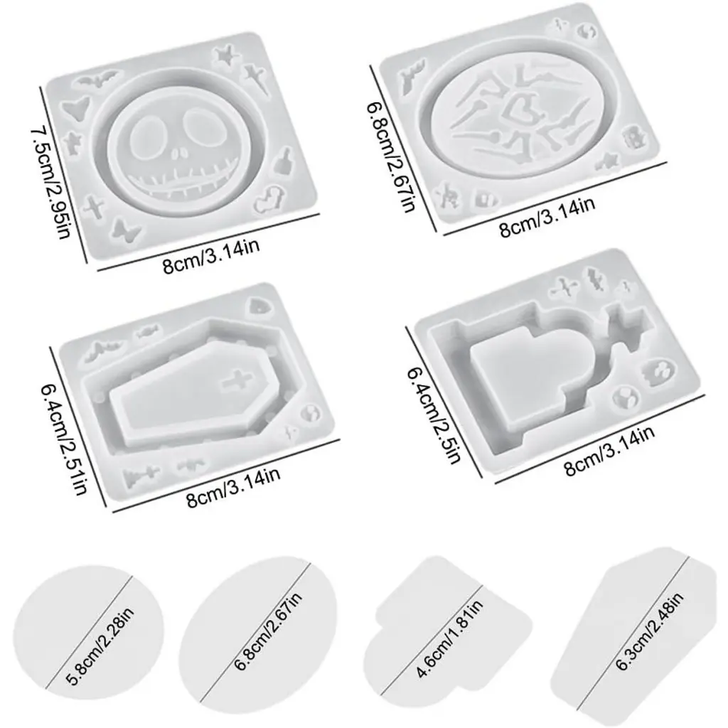 What’s In The Set This Halloween resin mold pack comes with 4 quicksand silicone molds, each in spooky, festive shapes: Devil Smiley: Approx. 7.5×8×1.1cm Skull Skeleton: Approx. 8×6.8×1.1cm Coffin: Approx. 8×6.4×1.1cm Tombstone: Approx. 8×6.4×1.1cm Premium Silicone Material Crafted from high-quality silicone, these molds are soft, elastic, and built for repeated use. Their smooth surface ensures cured creations pop out easily—no sticking or damage, keeping every detail intact. DIY Fun For Shaker Crafts Create eye-catching "waterfall" pendants or quicksand charms by adding glitter, beads, floating accents, confetti, or colorful mix-ins. Use quicksand oil, water, or water-glue blends to boost the dynamic, shimmery effect. Versatile Uses Turn your resin projects into everyday or festive pieces: necklaces, pendants, keyrings, gift tags, or home decor. The molds work with epoxy resin, casting resin, wax, and soap—great for multiple crafting styles. Perfect Handmade Gift Customize molds with dried flowers, pearl pigment, mica powder, or sequins to make one-of-a-kind art. It’s an ideal gift for Halloween, Valentine’s Day, Christmas, Thanksgiving, or birthdays to share warm wishes with friends and family.