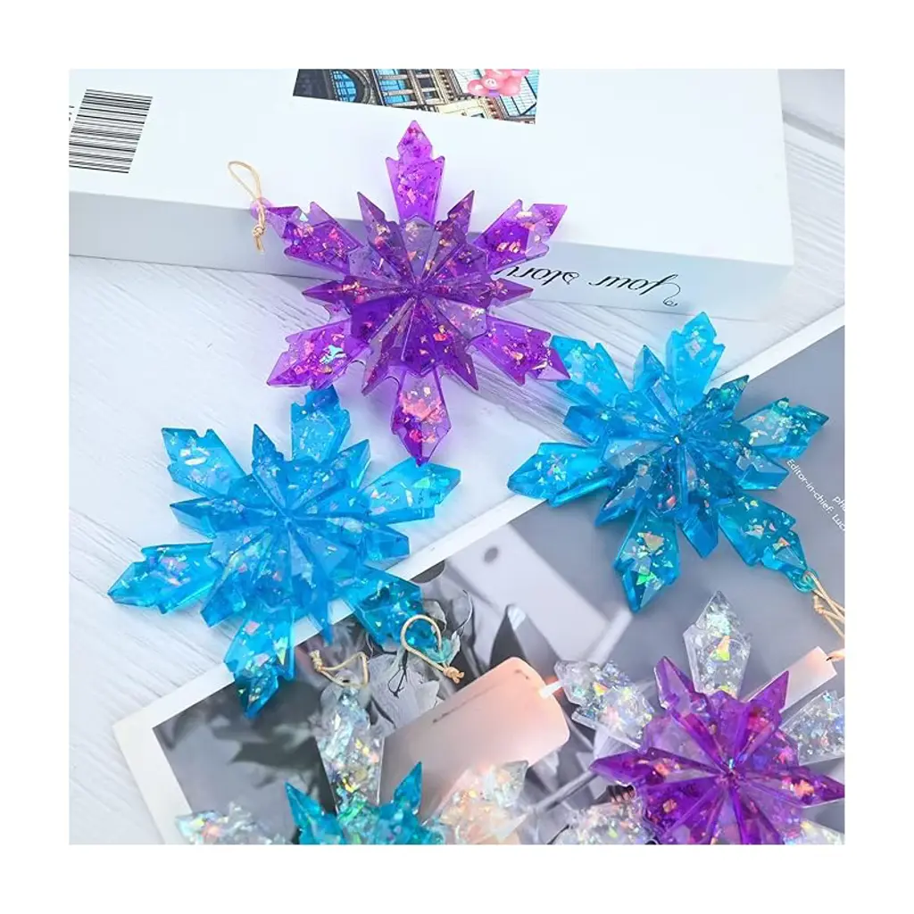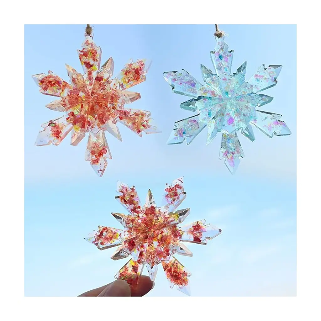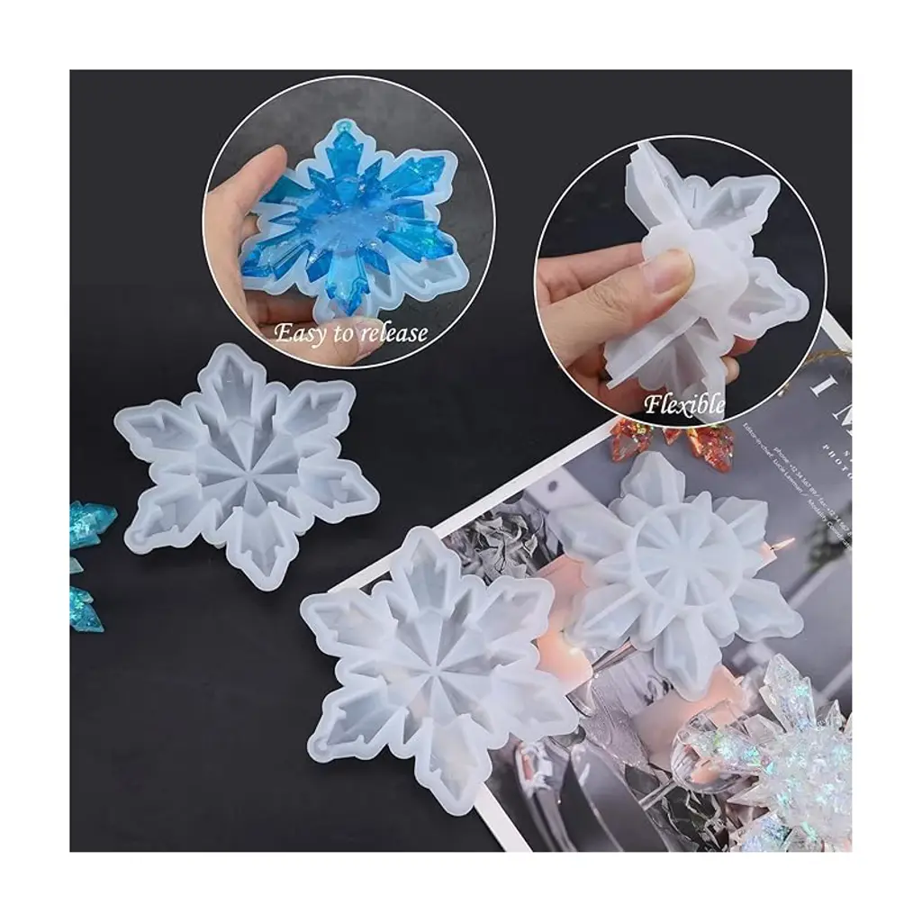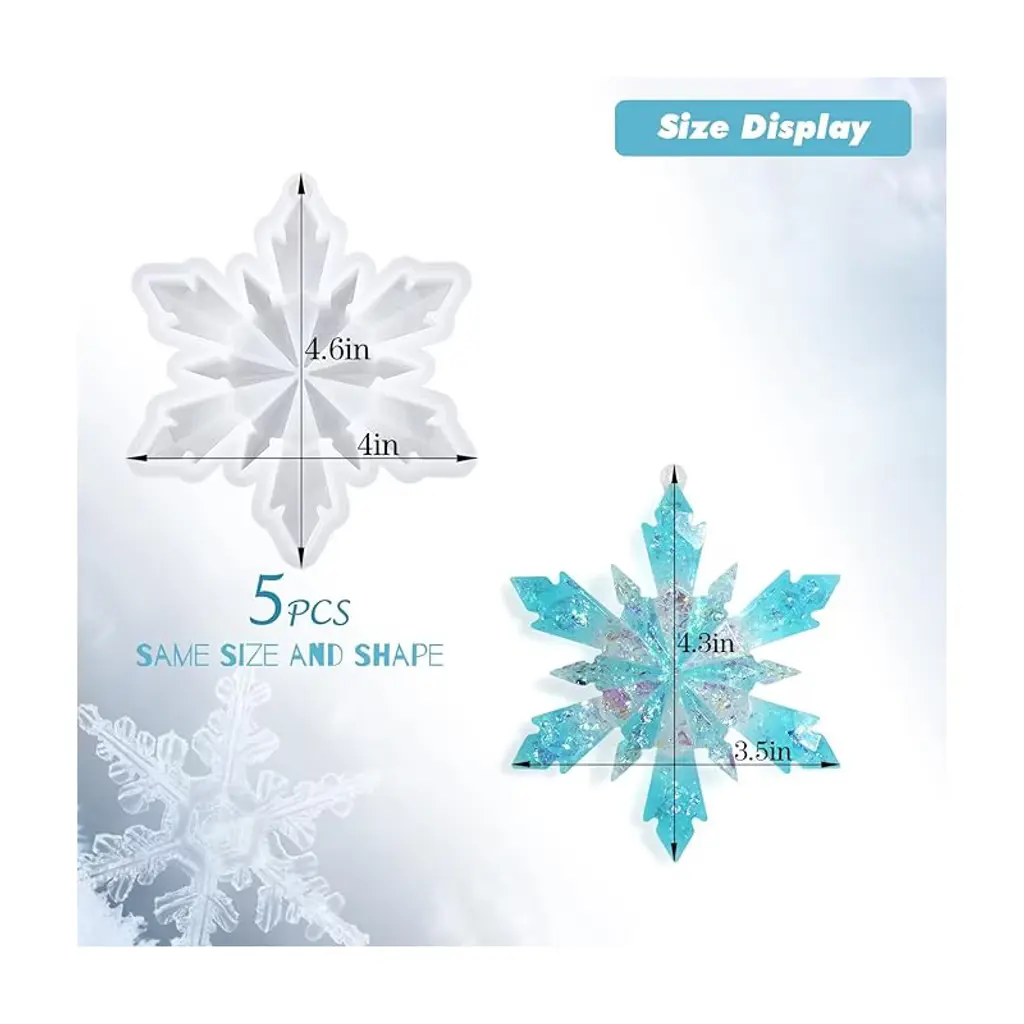 Snowflake resin molds kit-5pcs Large snowflake silicone molds are offered to you, size 4.5*3.9 inch can be used for your DIY demands: home decorative ornaments, crafts, Christmas tree ornaments.Silicone Snowflake Casting Molds-Made of quality silicone, our epoxy resin molds are durable and flexible, resistant to tearing, reusable and easy to fall off, you can apply for a long time. Perfect for your DIY handwork and give you a wonderful resin-making experience.Epoxy Casting Resin Molds-simply use a straw to drop the epoxy resin in the middle part of molds, when laid flat, it will automatically extend to the tiny area, please pay attention to the amount of epoxy resin; You can also add glitter to the glue and adjust it according to your preferences, just use your imagination.Christmas Resin Molds Ornament- you can design with different pattern as you like, add different fillers like glitter, dried flowers, mica powder or any element you like as decoration. The finished craft has shiny glossy surface, great handmade christmas gifts for your family/friends create your own beautiful crafts.DIY Epoxy Resin Molds - These silicone molds for epoxy resin can be applied to DIY different handwork such as home ornament, coaster, keychain, party decorations and so on, pretty and realistic appearance will draw other's attention easily.
