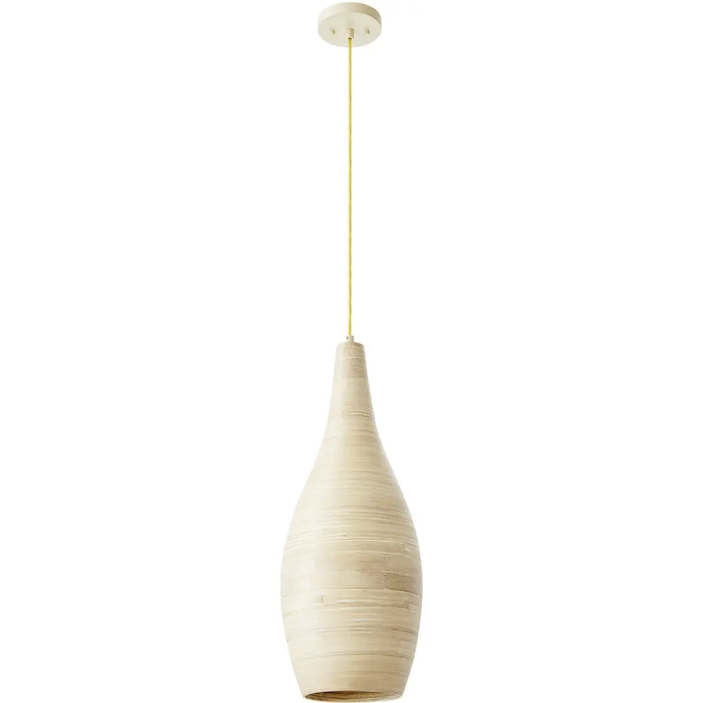 The Savoy House Jean 1-light pendant lets you illuminate your home with natural beauty. Its tall, slim gourd-shaped shade is crafted from spun bamboo and imparts organic allure. Whether used solo or in groupings, Jean is sure to stand in the spotlight It is 25.5" in height and 10" in width. Uses one standard size bulb of up to 60 watts. Bulb not included. This fixture is supplied with 120" of hanging cord.