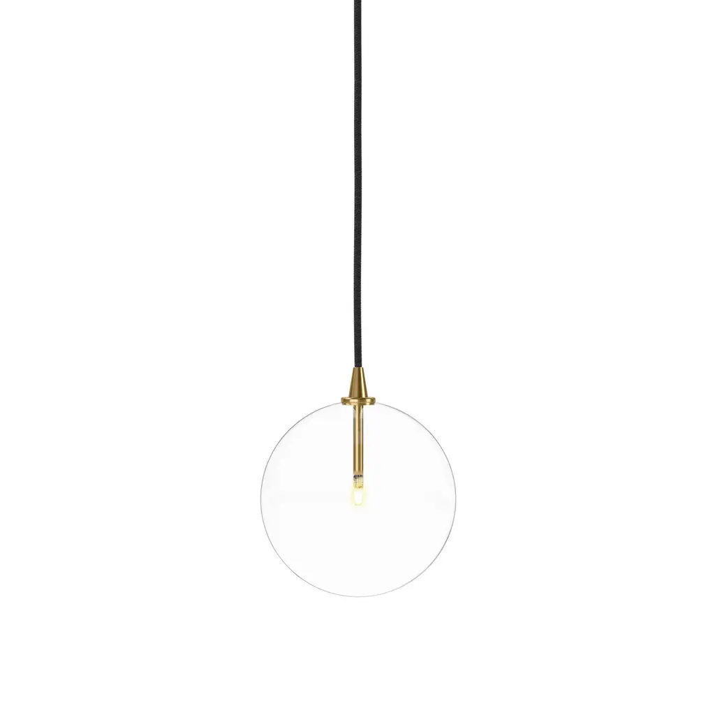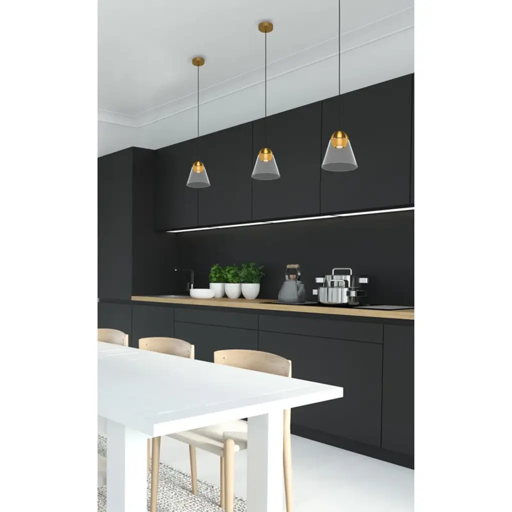Add a touch of glamorous style and warm overhead lighting to your interiors with the Jeffery Single Light Integrated LED Pendant. With Brushed Brass Accent holding the Integrated Light source surrounded by the Clear Glass Cone Shaped Shade adds a touch of luxe appeal while bringing extra opulence when the Light shines through. The adjustable black hanging cord and Brushed Brass Canopy add the finishing touches to this Pendant.