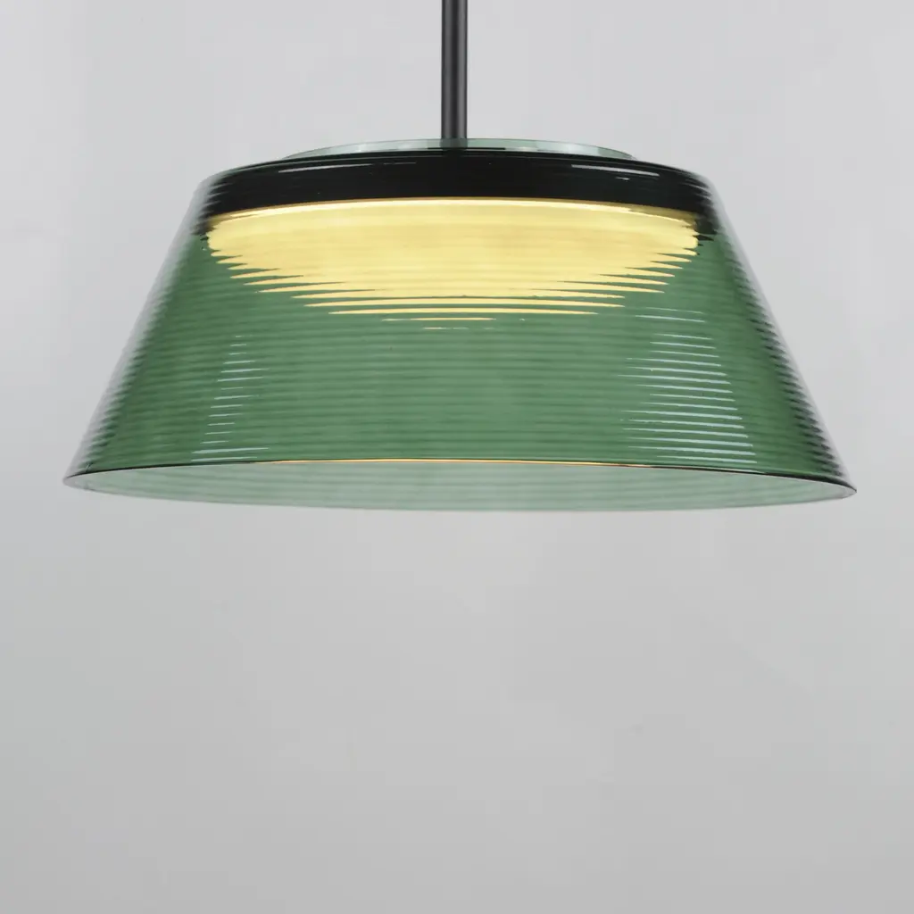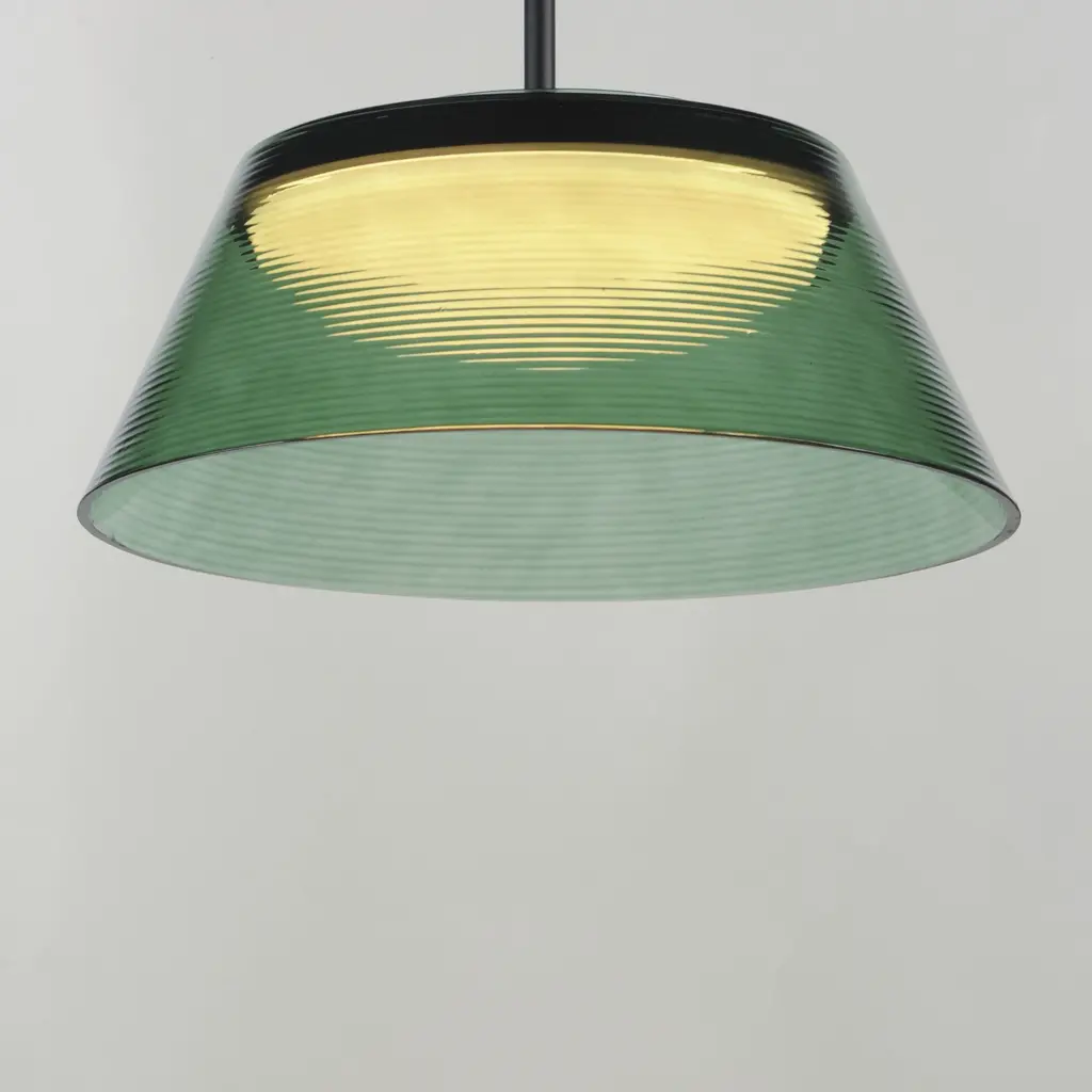 A tapered, ribbed glass shade adds a contemporary edge to a simple design. Available in Clear Ribbed glass with a plated Gold frame or in Emerald Green or Smoked glass with Matte Black frames. These retro-futuristic shades minimize peripheral glare, while a Matte White acrylic shallow domed diffuser softly disperses LED lighting, delivering ample illumination. The collection includes versatile pendant and flush mount options, with the latter doubling as a wall sconce.