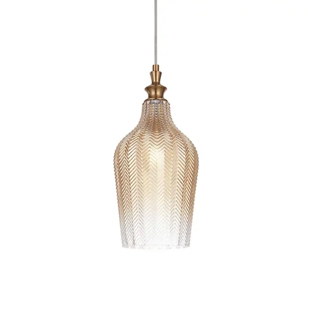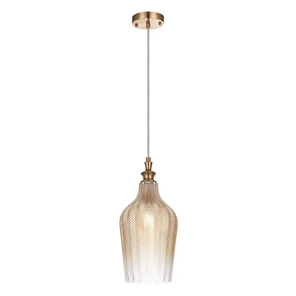Add charm to any space in your home with the Jessalyn Mini Pendant from Alder & Ore. A simple form full of intricate, appealing details, this piece starts with a thin fabric cord that leads to a flowing metal lamp base. The shade widens with grace as it drops down into the room. Made of chevron textured glass, it holds a single bulb that shines a bright and full glow through the material, adding elegance and charm to the space as the intricate chevron pattern comes to life.