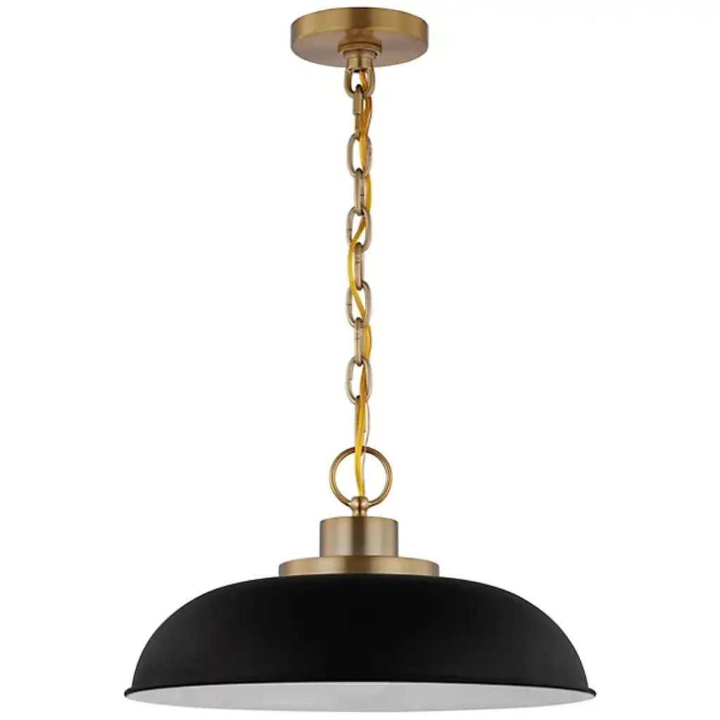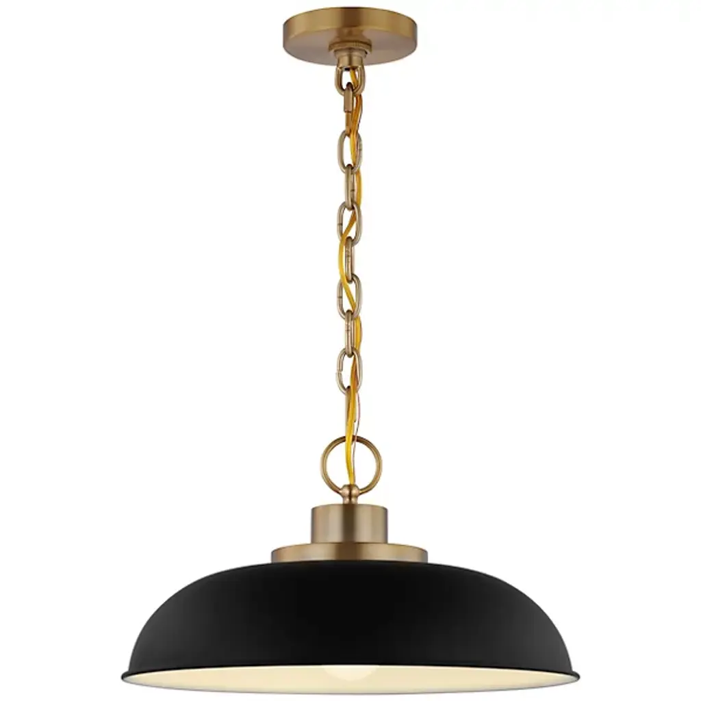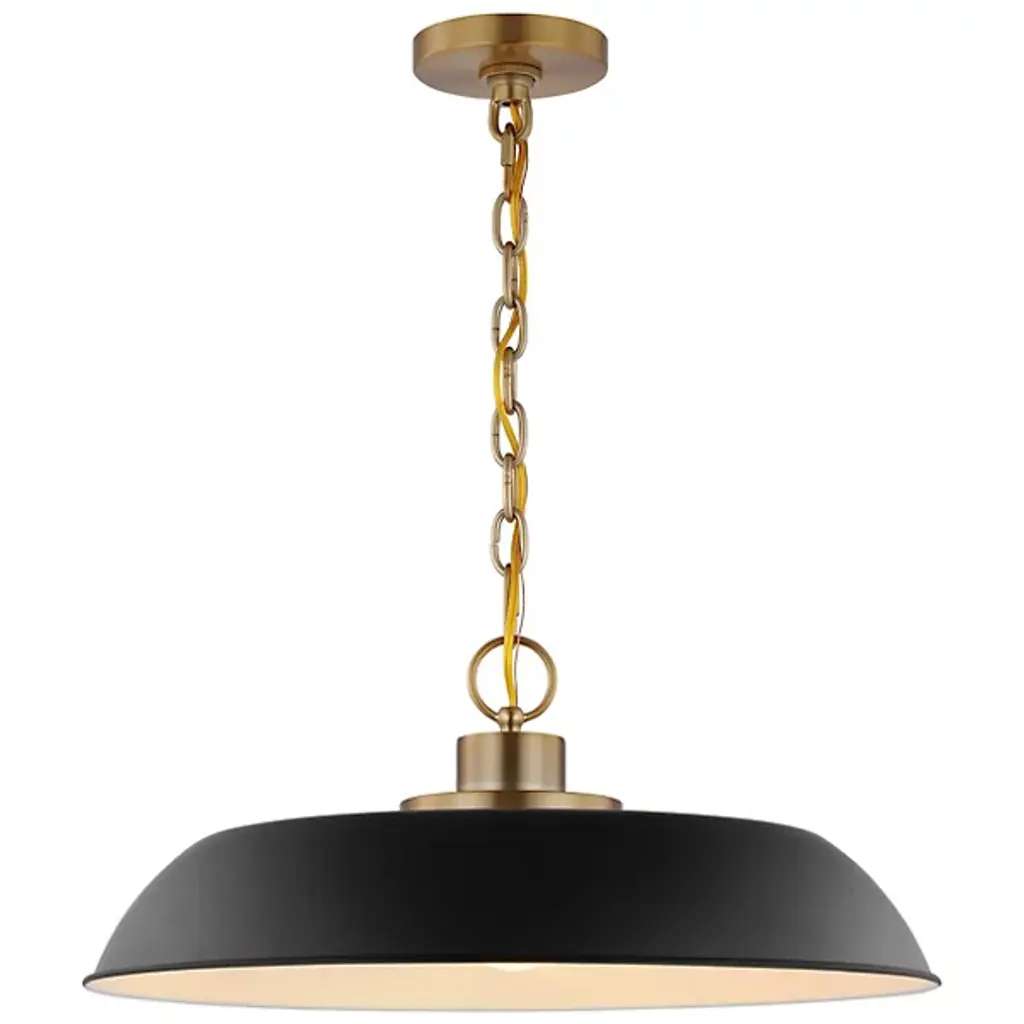 A chic addition to the home's modern décor. The Jet Pendant from Alder & Ore makes its presence felt at any time of day. It cascades down with an elegant chain-link underscored by a rich metallic finish. Stepped metal shapes atop the shade define the pendant's dressy 2-toned look. The metal shade spreads out in a deep shape that reduces glare from the sides. The inside of the shade is painted white to create a pleasantly diffused visual from below. The singular bulb glazes the inside of the shade a golden hue as it fans out a cozy down glow.