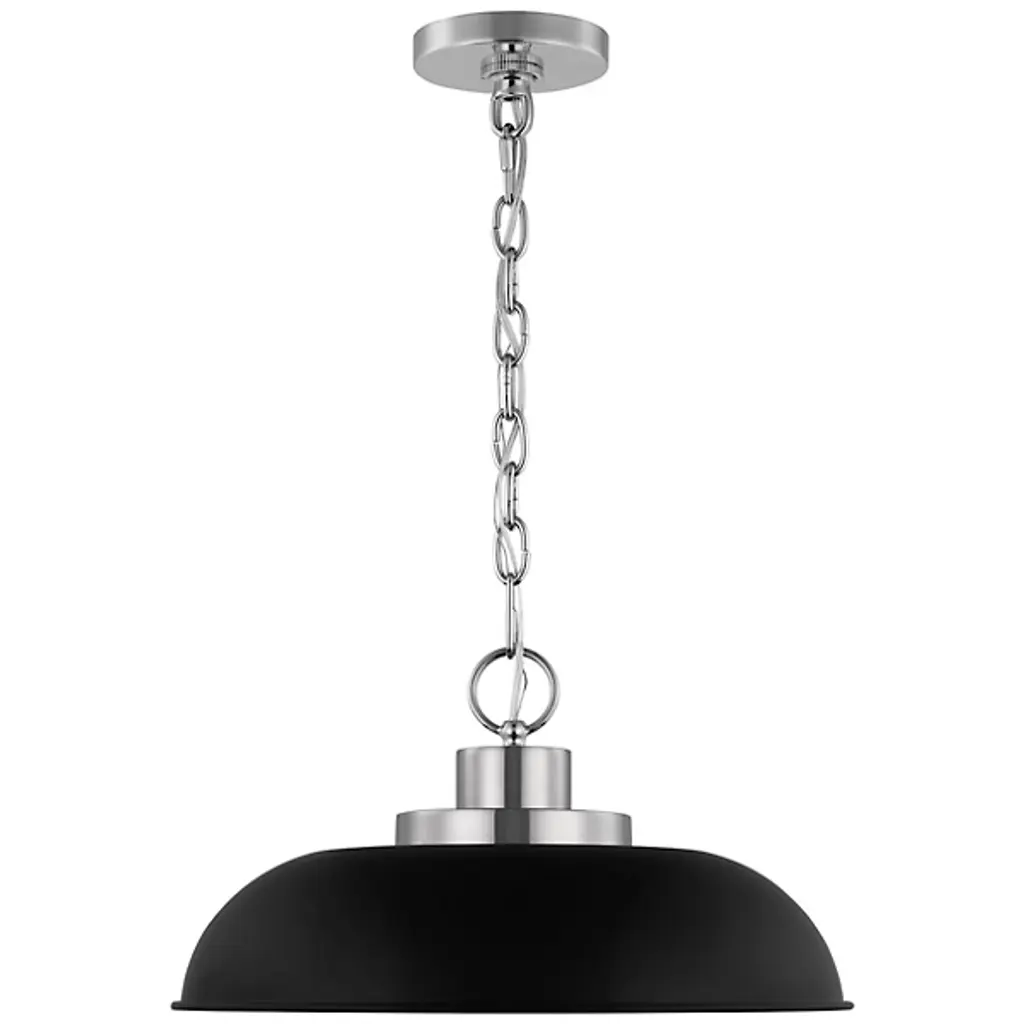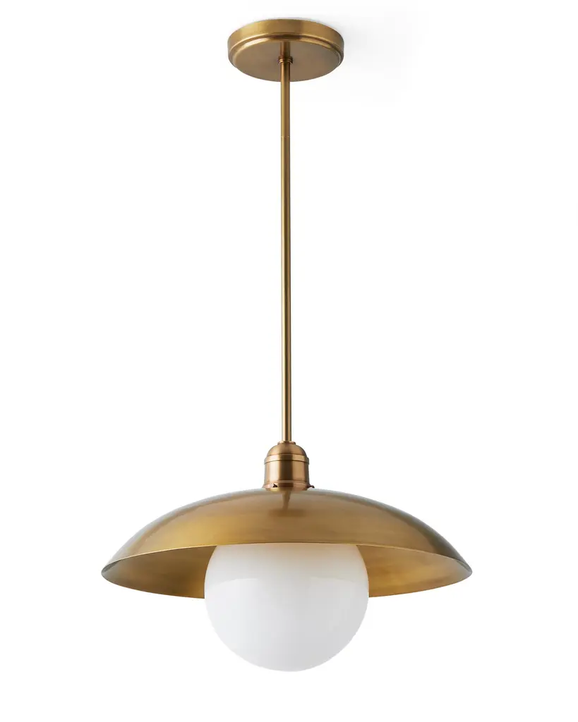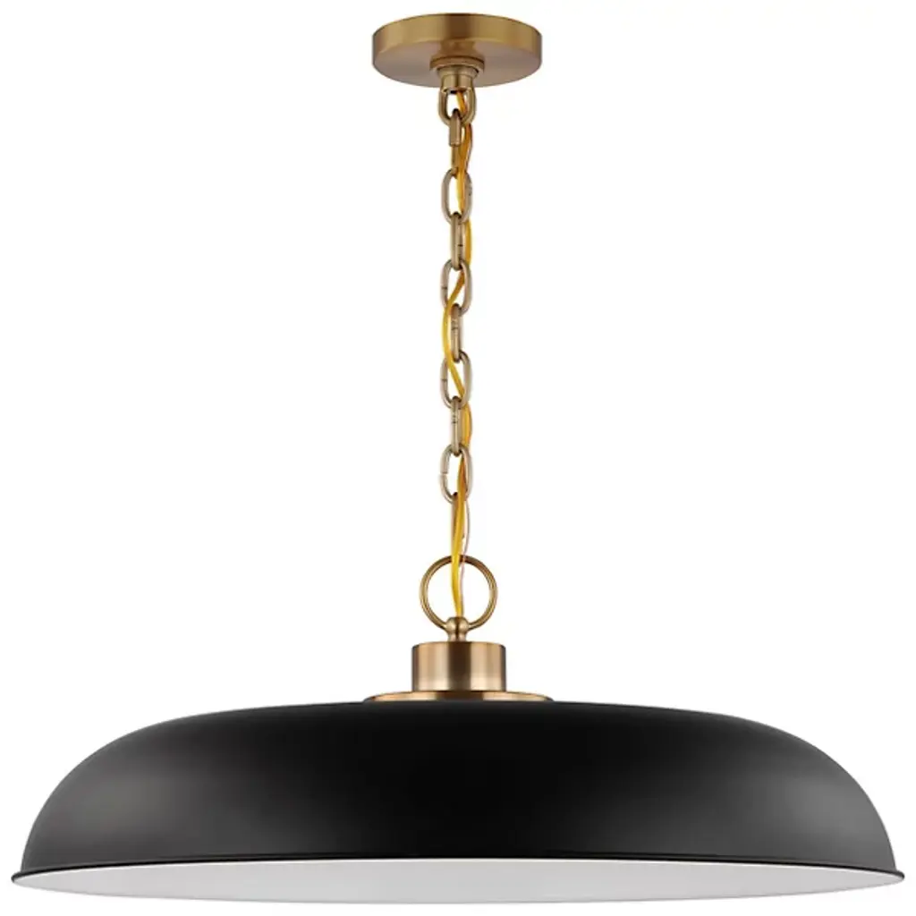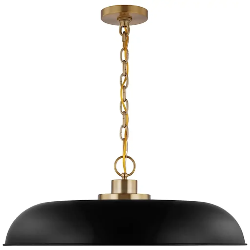 A chic addition to the home's modern décor. The Jet Pendant from Alder & Ore makes its presence felt at any time of day. It cascades down with an elegant chain-link underscored by a rich metallic finish. Stepped metal shapes atop the shade define the pendant's dressy 2-toned look. The metal shade spreads out in a deep shape that reduces glare from the sides. The inside of the shade is painted white to create a pleasantly diffused visual from below. The singular bulb glazes the inside of the shade a golden hue as it fans out a cozy down glow.