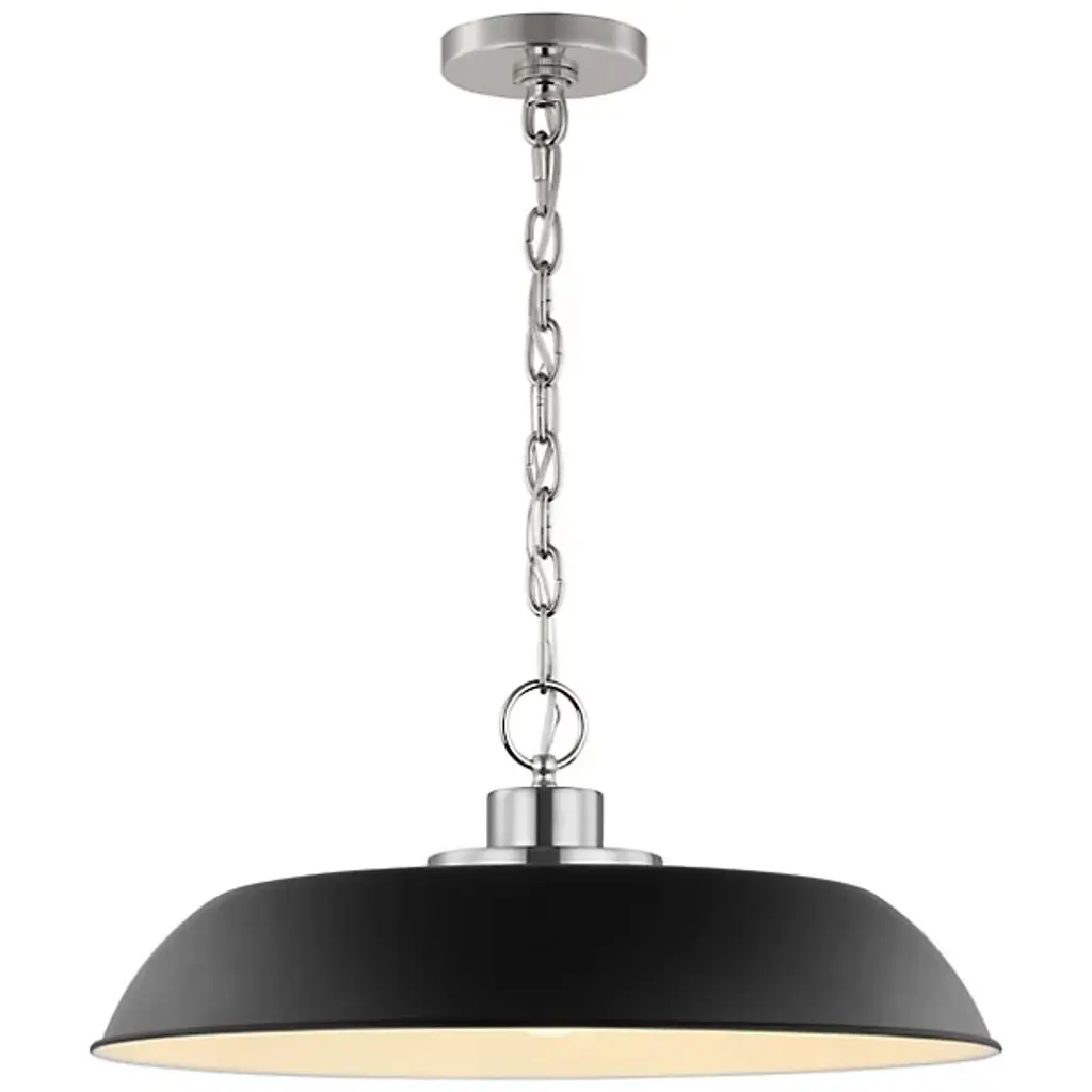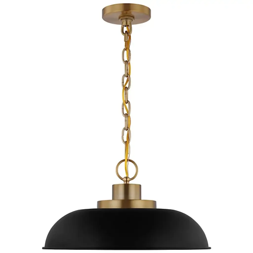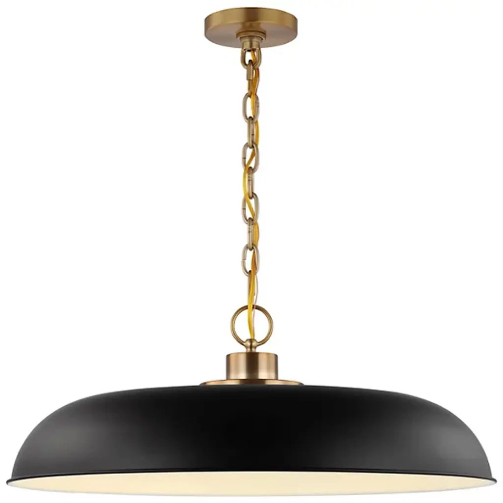 A chic addition to the home's modern décor. The Jet Pendant from Alder & Ore makes its presence felt at any time of day. It cascades down with an elegant chain-link underscored by a rich metallic finish. Stepped metal shapes atop the shade define the pendant's dressy 2-toned look. The metal shade spreads out in a deep shape that reduces glare from the sides. The inside of the shade is painted white to create a pleasantly diffused visual from below. The singular bulb glazes the inside of the shade a golden hue as it fans out a cozy down glow.