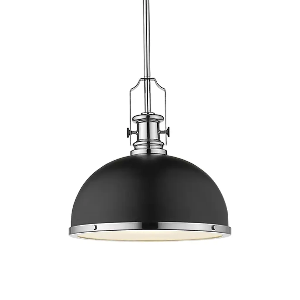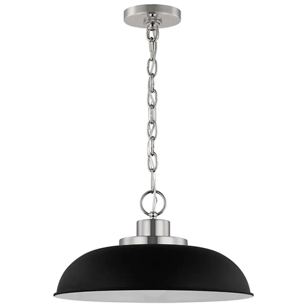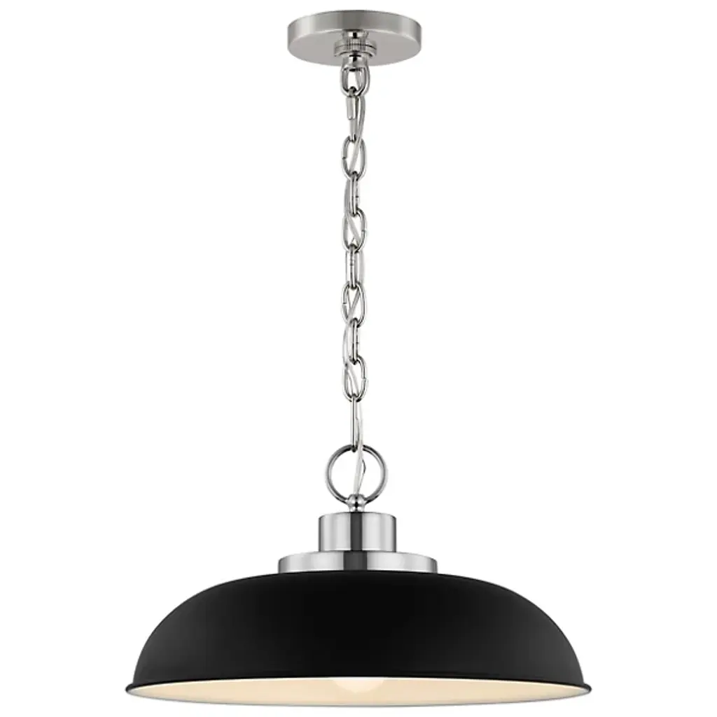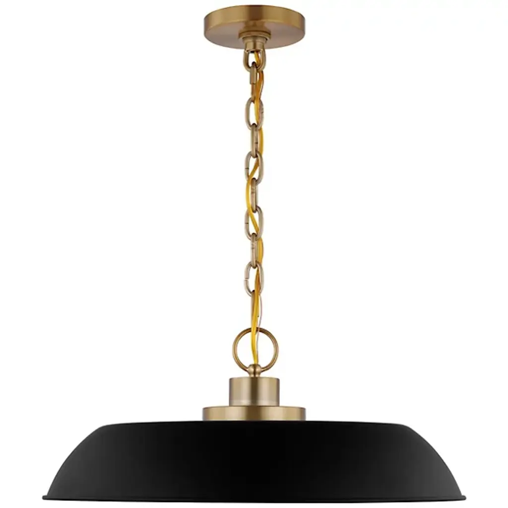 A chic addition to the home's modern décor. The Jet Pendant from Alder & Ore makes its presence felt at any time of day. It cascades down with an elegant chain-link underscored by a rich metallic finish. Stepped metal shapes atop the shade define the pendant's dressy 2-toned look. The metal shade spreads out in a deep shape that reduces glare from the sides. The inside of the shade is painted white to create a pleasantly diffused visual from below. The singular bulb glazes the inside of the shade a golden hue as it fans out a cozy down glow.