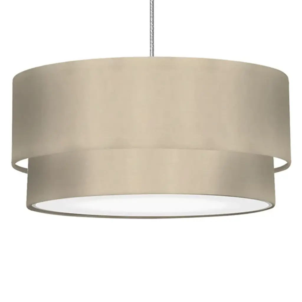 The Jewels Double Pendant from Seascape Lamps brings warmth and texture to interiors. Suspended from a circle canopy by a single cable, this layered fixture features two stacked, circular shades made from faux felt for a soft, tactile finish. Each pendant is made to order in Seascape’s studio, offering crafted detail and custom character. The inset diffusers provide a gentle, even glow, while the narrow shade walls cast subtle shadows that add depth to the even, ambient light.