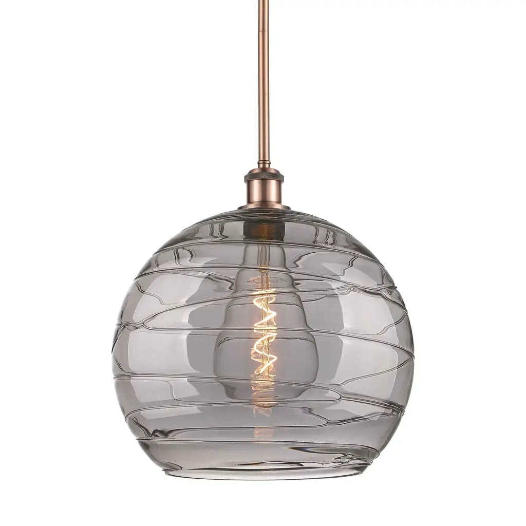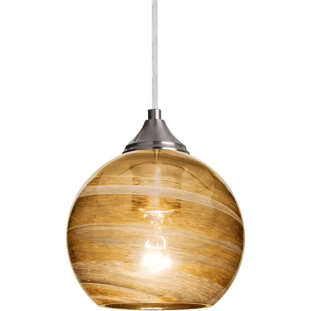 The Jilly Amber Vapor Pendant is a contemporary design composed of a transparent Amber globe glass, with a mysterious vapor-like patterning throughout the glass to partially conceal the inner portion of the shade. The play of light through the vapor decor makes for a pleasing optical affect, enhanced by the exposed light source positioned inside the shade. The cord pendant fixture is equipped with a 10' SVT cordset and an low profile flat monopoint canopy. These stylish and functional luminaries are offered in a beautiful brushed Bronze finish.