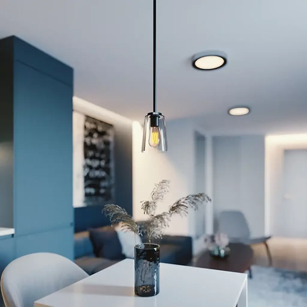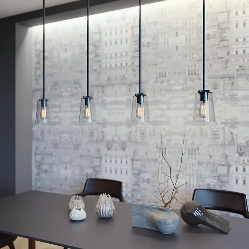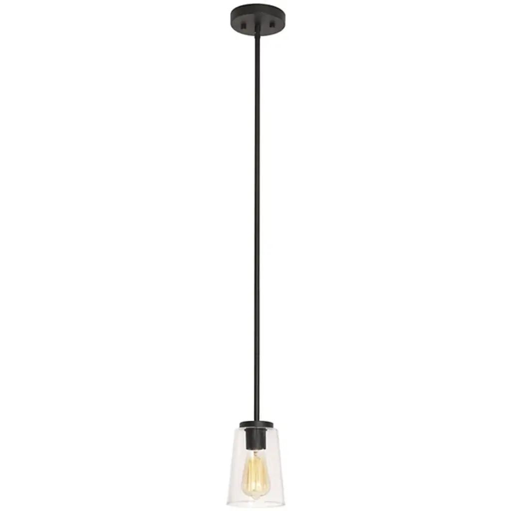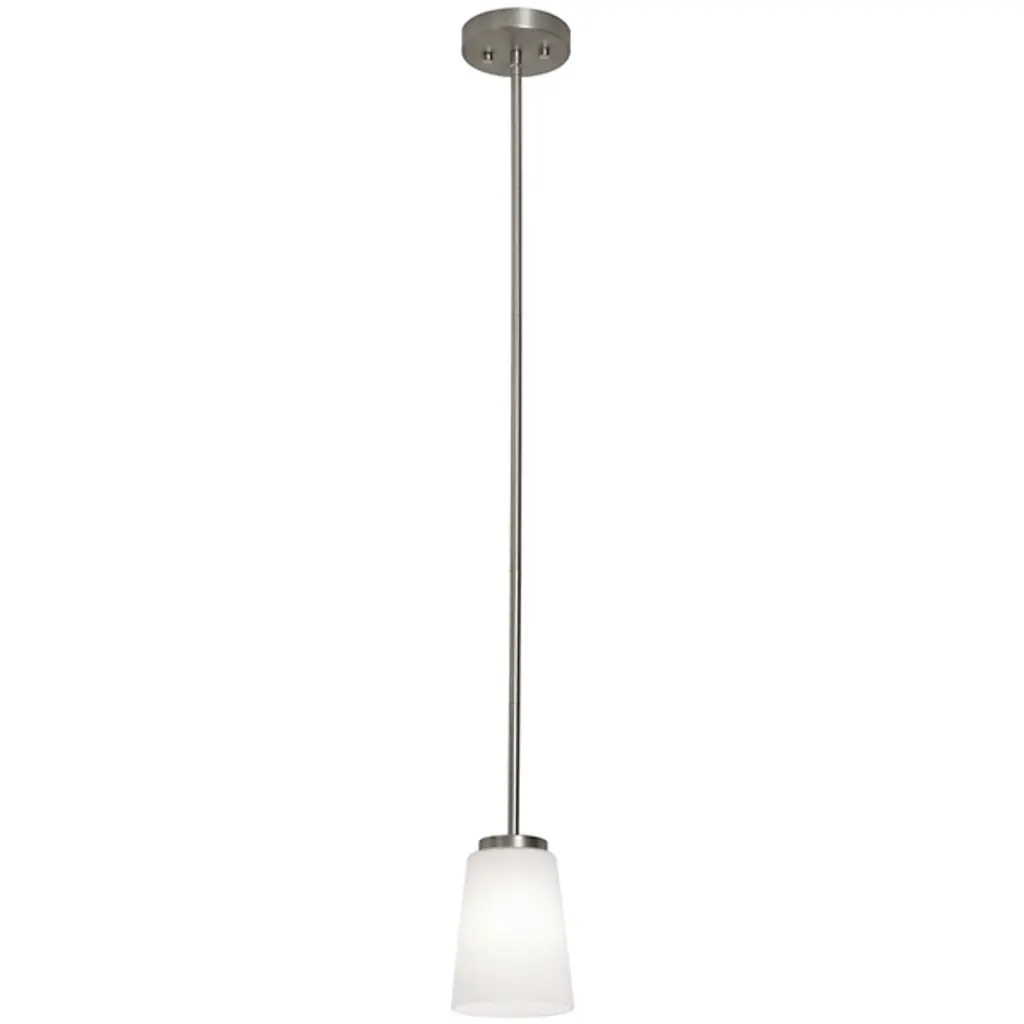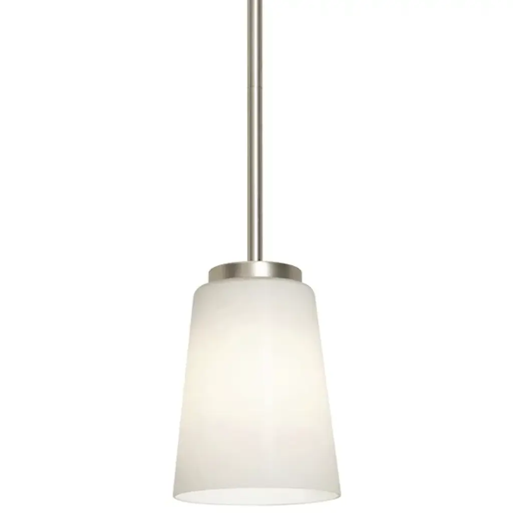 The clean and crisp lighting design your modern space needs. At the end of a hard, adjustable Steel stem, the Joanna Mini Pendant by AFX Lighting uses a sleek, conical Glass shade to diffuse light both out and downward. This petite pendant can be installed singly on either side of a bed or over a small table. Or hang it in multiples over a kitchen island or larger dining table to create a broad wash of ambience and task lighting.