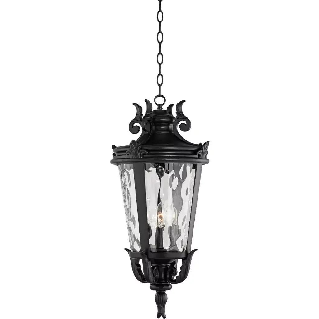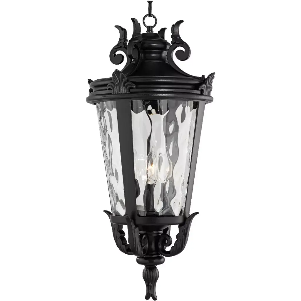 Named after the beautiful port city in France, this Casa Marseille outdoor hanging light features striking Mediterranean styling. It comes in a black finish die-cast metal frame decorated with elaborate scrolling and acanthus leaf details. Clear water glass adds a wavy, eye-catching effect. This light is damp location rated for use only in covered porches or patios, and is also great for indoor use.